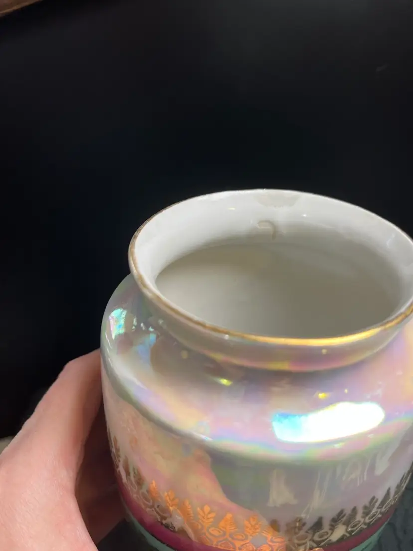 One area on inside towards rim that was missed by glazed. Couple flea bites that look like divets. Not chipped. 3.5" x 7.75" Approx 12 Oz