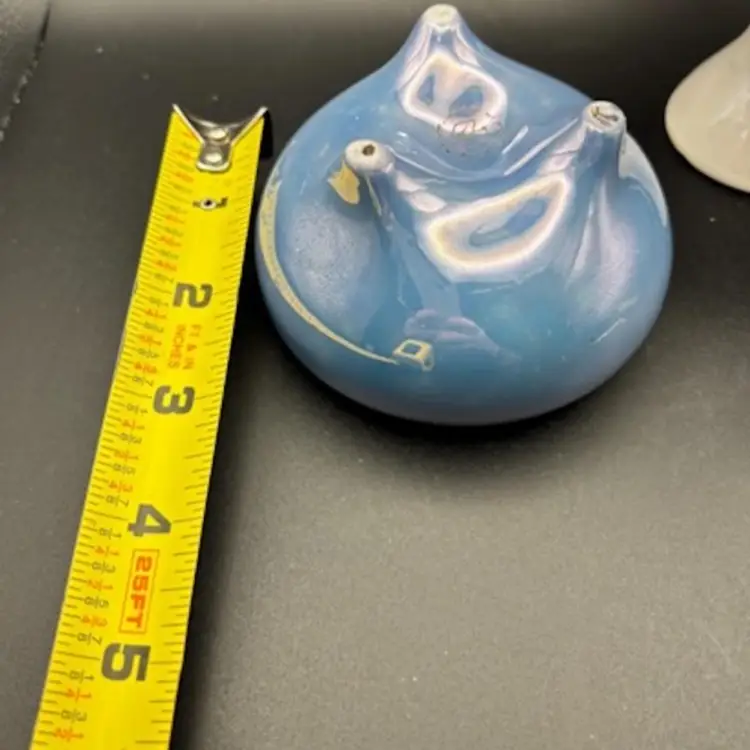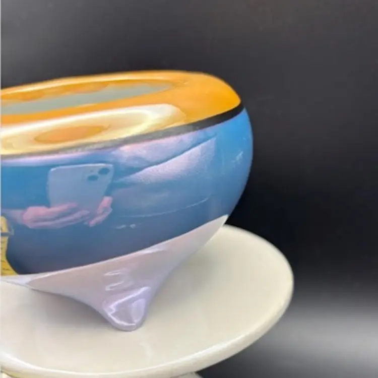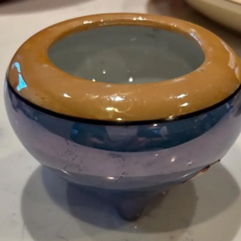 This highly reflective piece of lusterware was produced in Japan. It is a discontinued pattern. There are photos where pieces of the cup seem white, it's just a reflection. There are no apparent nicks or chips. I believe this is the "snack cup" but it would make a lovely trinket dish. It's three inches in diameter and a little over two inches tall.