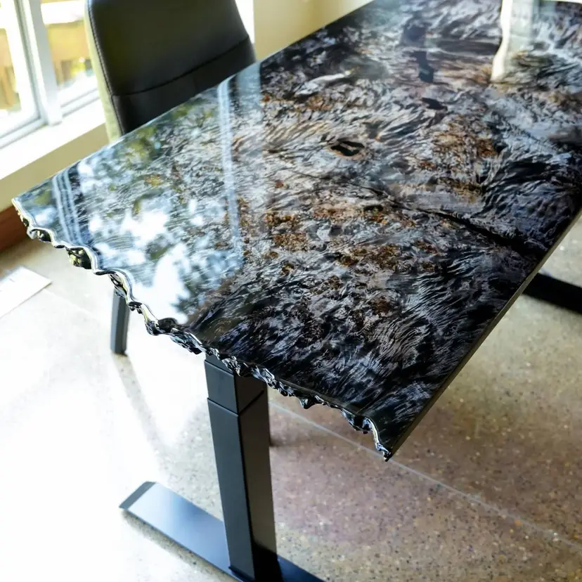 This desk was cut from a single slab of locally salvaged Mappa Burl. Unlike most live-edge tables, this desk features the live edge on the short sides. Meaning this tree was massive enough to merit cutting the slab unconventionally. The result is a nice straight edge to work against and/or to place against a wall. That doesn’t mean this desk is small, though. It is approximately 55” wide and 30” front to back.