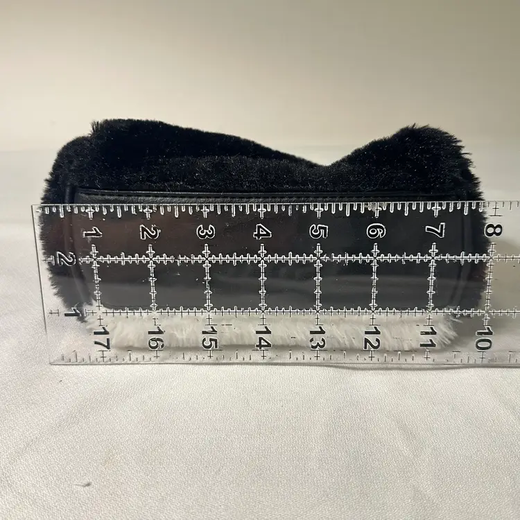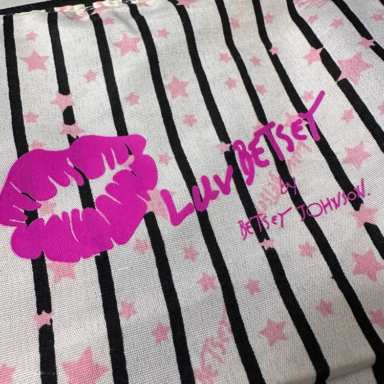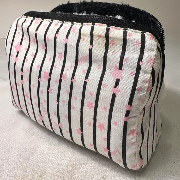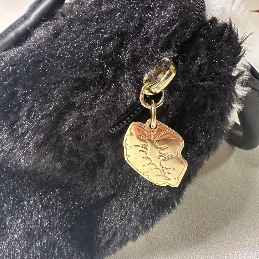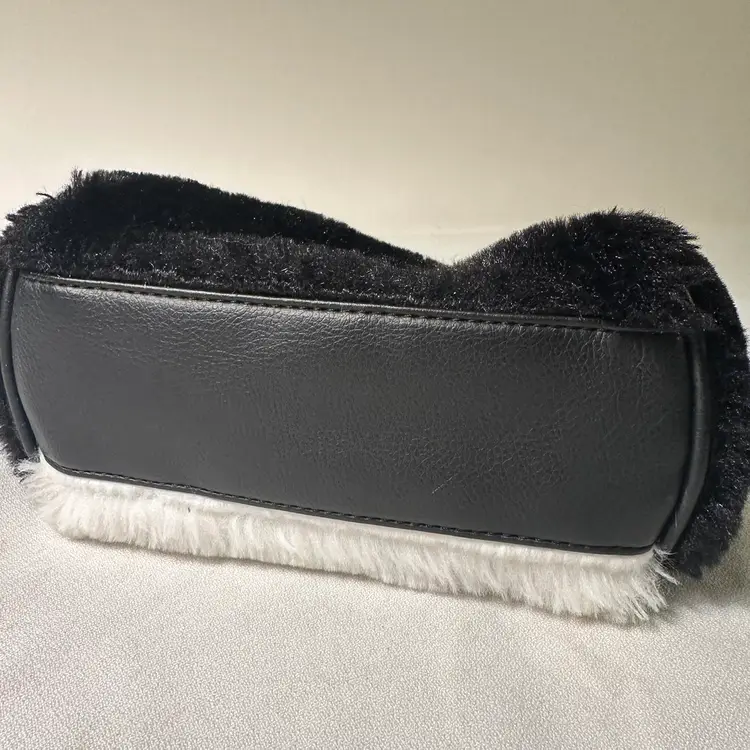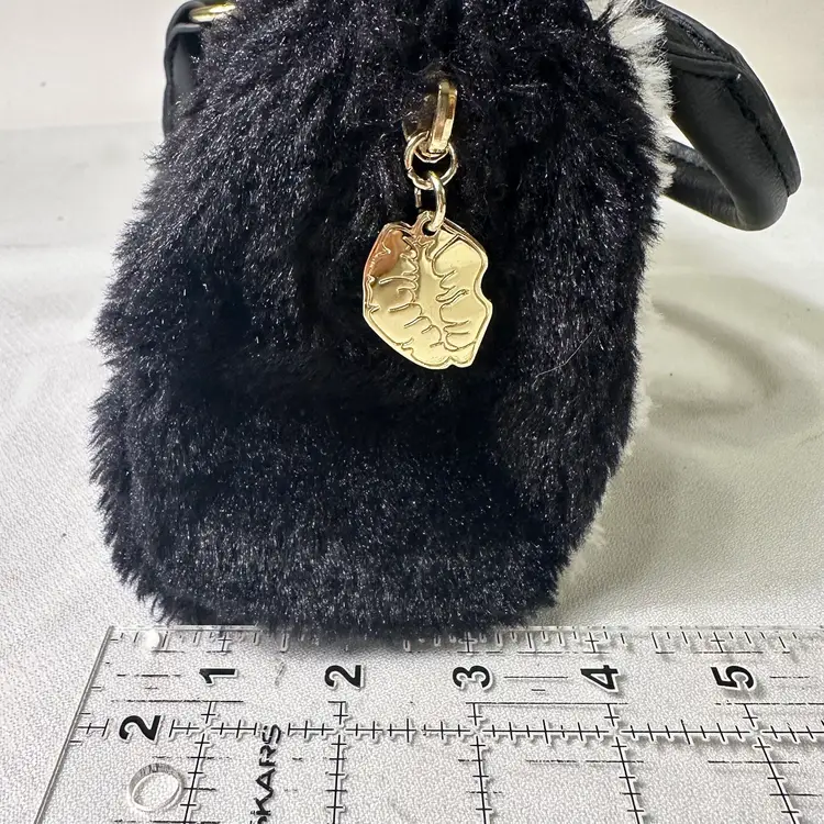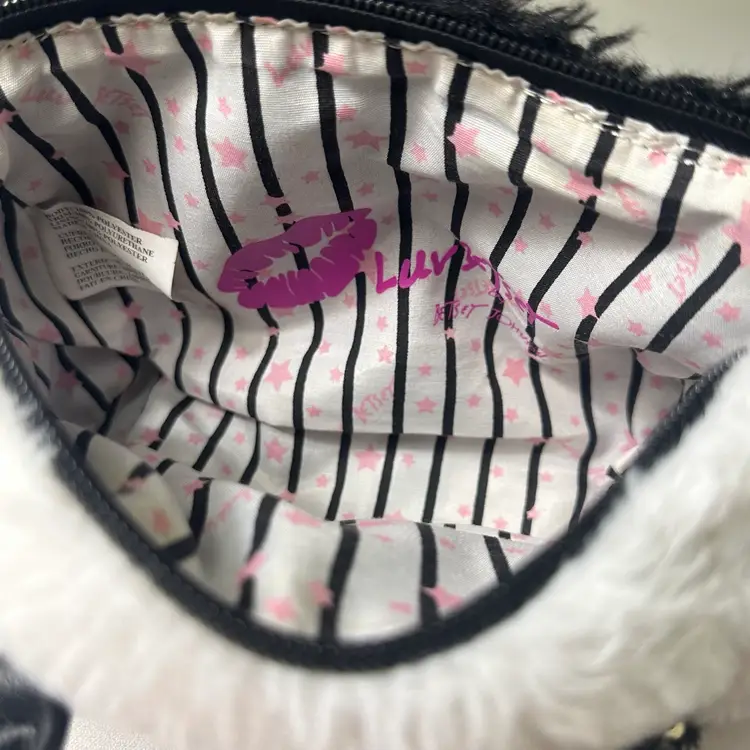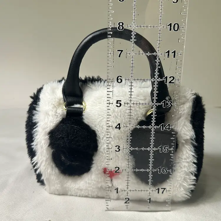 The Luv Betsey Johnson furry PANDA Mini Barrel Bag is a stylish and playful tote bag featuring a black and white exterior with a fluffy finish, adorned with a cute Panda face pattern. The mini size and cylinder shape make it perfect for casual occasions, with a zip closure and black double handles adding to its functionality and convenience. Made from faux fur and polyester, this Betsey Johnson handbag is lined with a fun black stipe with pink stars fabric and her logo and is a part of the Luv Betsey product line, embodying a fun and whimsical animal-themed design.