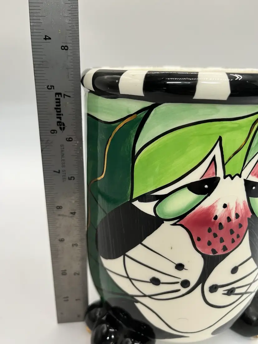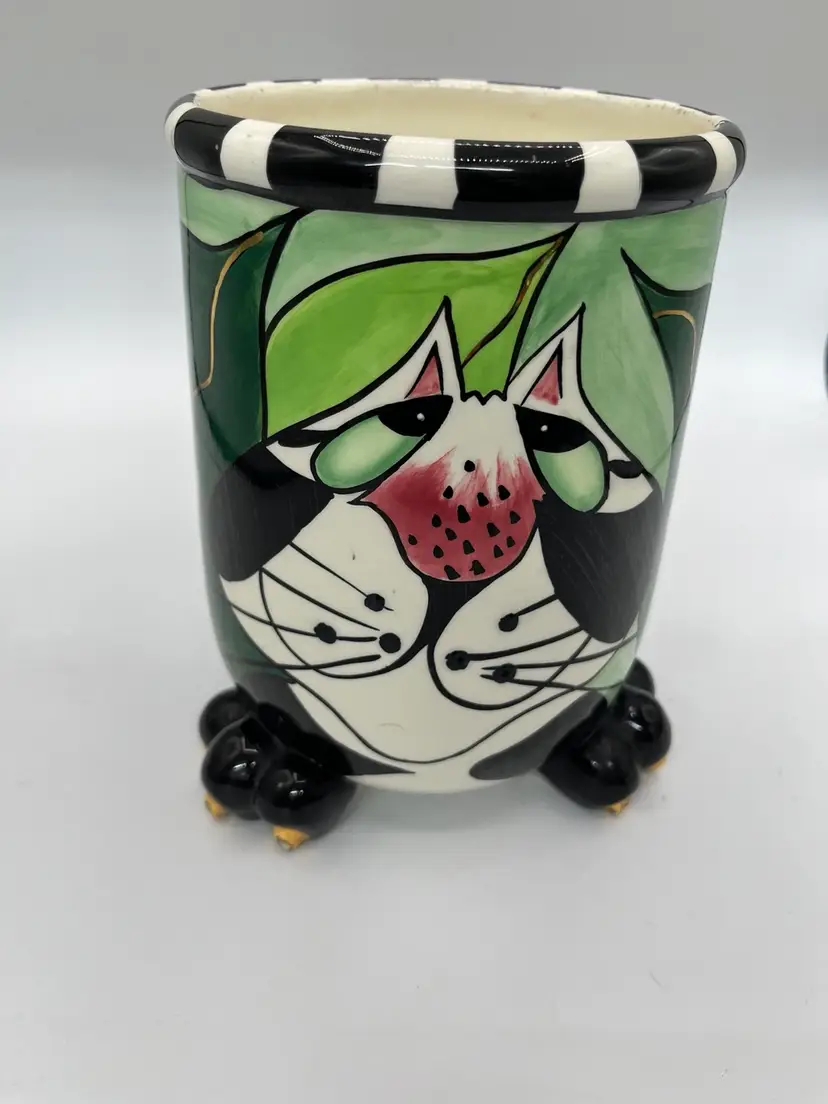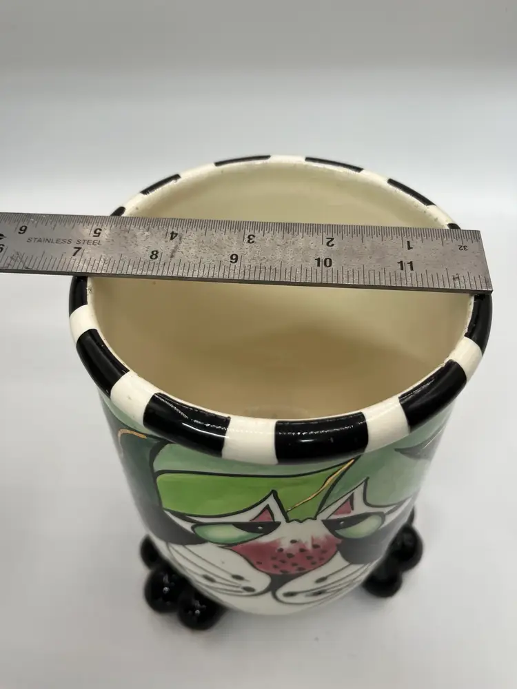 This is a fun whimsical cat planter-vase-utensil holder etc in great condition, has a few marks on the inside that is in the glaze…
