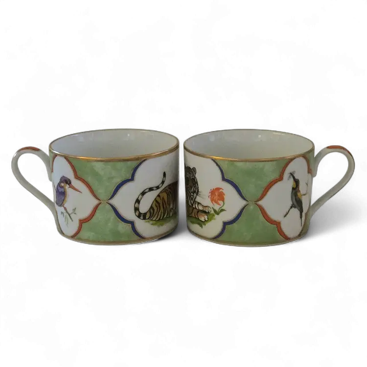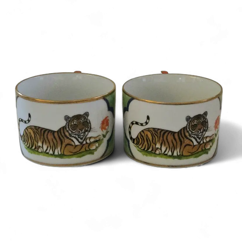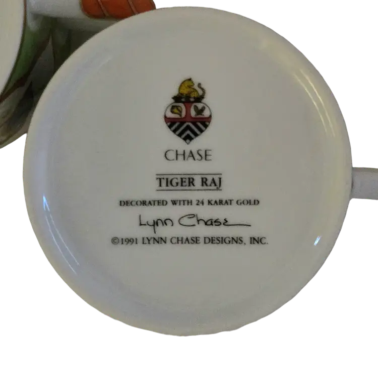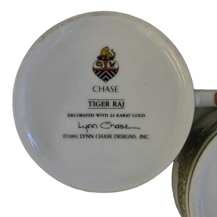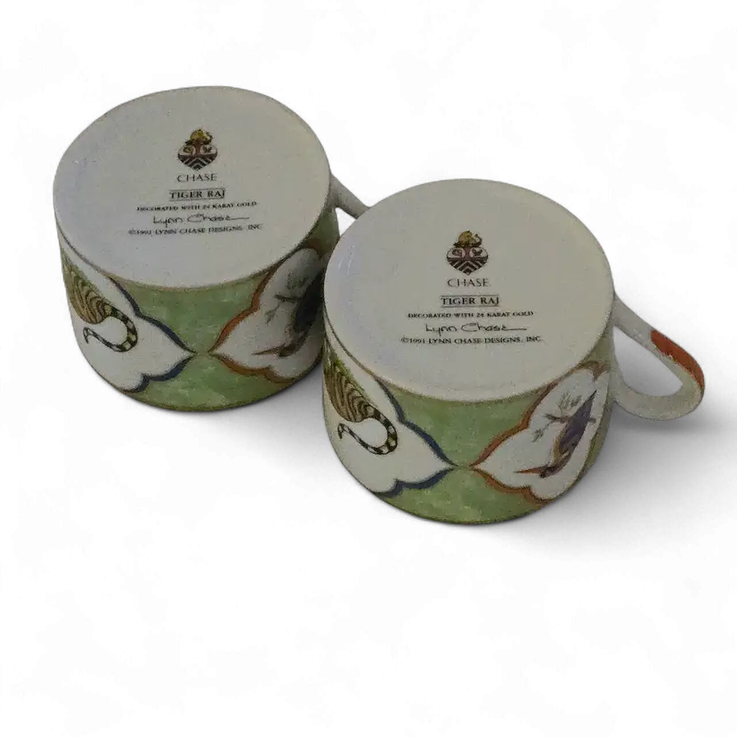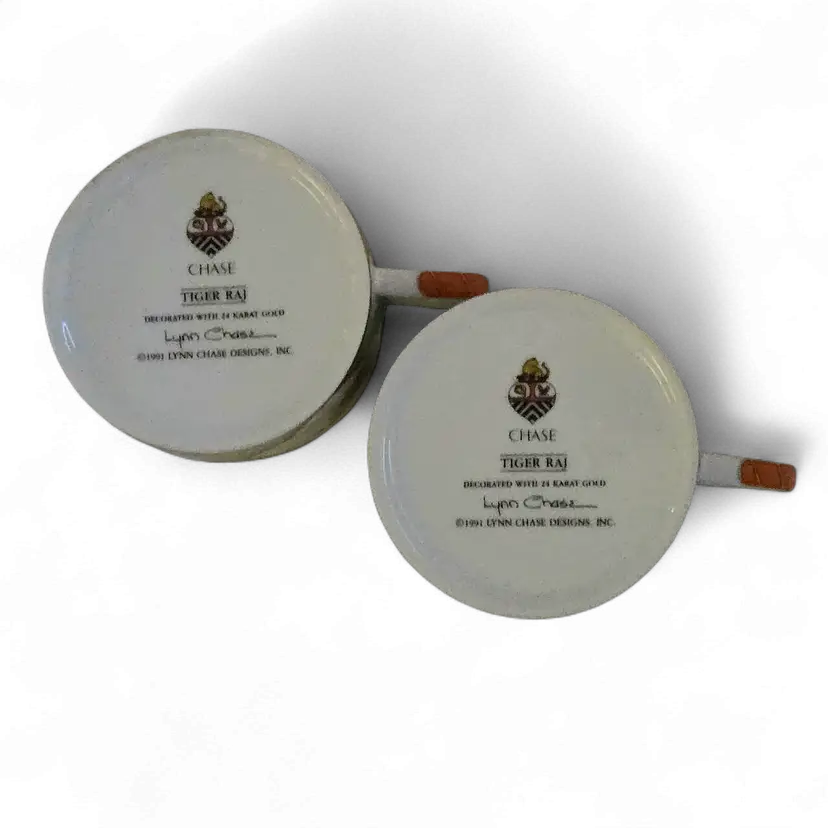 Lynn Chase Tiger Raj Coffee Cups 2¼" Tall × 3⅜" Diameter Set of 2 Signed in Glaze. Used with no signs of use, does have some fingerprints from handling, dirt in bottom. Please view all the photos and please ask any questions prior to purchase when possible.