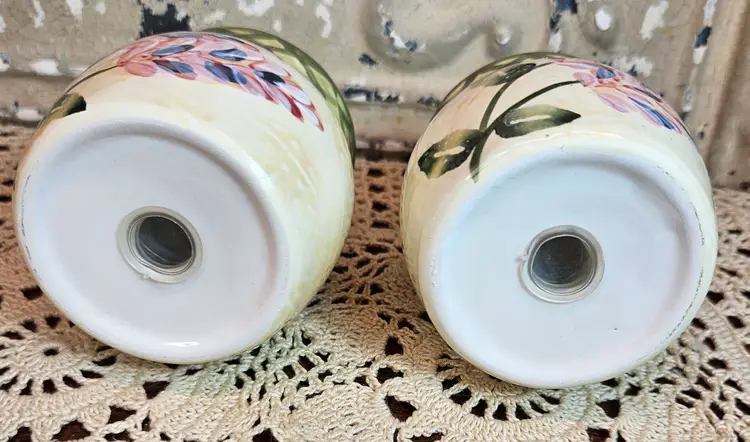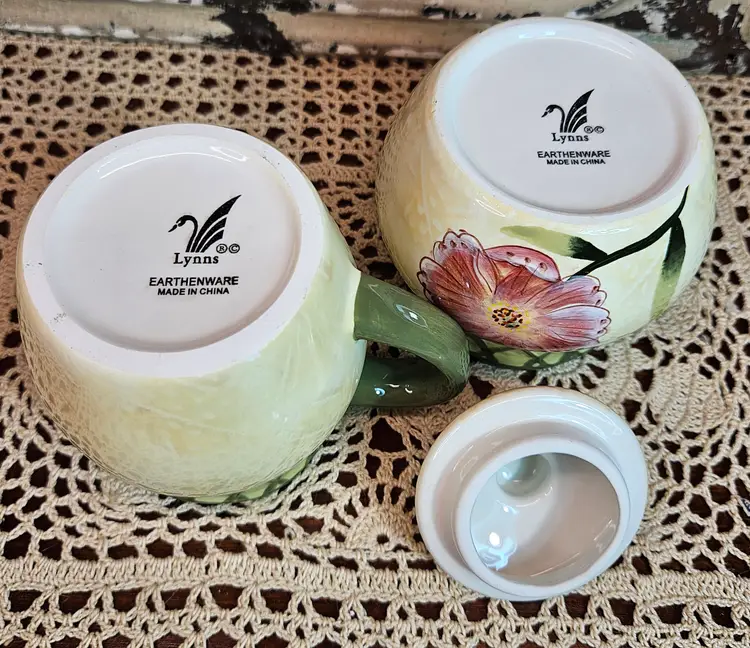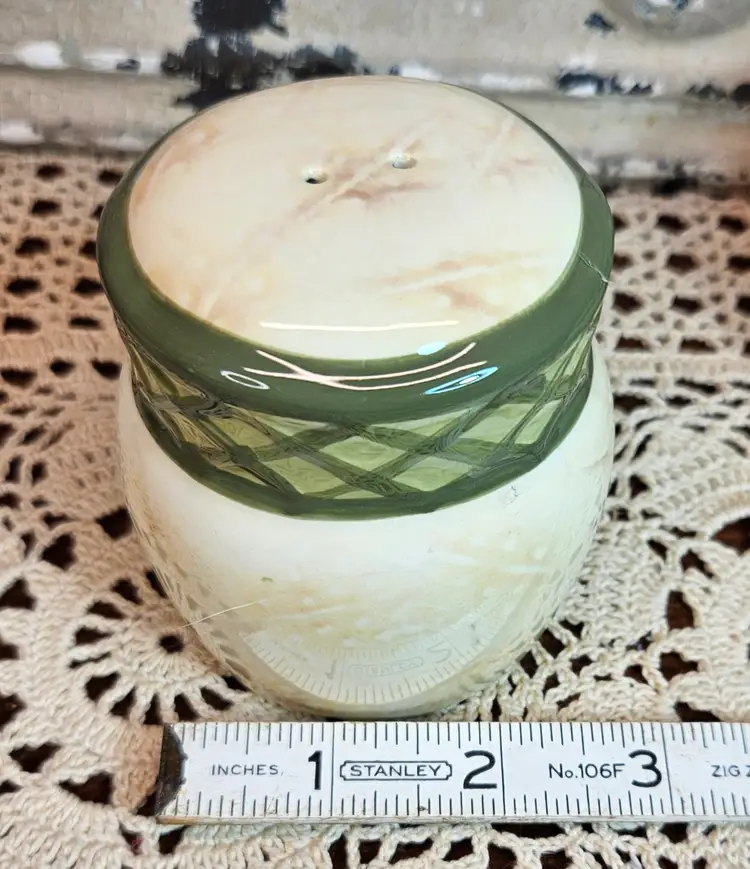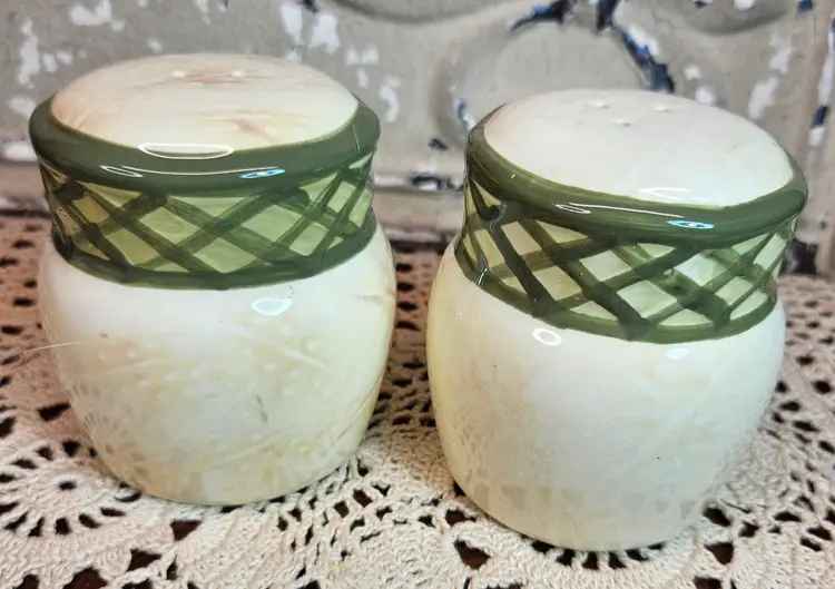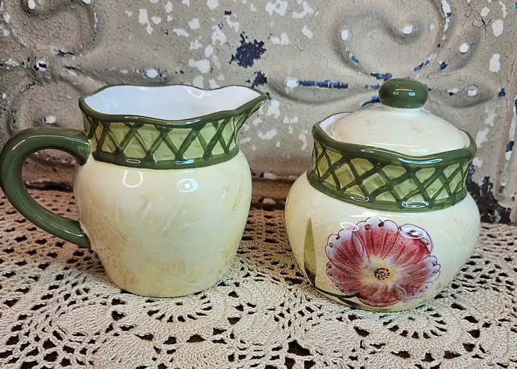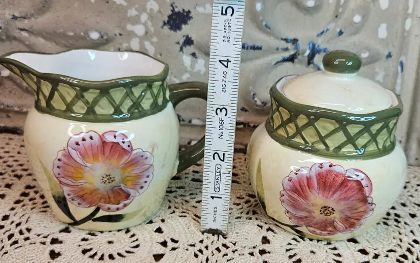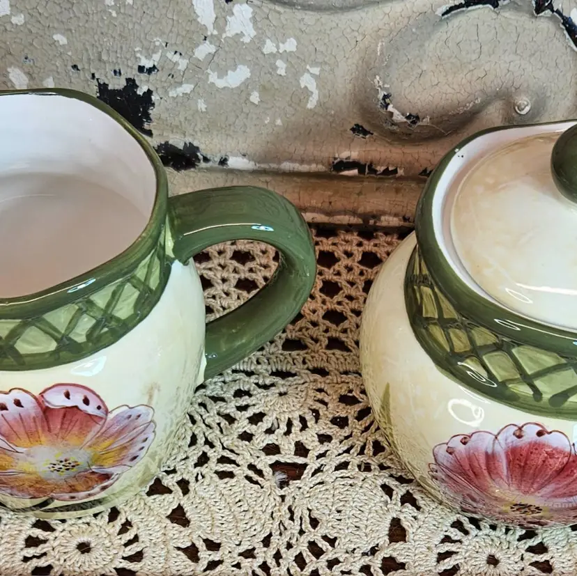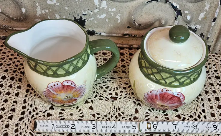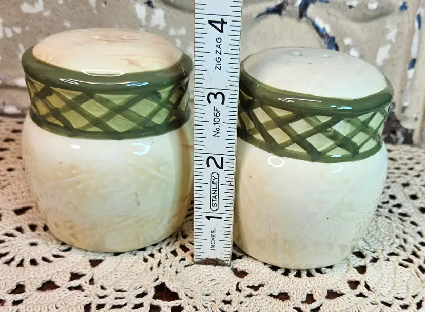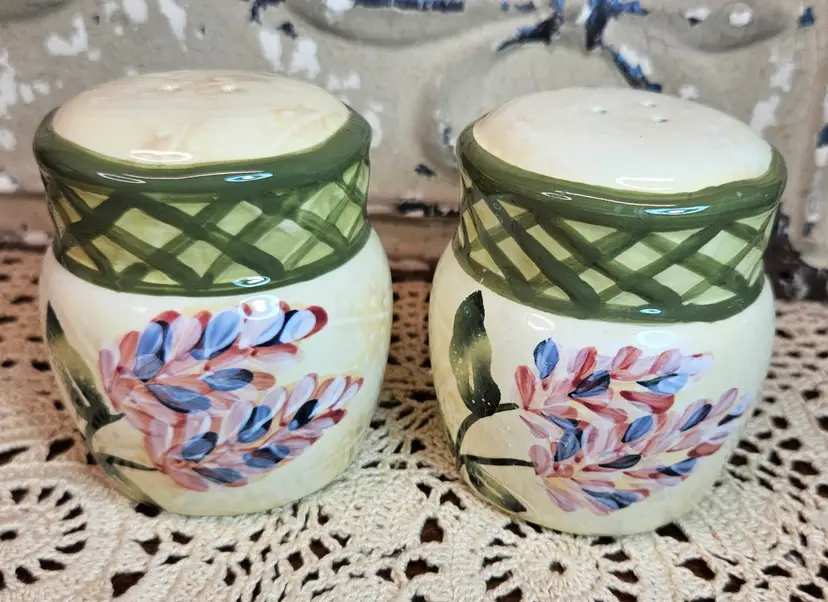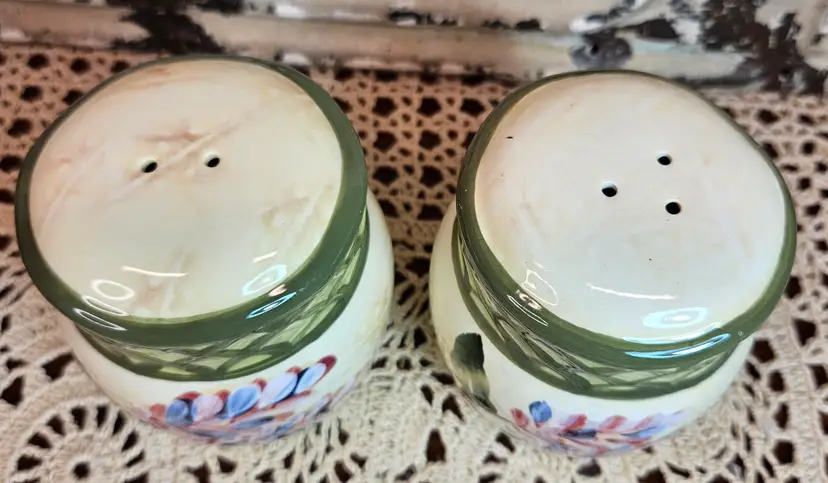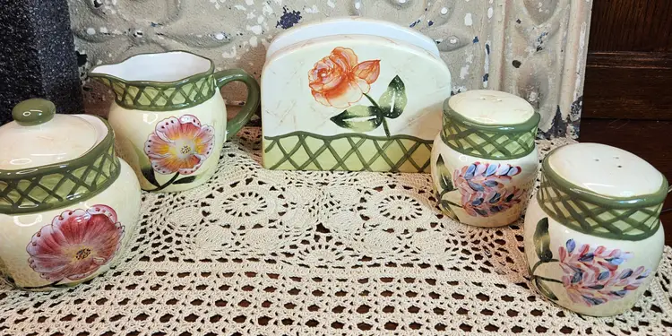 This charming table set is in excellent, used condition, with no appreciable chips, scratches or cracks. Measurements are depicted in the pictures of the item or listed in the description of the item. Please review the photos, as they are part of the item description. Please note that any props used in the photos are not included in the purchase, unless otherwise indicated. Both shakers come with their plastic stoppers and the creamer with its lid.