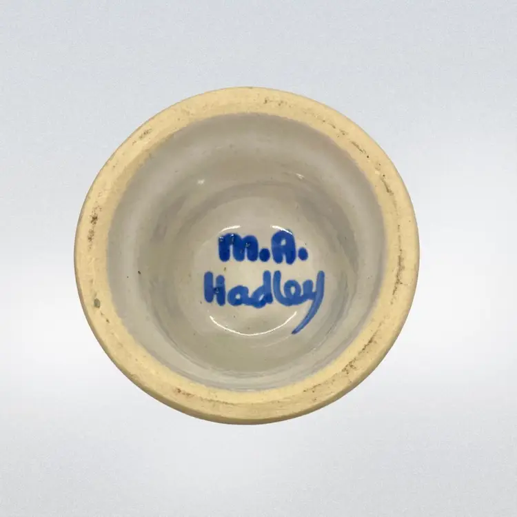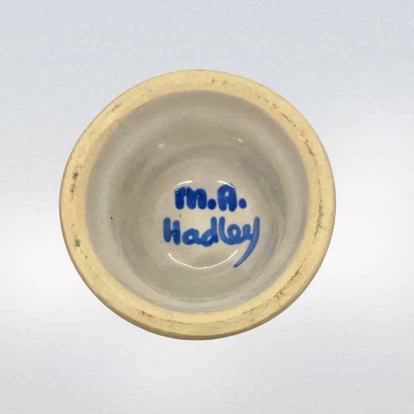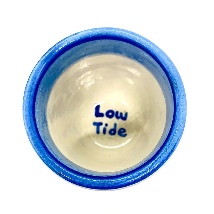 M A Hadley egg cup with a sailing ship. “Low Tide” is written in the bottom of the cup and is inscribed M A Hadley underneath. It is 4” high and 3” wide at the top. It is rather large for an egg cup and could also be used as a beverage cup for a small bit of tea, or as a vase for tiny flowers.