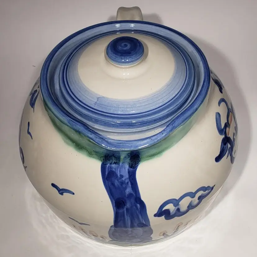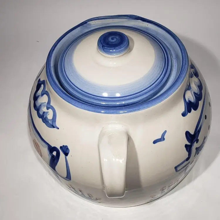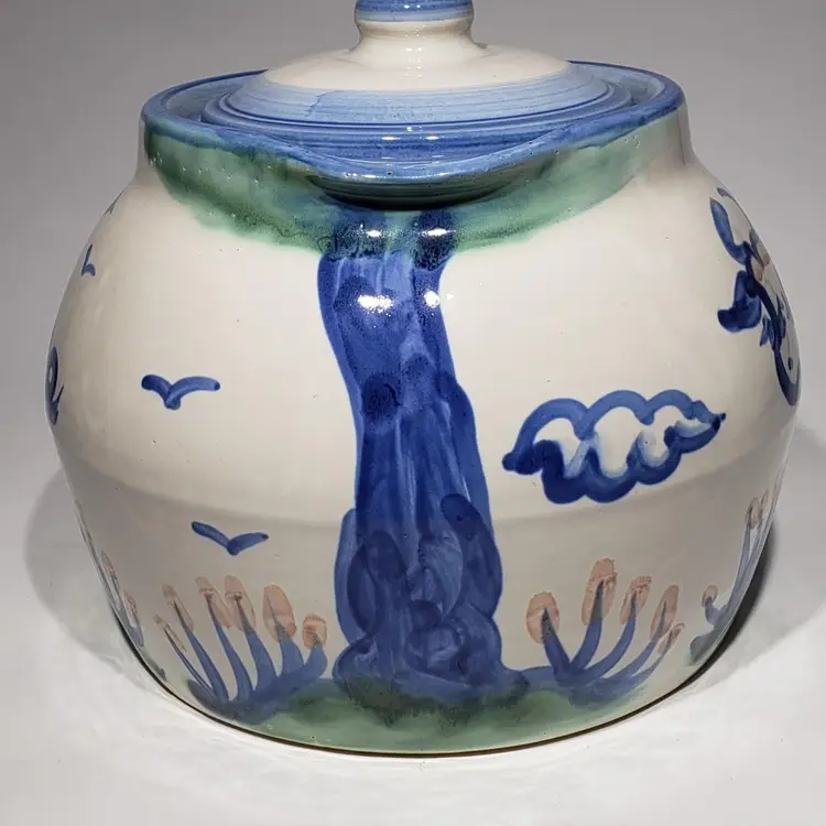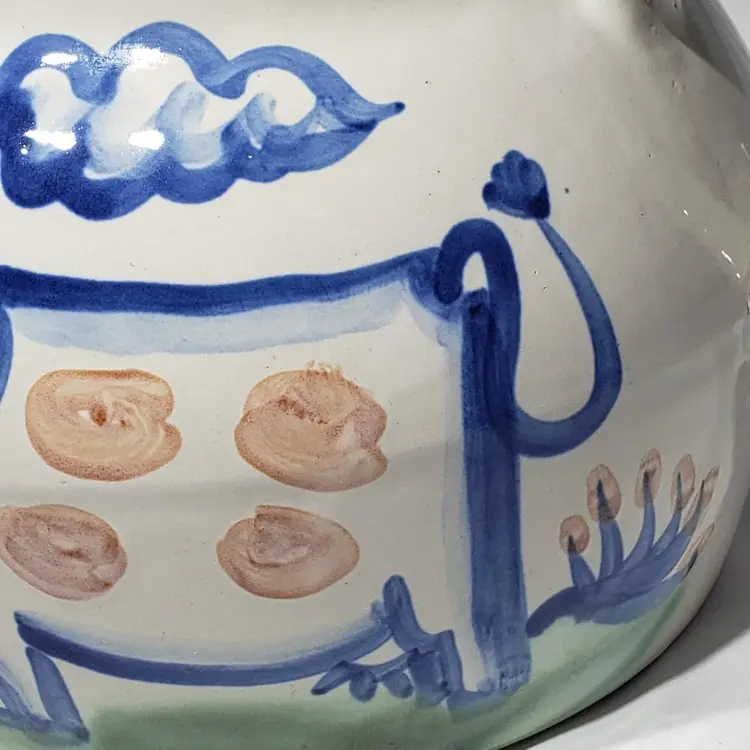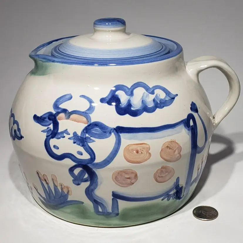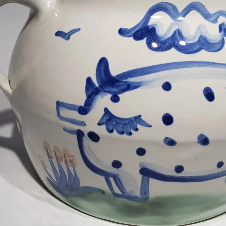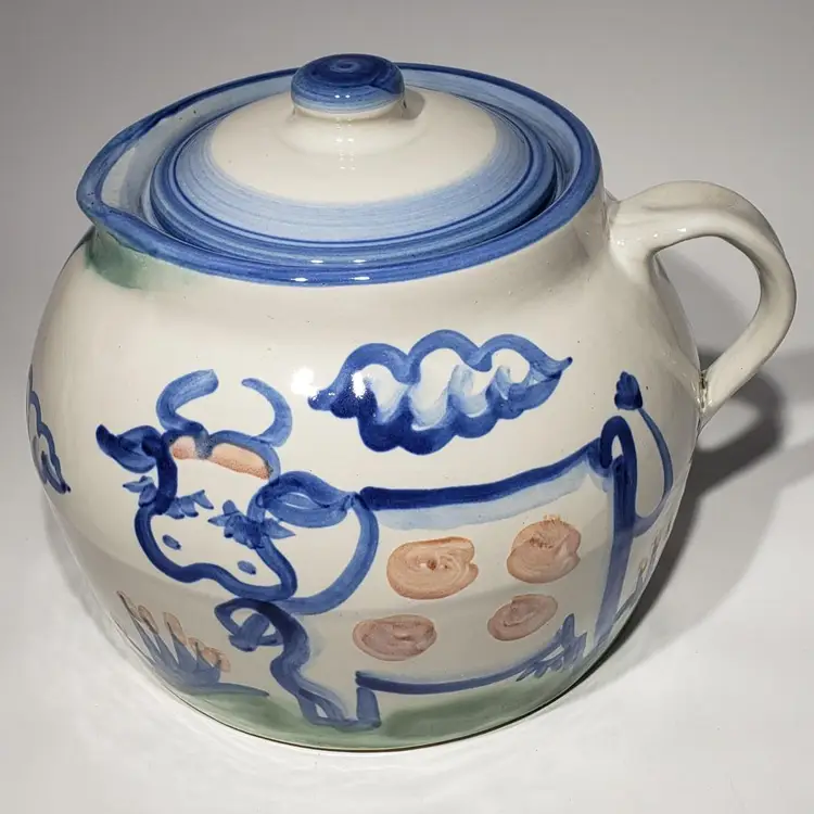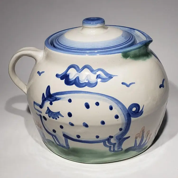 M A Hadley Pottery Bean Pot Round Lidded Cookie Jar Cow Pig Blue Single Handle with Spout Discontinued "The End" Painted on inside on bottom. Hand Painted Artist Signed: M A Hadley Measures: 9" x 8.5" x7" Pre-owned. No chips or cracks. Utensil marks inside. See Photos.