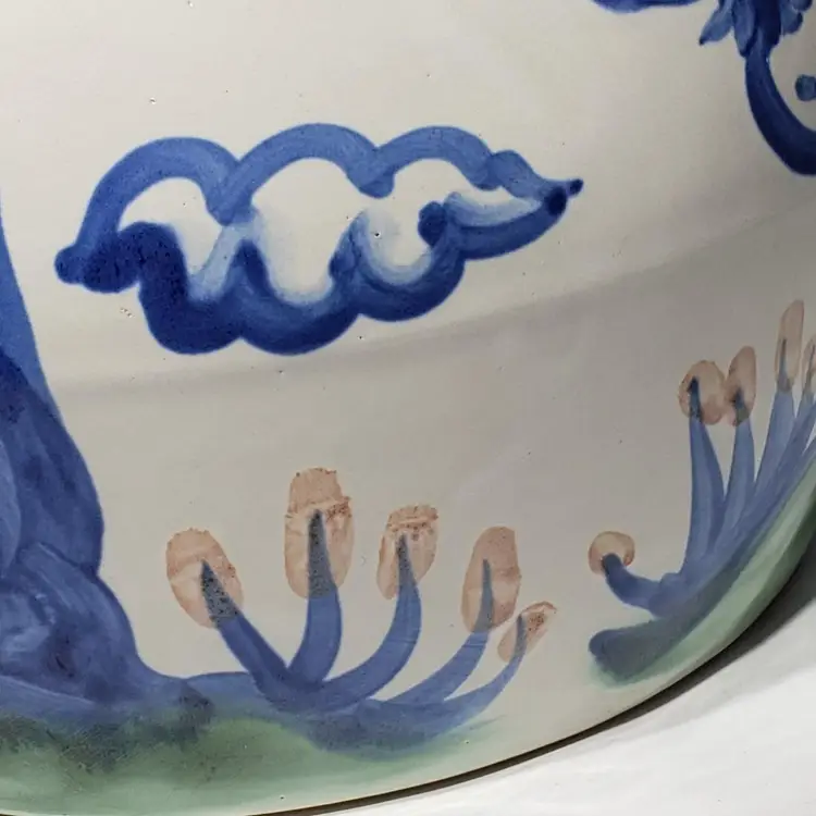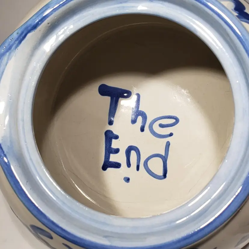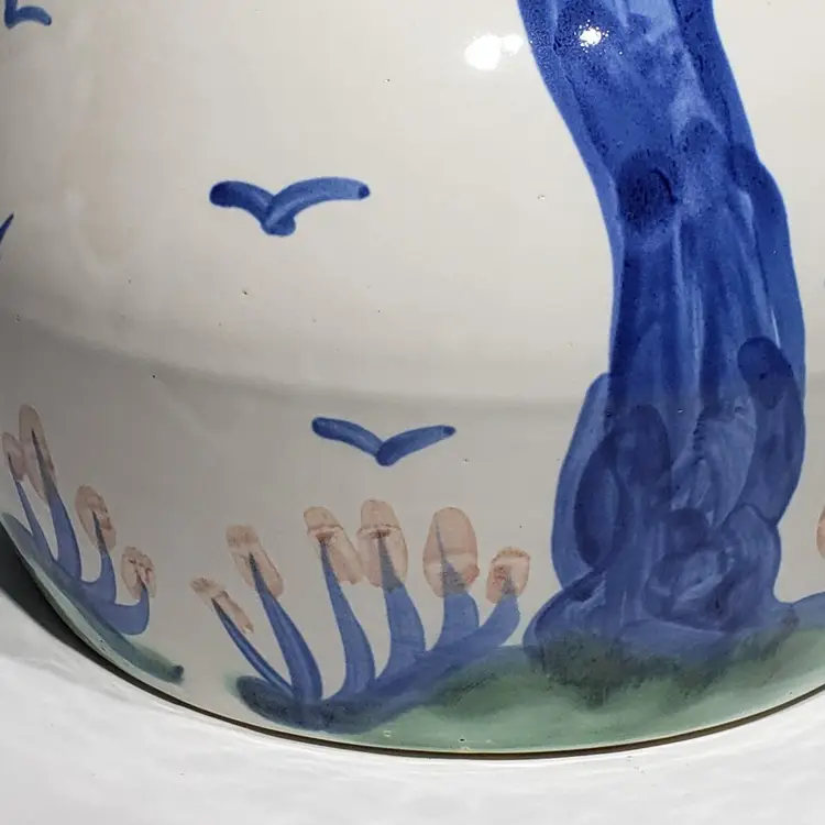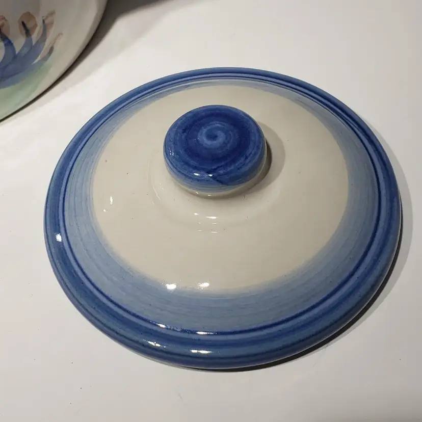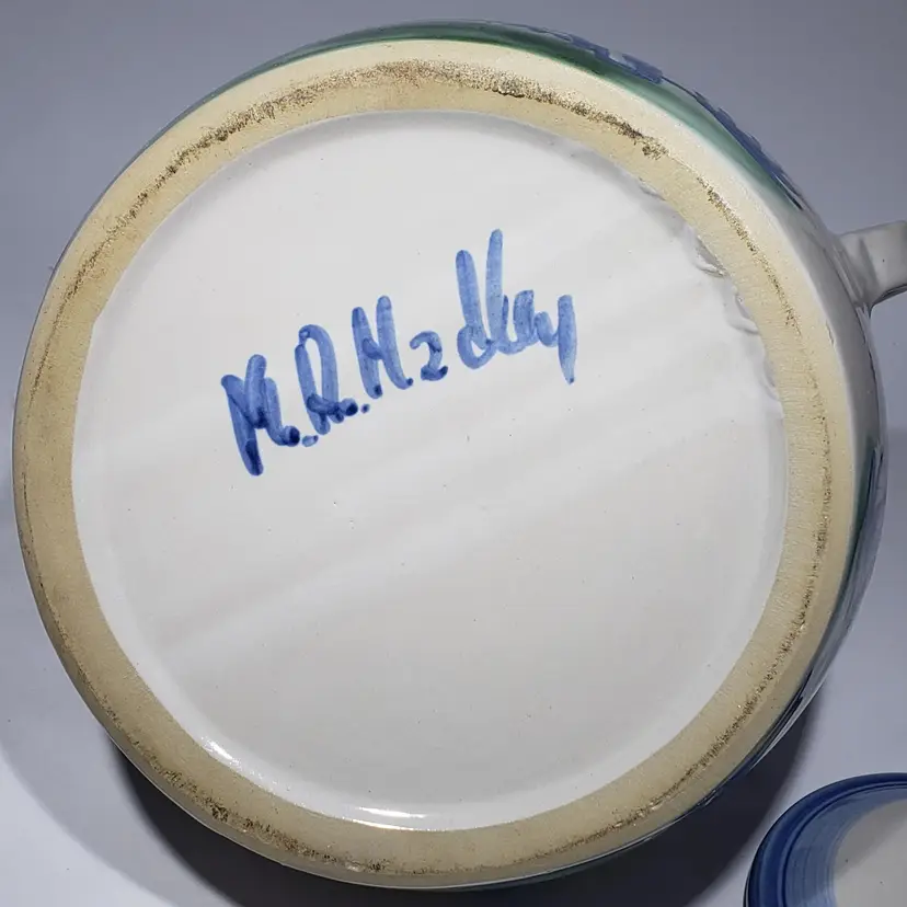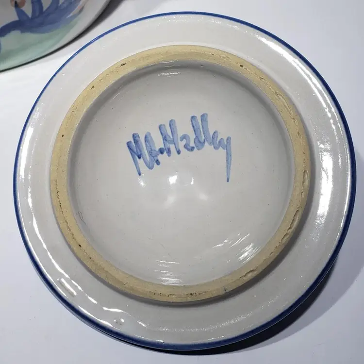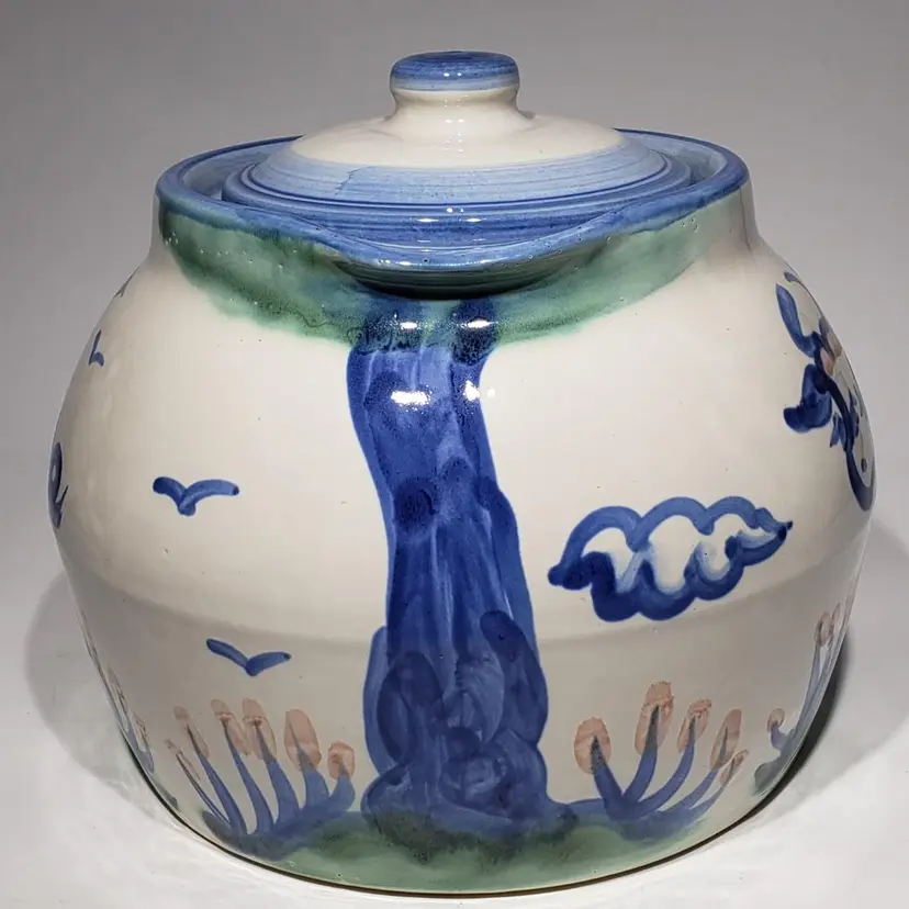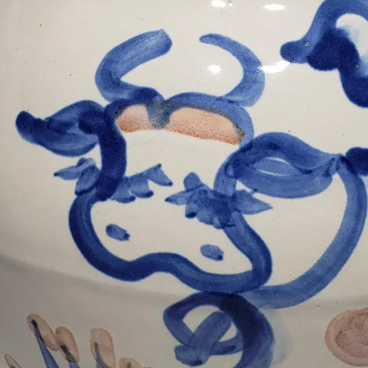 M A Hadley Pottery Bean Pot Round Lidded Cookie Jar Cow Pig Blue Single Handle with Spout Discontinued "The End" Painted on inside on bottom. Hand Painted Artist Signed: M A Hadley Measures: 9" x 8.5" x7" Pre-owned. No chips or cracks. Utensil marks inside. See Photos.
