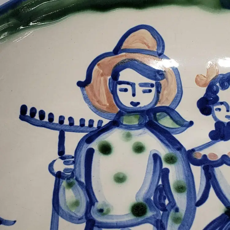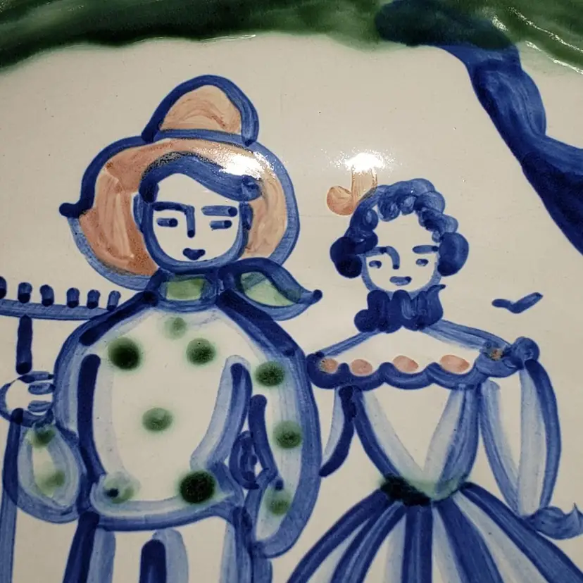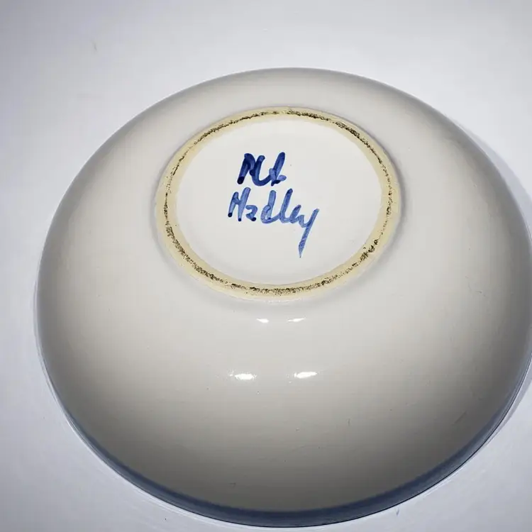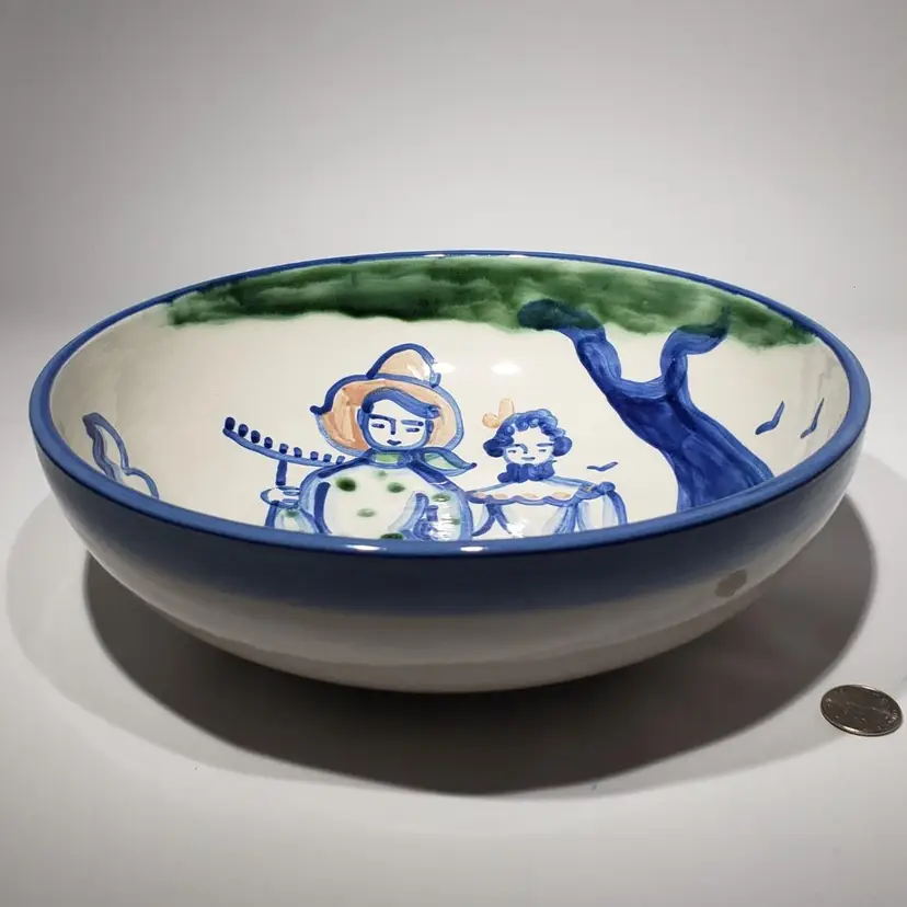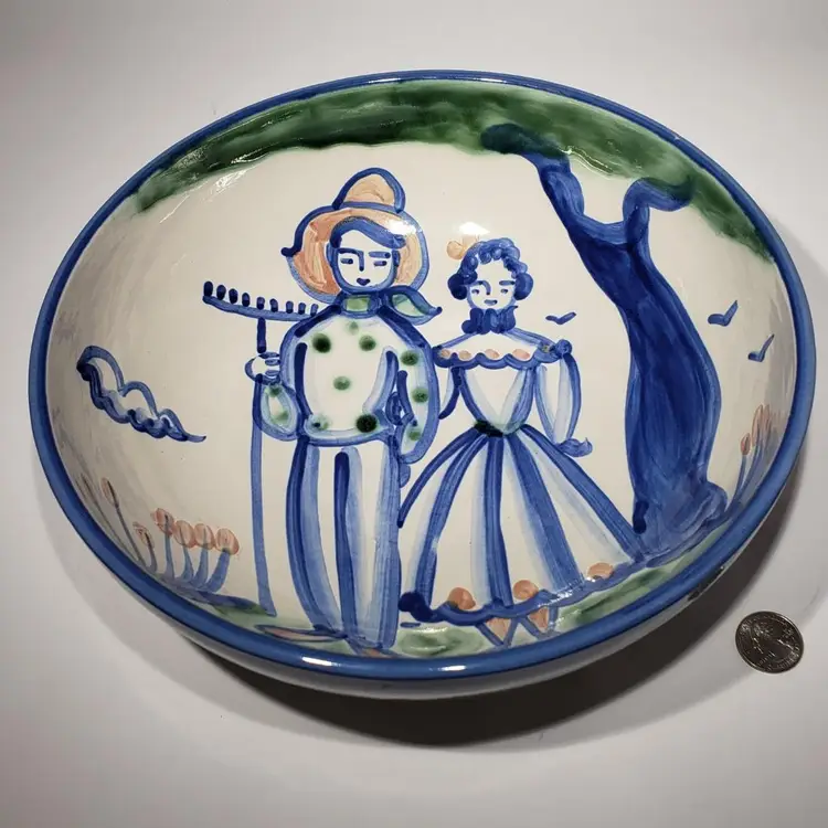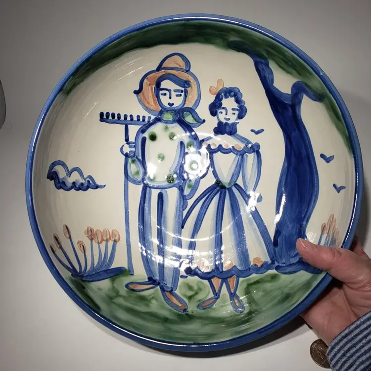 M A Hadley Pottery Farmer and Wife Country Scene 11" Large Pasta Serving Bowl Discontinued Hand Painted Artist Signed: M A Hadley Measures: 11" x 11" x 3.25" Pre-owned, but like new. No chips or cracks.