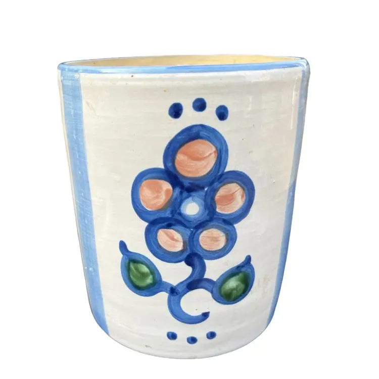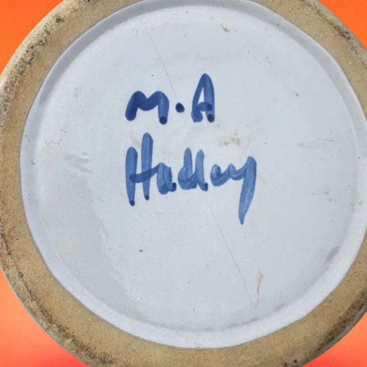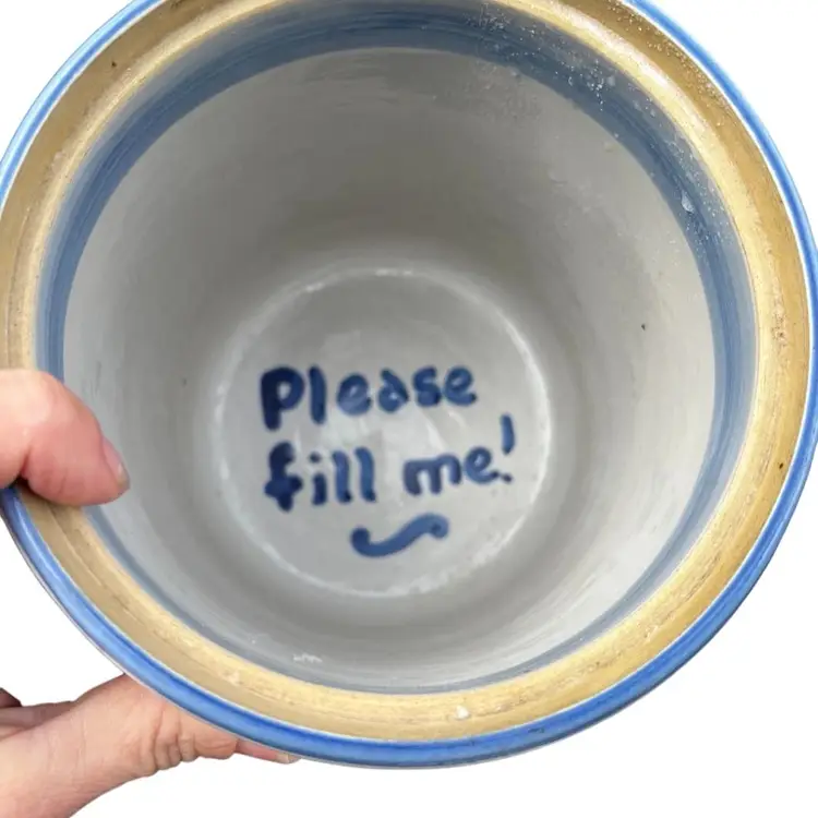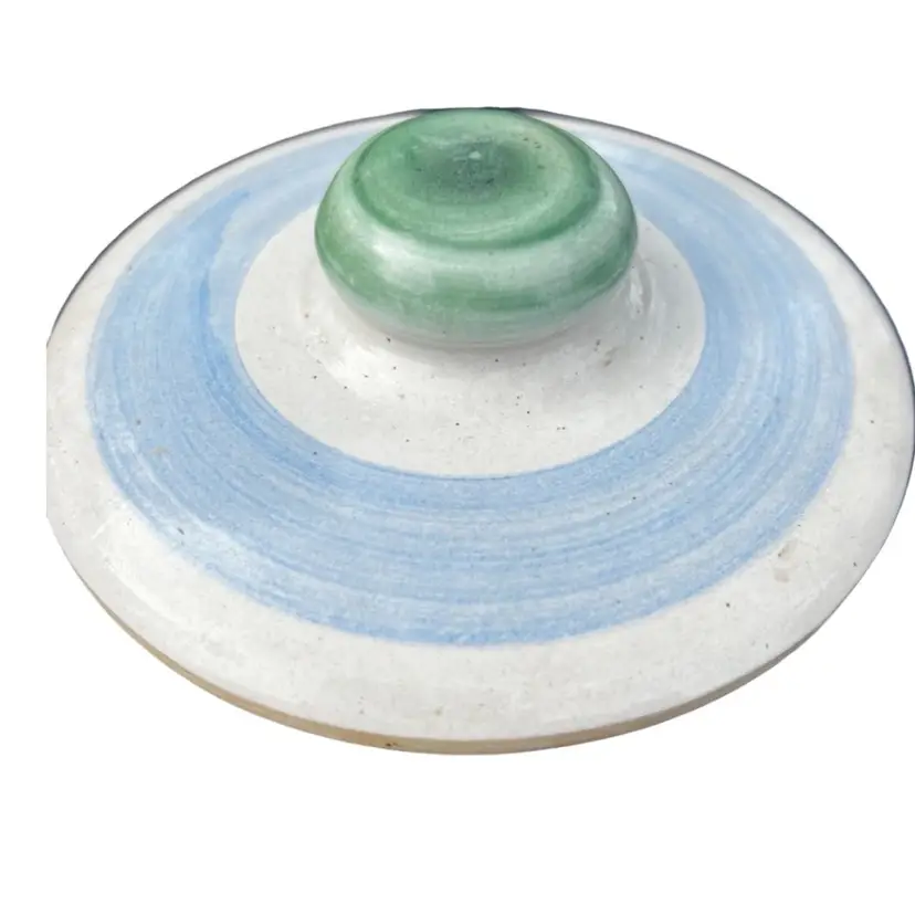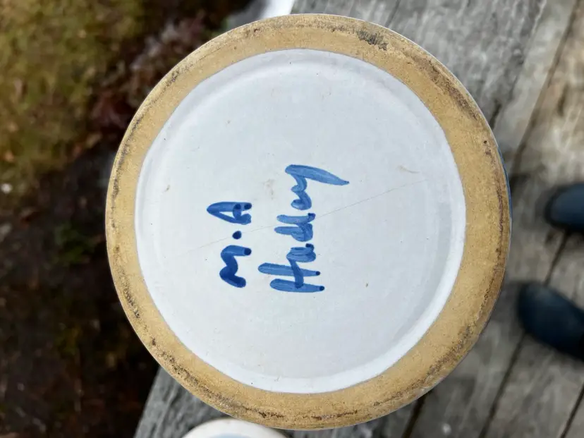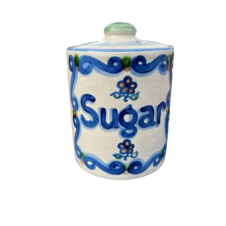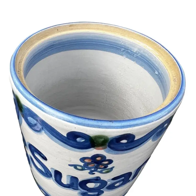 Approximately 8 1/2” tall with lid Bluette Pattern Lid has a small chip on the inside Canister has crazing on the inside and a hairline crack. This is a great display piece for a collector. See photos