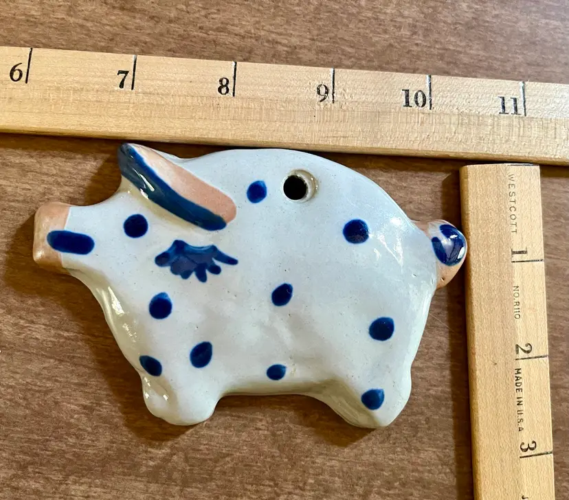 Measuring approximately 3.5" in length, 2.5" in width, and 1/4" in height, this small ornament is perfect for any occasion, whether it be for Christmas, a gift tag that continues to be of use - such as year-round wall art. The item weighs 2.3 ounces and is an original piece from the M.A. Hadley product line. It makes a great gift tag or ornament for any farm animal lover. Country or rural cottagecore.