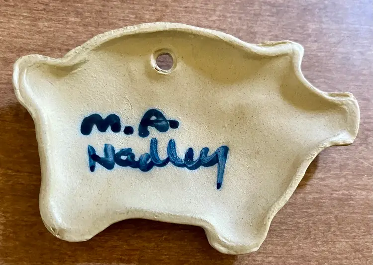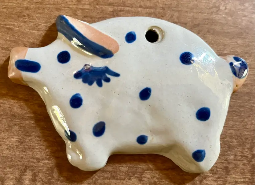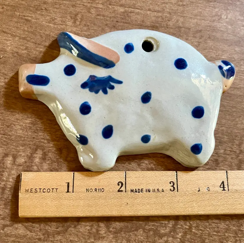 This unique Christmas tree ornament is a wonderful addition to any collection. Crafted by M.A. Hadley, this stoneware pig features a charming country rural feel (can you hear the Oinks?) with blue dots accents on a salt glaze background. The ornament is handmade and signed, and comes with a hole to hang with twine or ribbon or raffia.