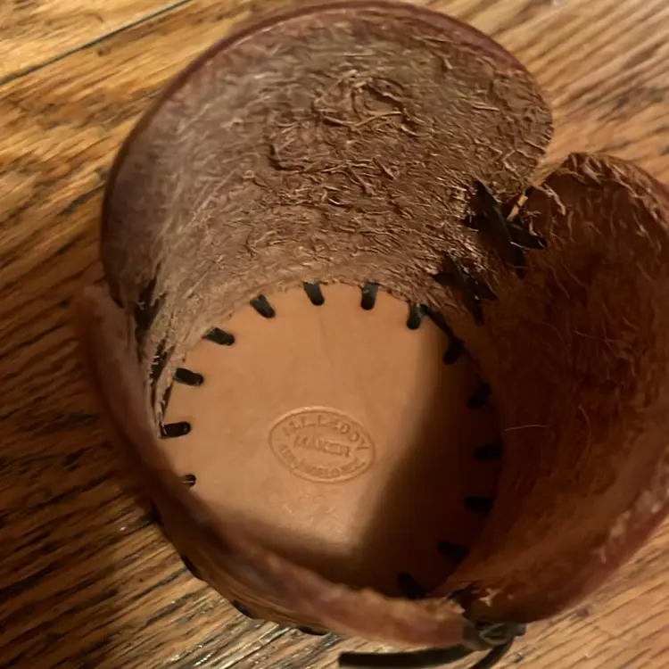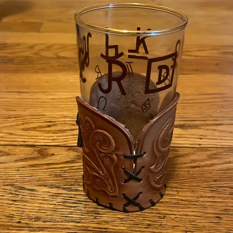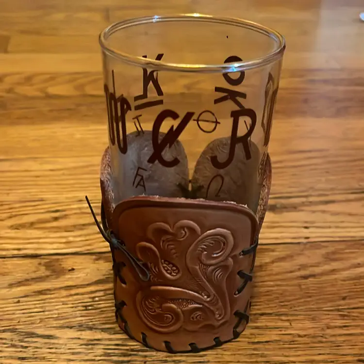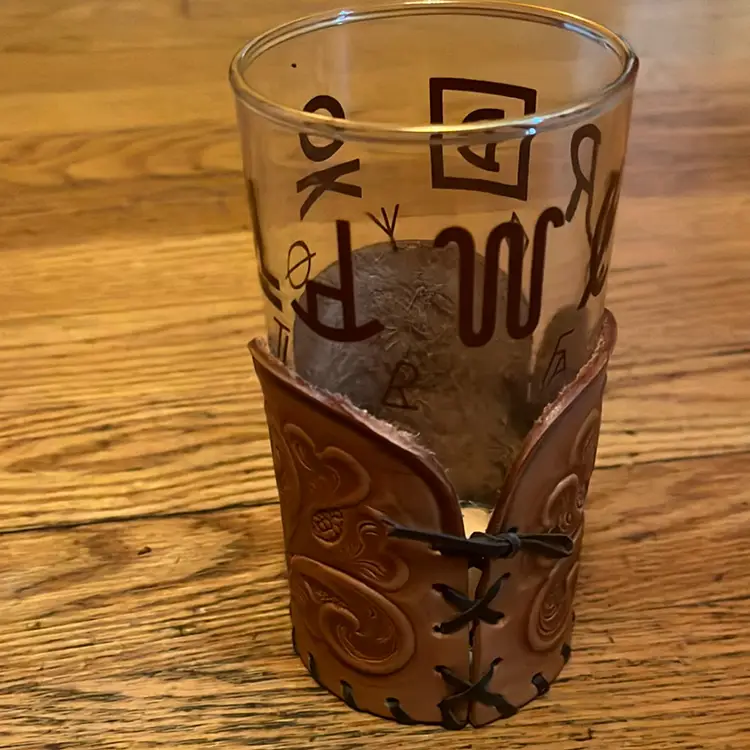 . ML Leddy San-Angelo TX leather wrap highball glass. Holds 12oz. Great condition