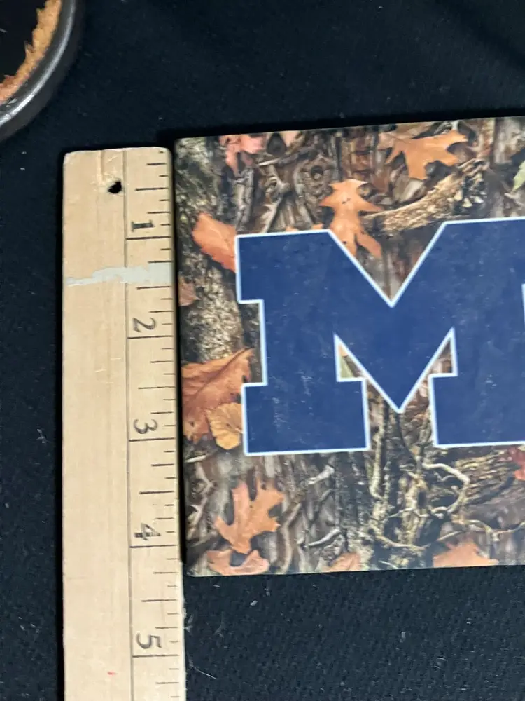 Letter tile / coaster - “M” initial or Logo - dark blue on multicolor background - 4.5” x 4.5” cork backing protects surfaces- very good condition