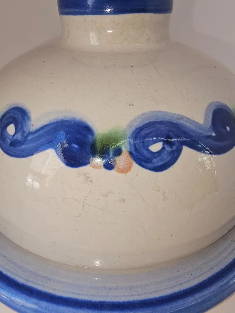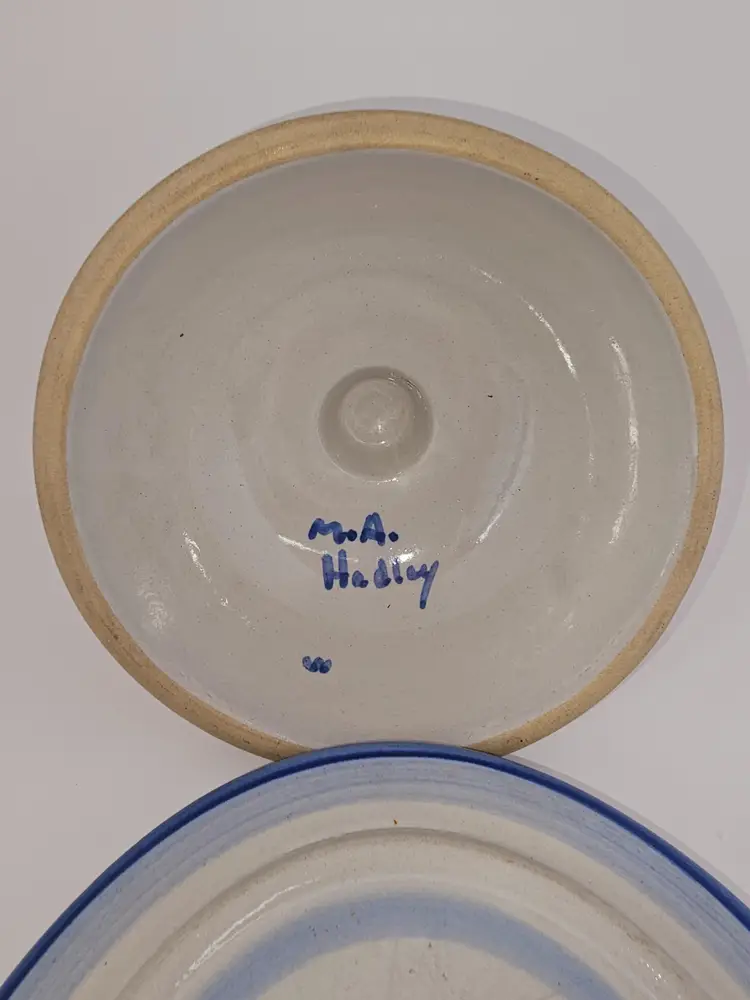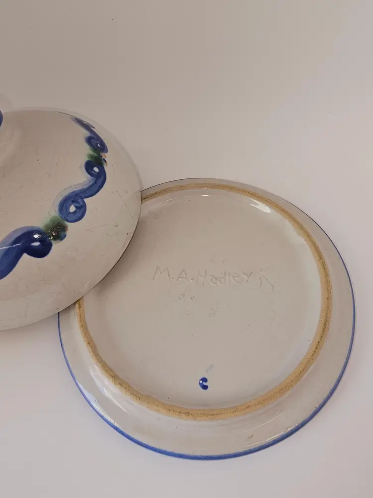 MA Hadley covered butter/cheese dish is in good condition. There are no chips or cracks. There are some surface scratches. 6"W x 4"T