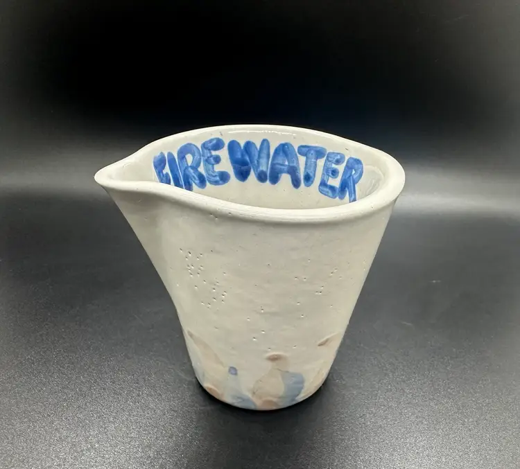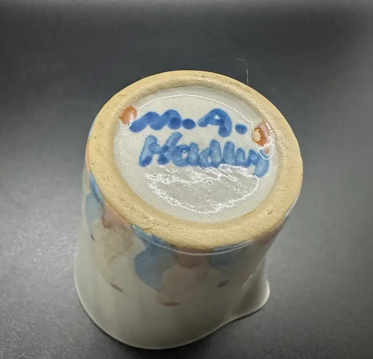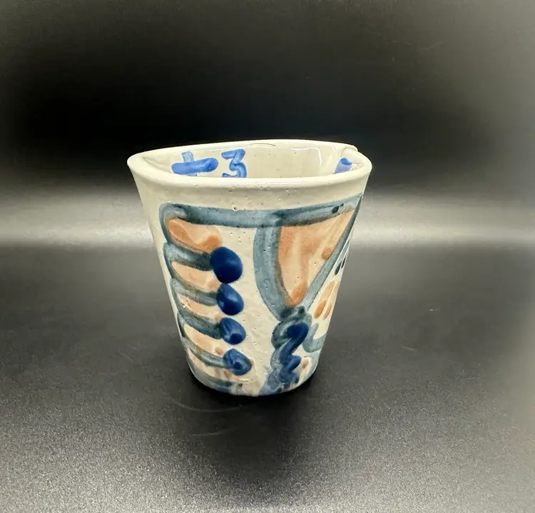 M.A. Hadley Jigger Measuring Cup Firewater Native American Chief Hand Painted Pottery. 3 inches tall. There is a scratch next to the 3 that feels like it’s under the glaze. See pictures for details. Other than that there are no condition issues.