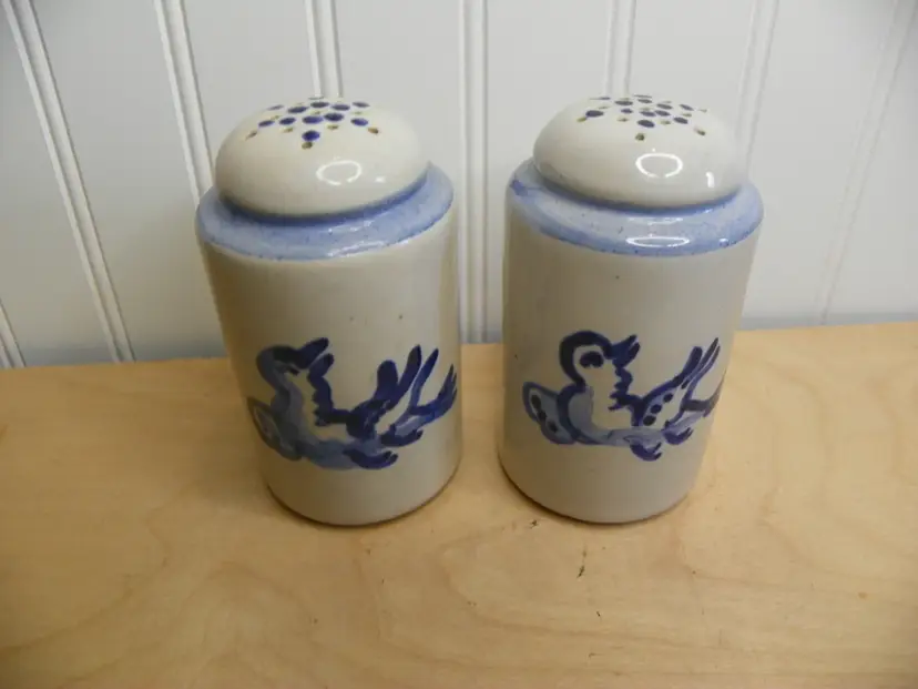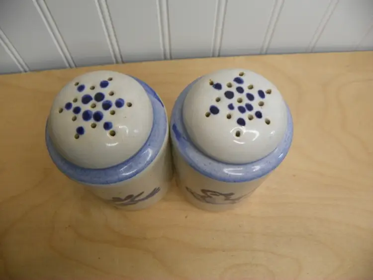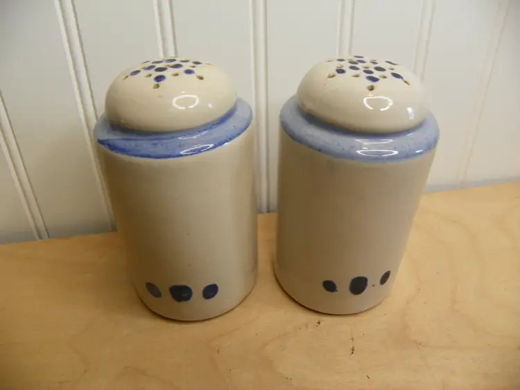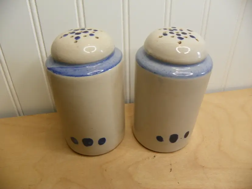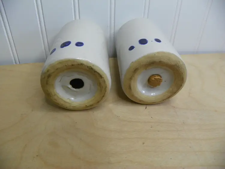 Ceramic blue and white salt and pepper shakers. These are large and could be used for sugar shakers as well.