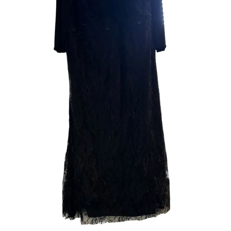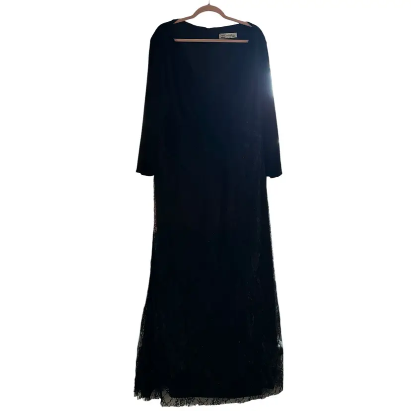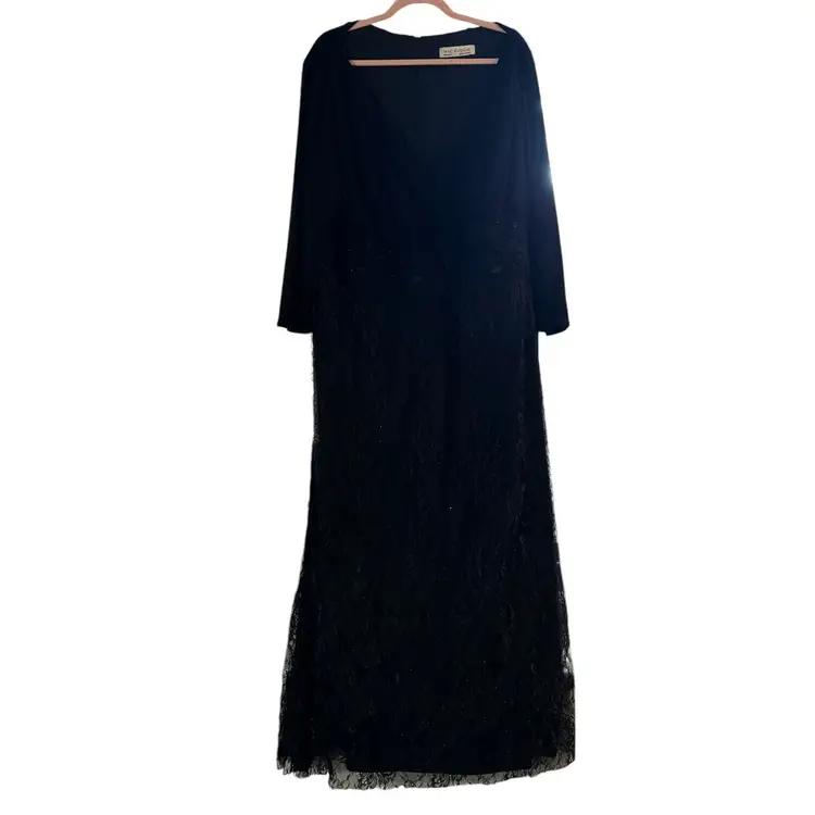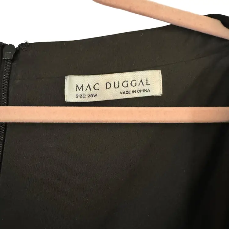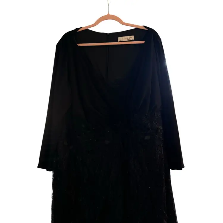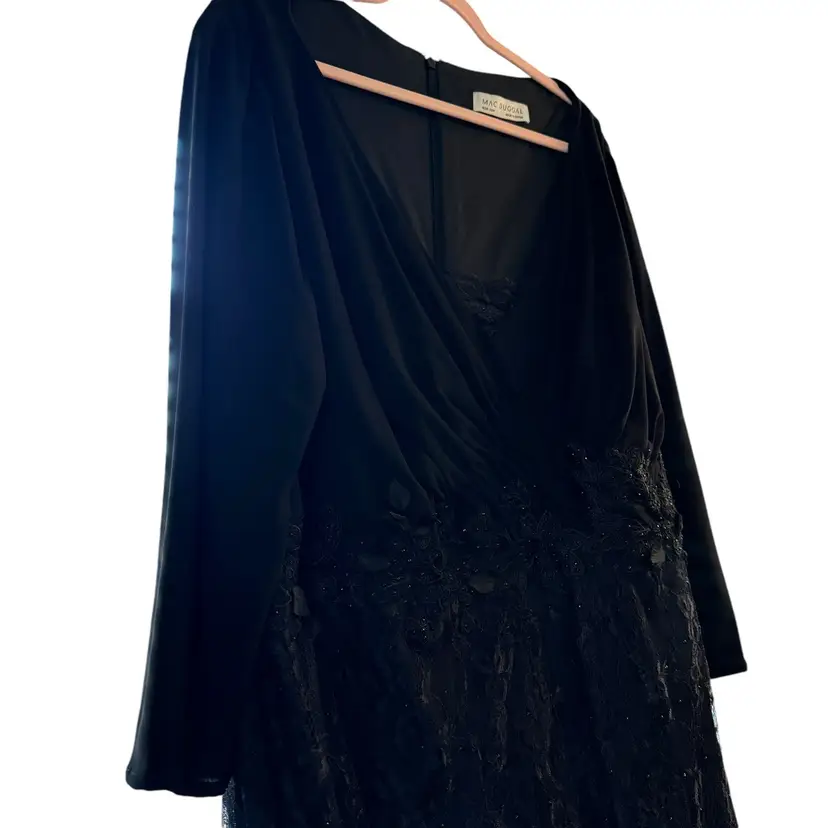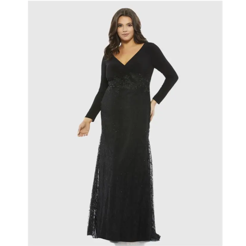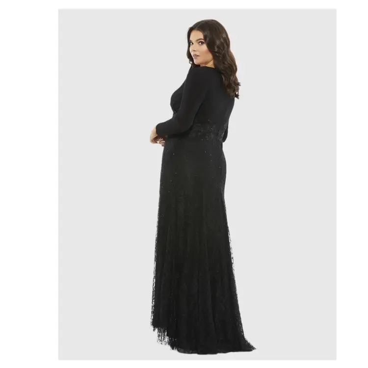 Mac Duggal Black Beaded Wrap Over Long Sleeve Lace Appliqué Trumpet Plus Size Gown Size 28W Trumpet style with wrap over bodice Beaded skirt Hidden back zipper Mother of the bride, bridesmaid, elegant event, wedding Stock photo credit: Mac Duggal