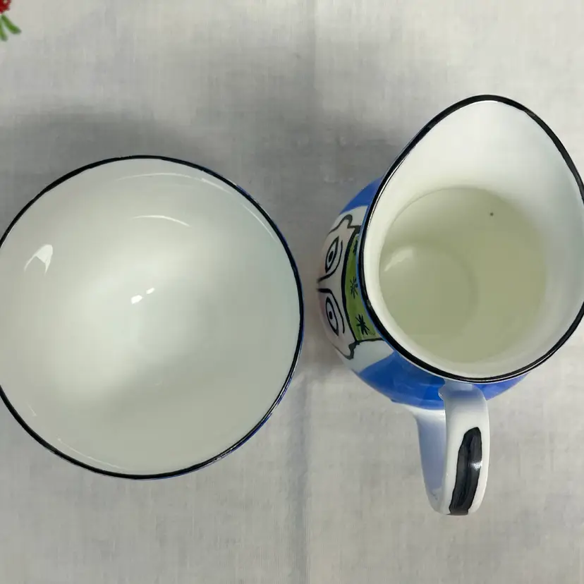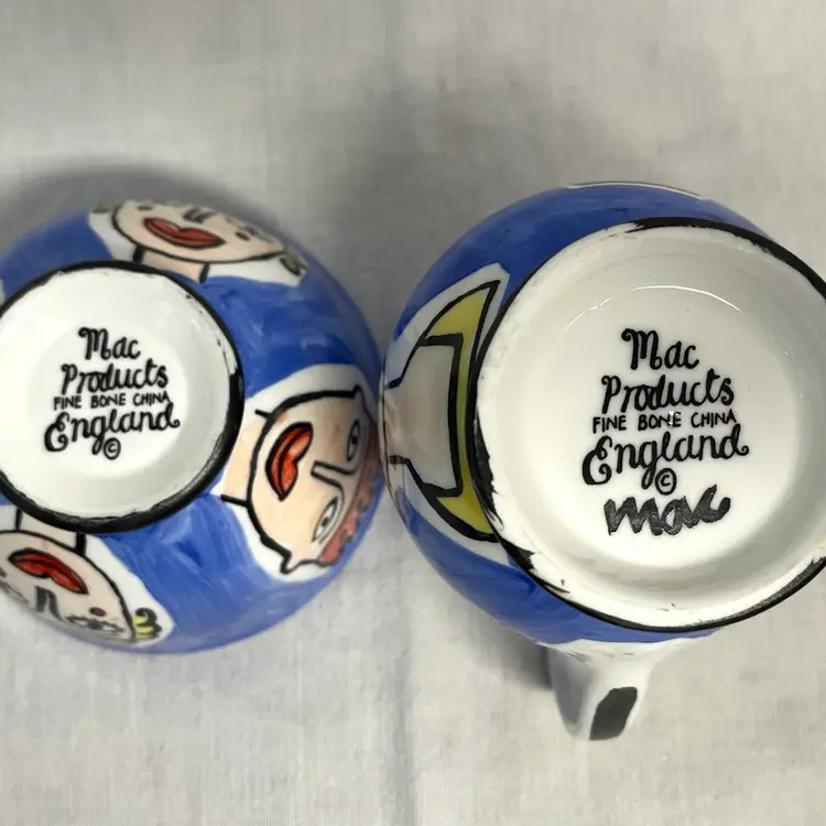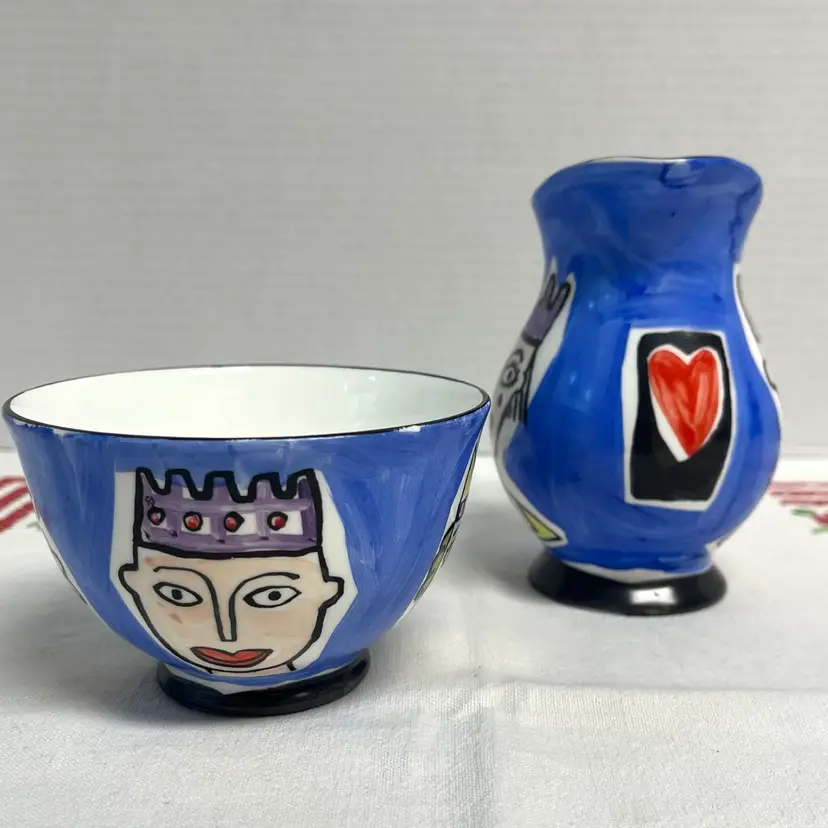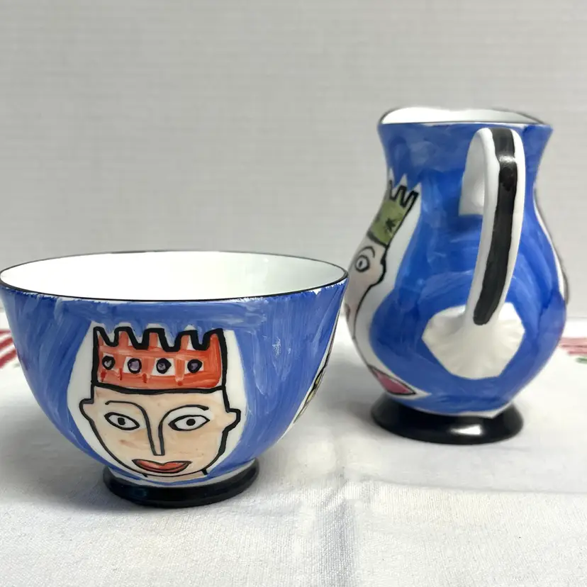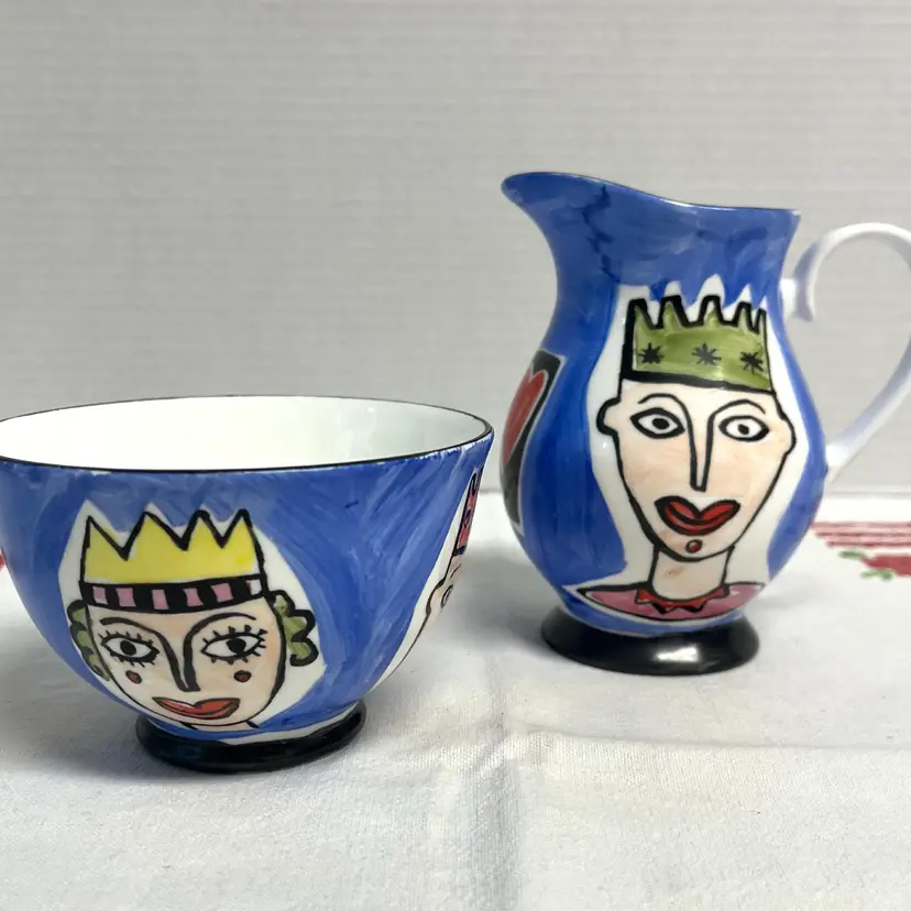 Mac Products Fine Bone China England Whimsical Cream & Open Sugar Set. Hand painted hearts, kings and queens. No chips or cracks.