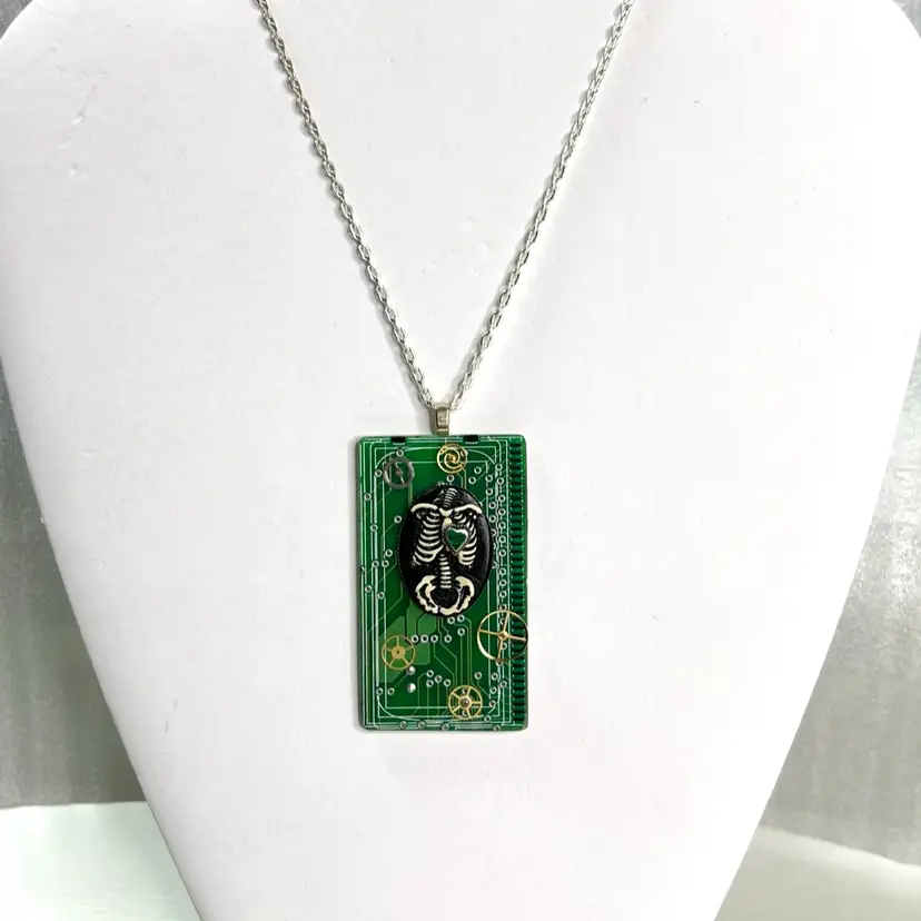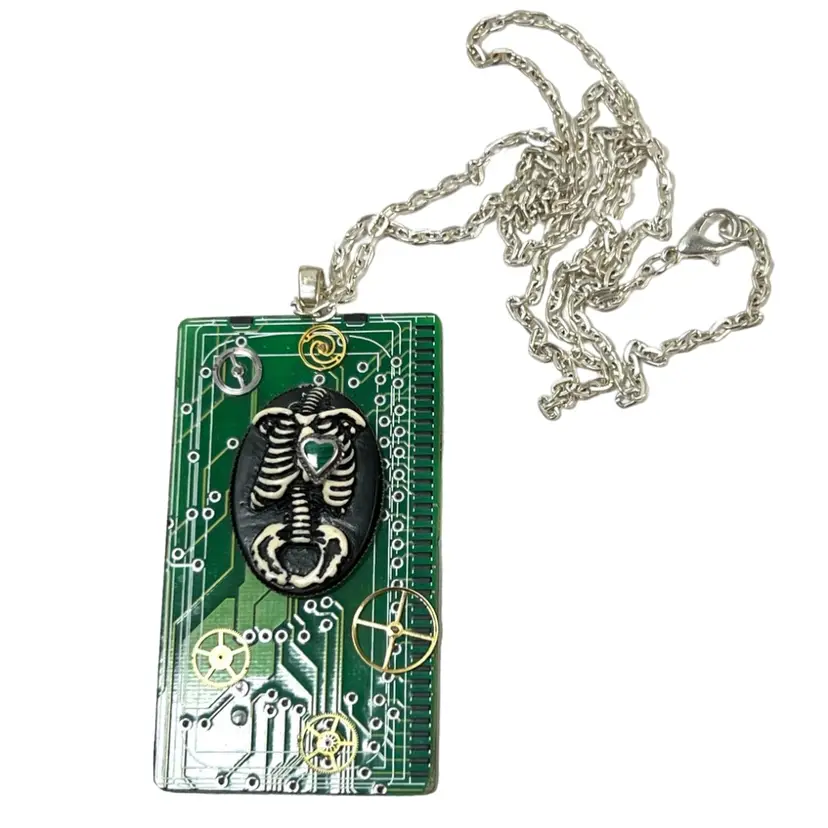 Handmade by me 🫶 ♻️Recycled computer circuitboard Frankenstein's monster in the beginnings of construction. The basic "frame" laid on a slab and ready for parts as they are "dug up." Importantly, the stone cold heart has been placed and the circuits and gears keep it pumping and alive!