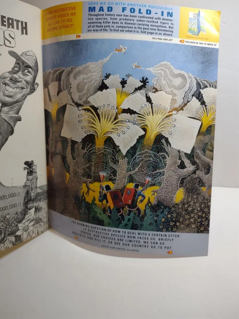 No folds on feature page. Vintage used Mad Magazine. See photos for actual condition. Has some creases and age wear. Complete issue.