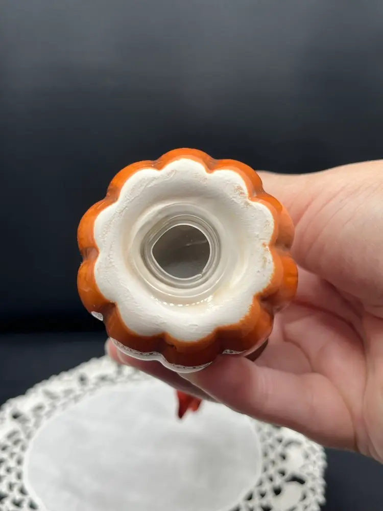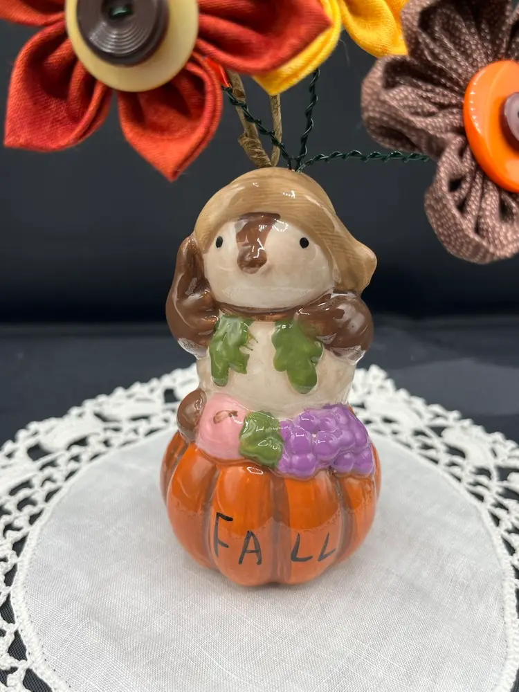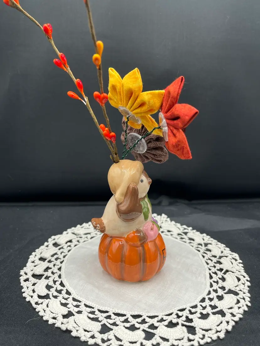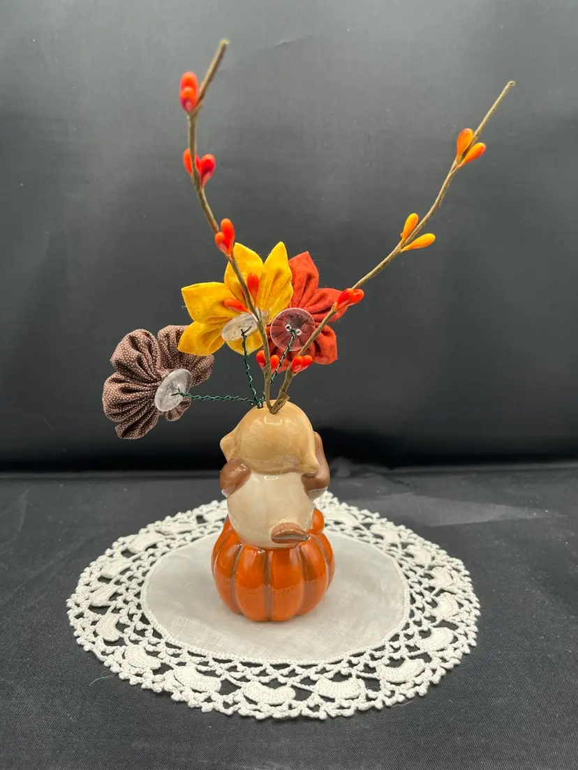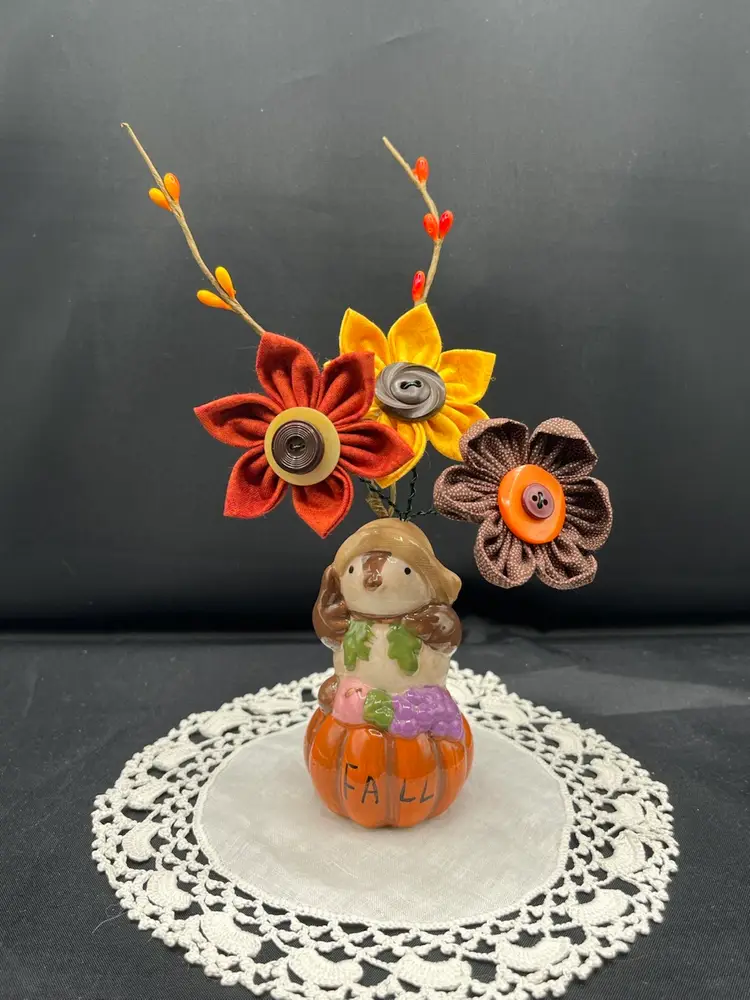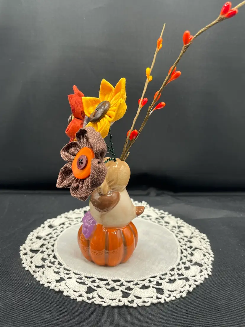 Hand sewn fabric and vintage buttons arranged flowers arranged in a ceramic bird on a pumpkin shaker. Embellished with faux berry stems.