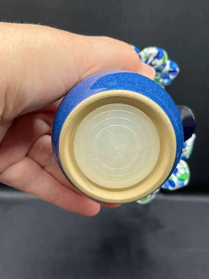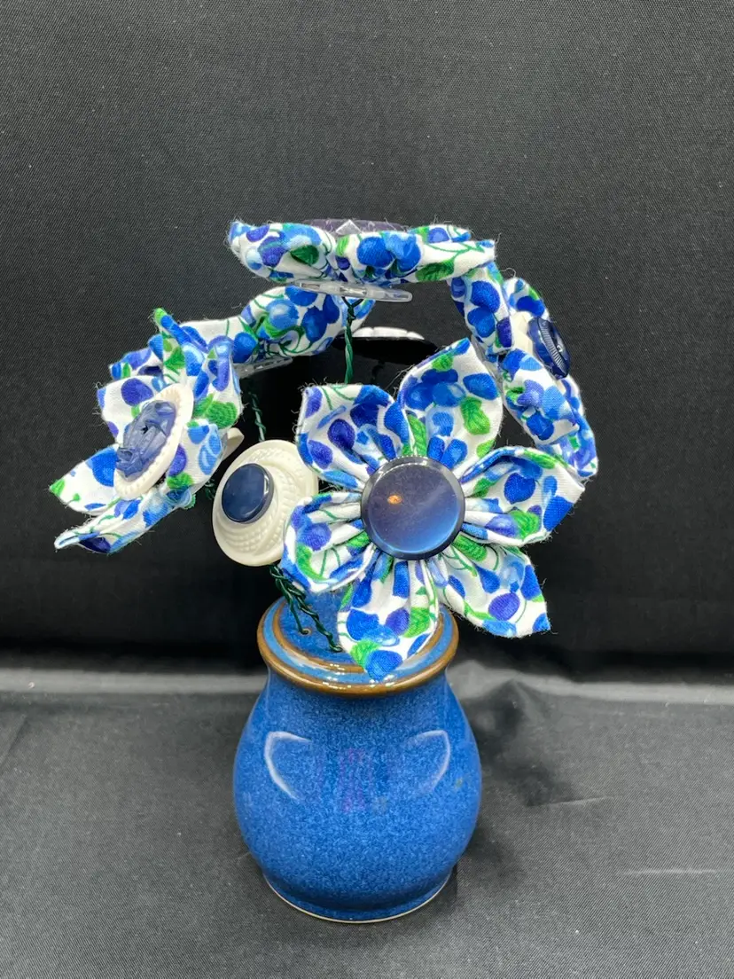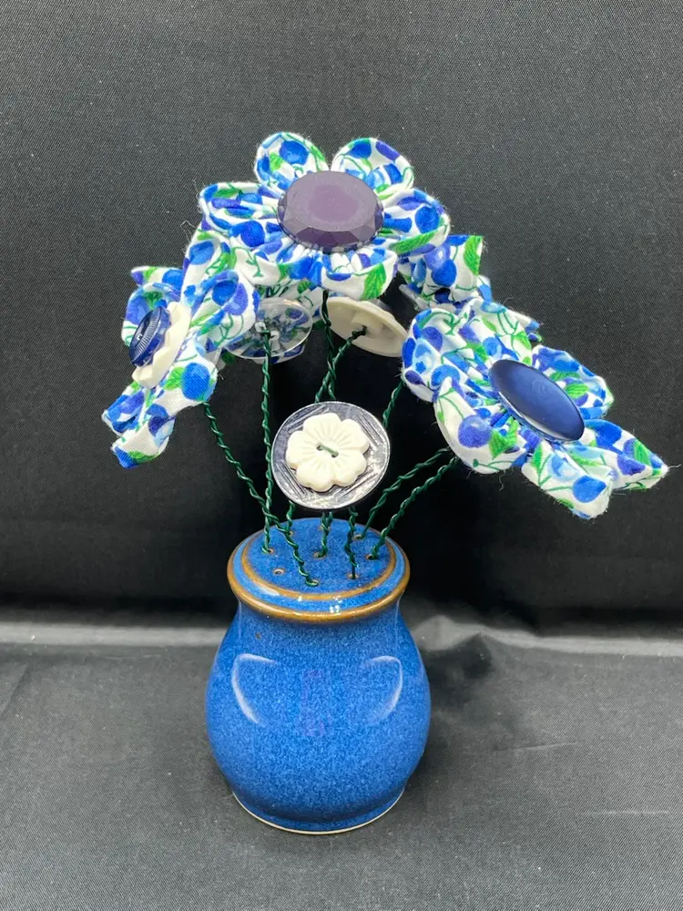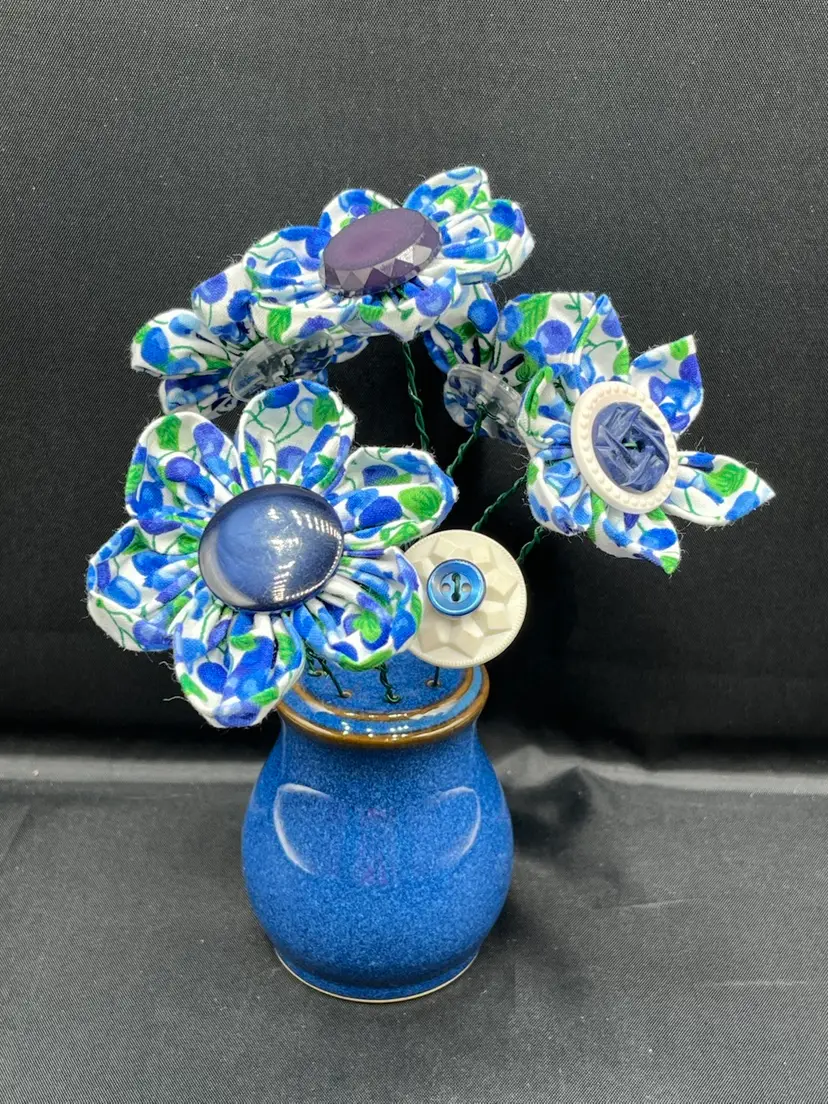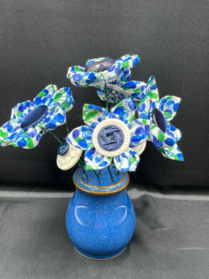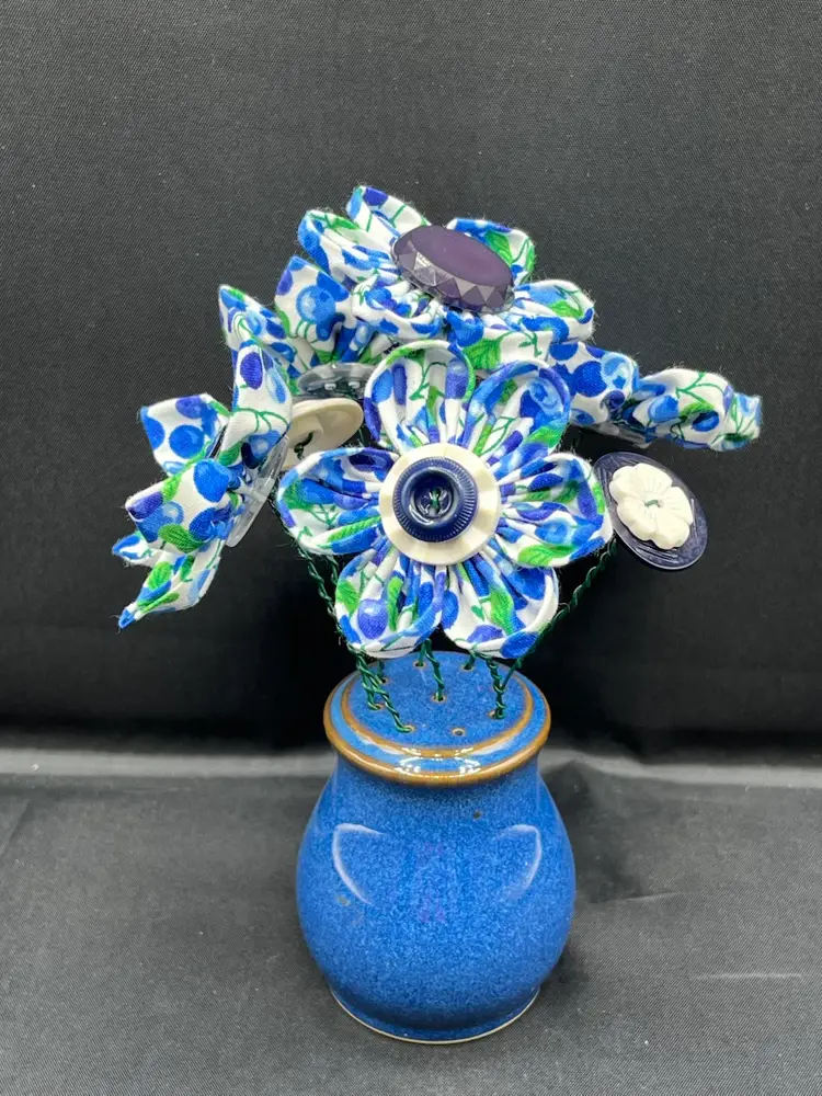 Hand sewn blueberry fabric flowers with vintage buttons arranged in blue ceramic shaker. 7.5” x 4”