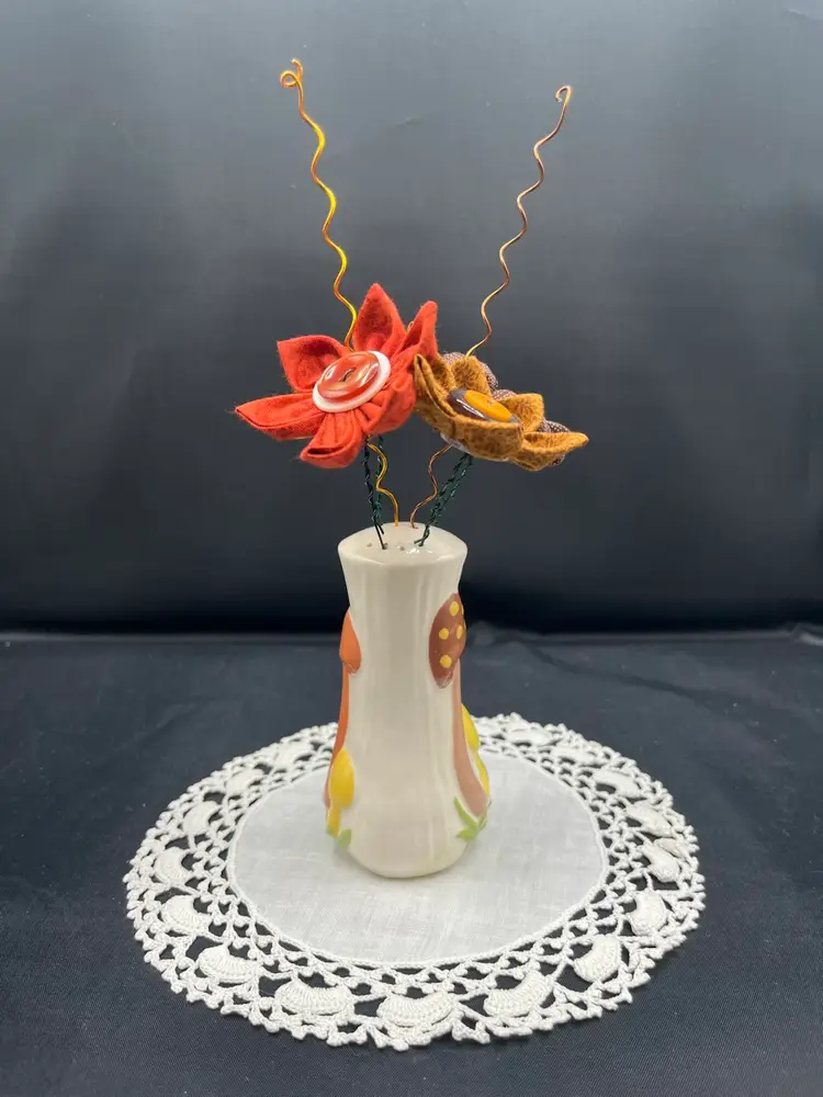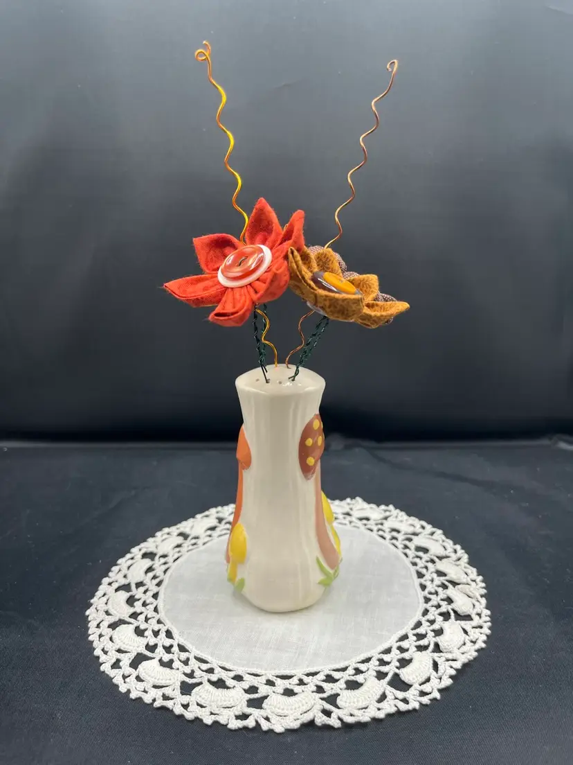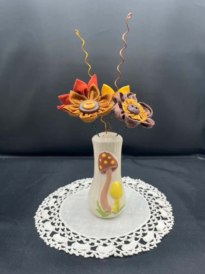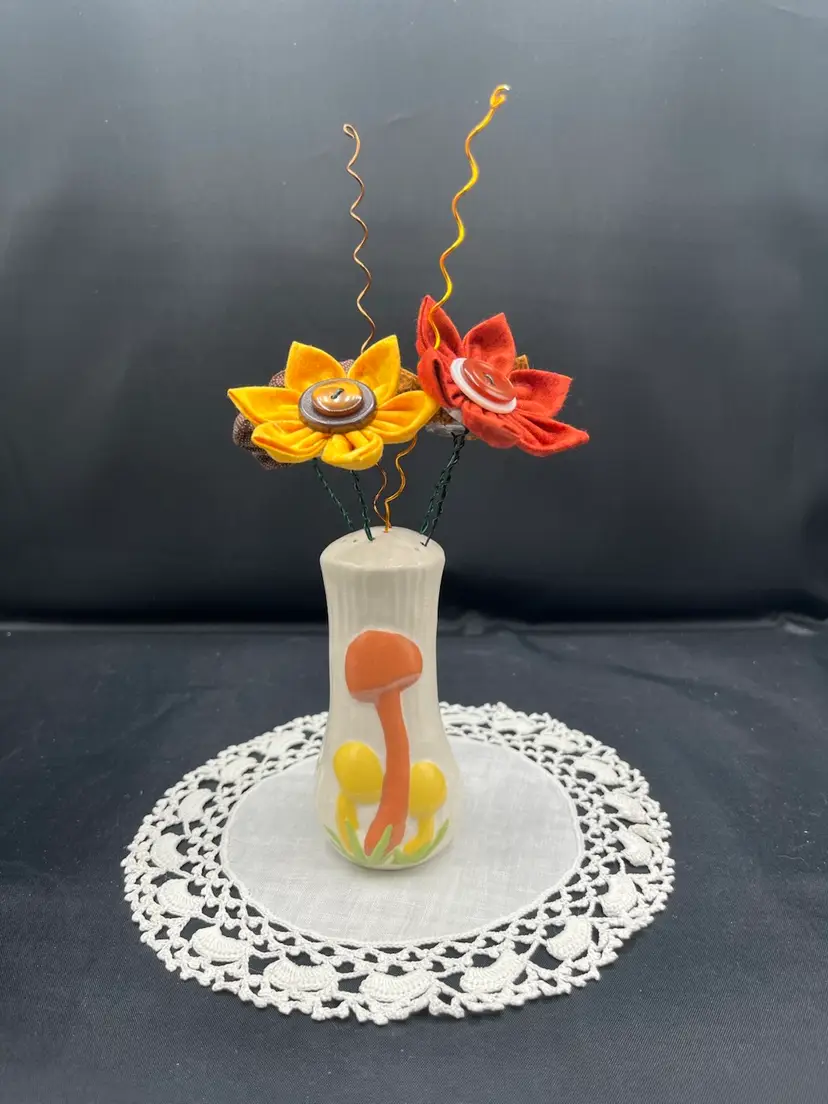 Hand sewn fabric and vintage button flowers arranged in a vintage porcelain mushroom shaker. 10” tall to top of curly wire