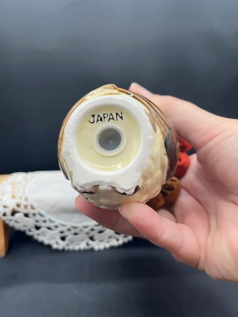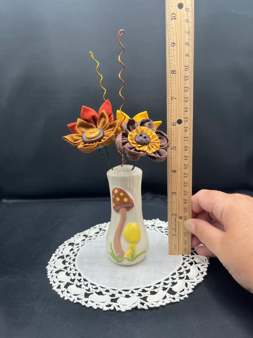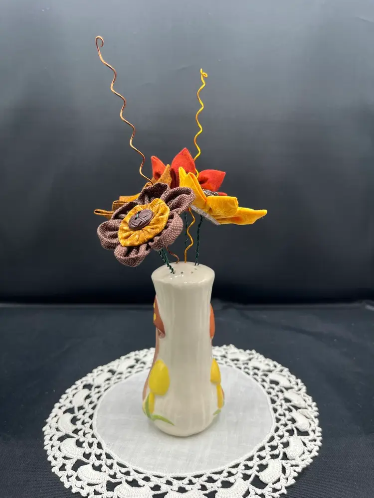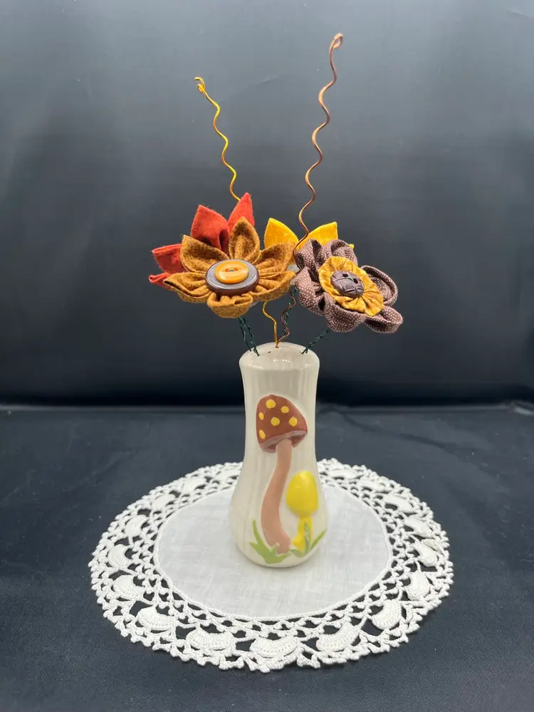 Hand sewn fabric and vintage button flowers arranged in a vintage porcelain mushroom shaker. 10” tall to top of curly wire