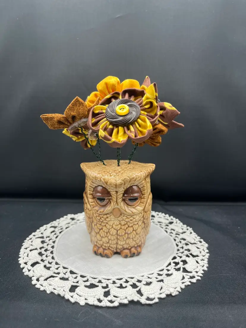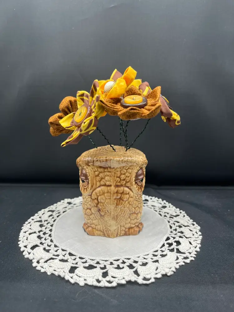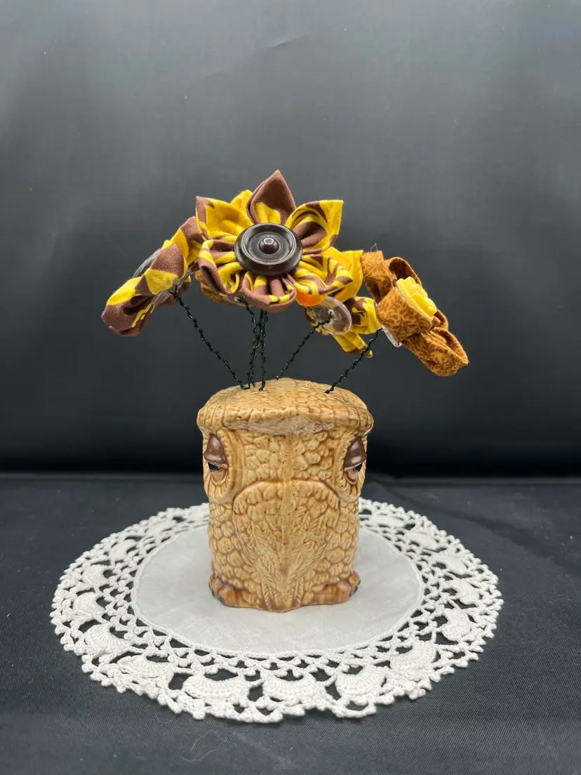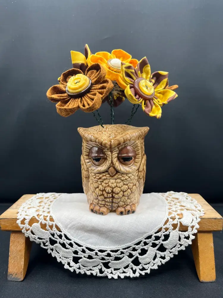 Hand sewn fabric and vintage button flowers arranged in a vintage ceramic grumpy owl shaker.