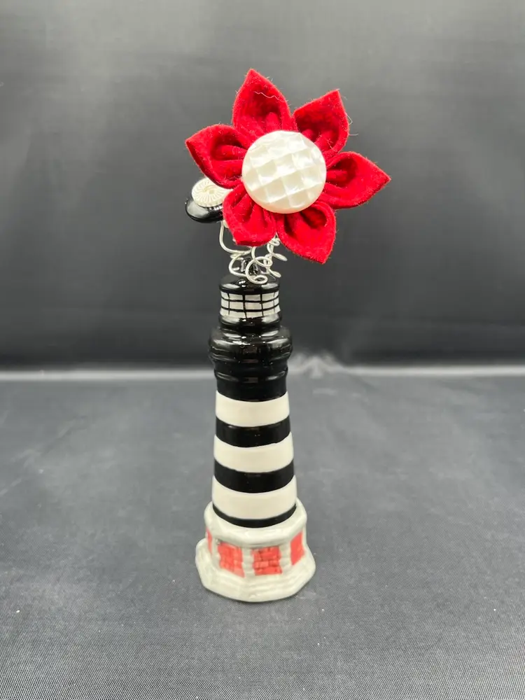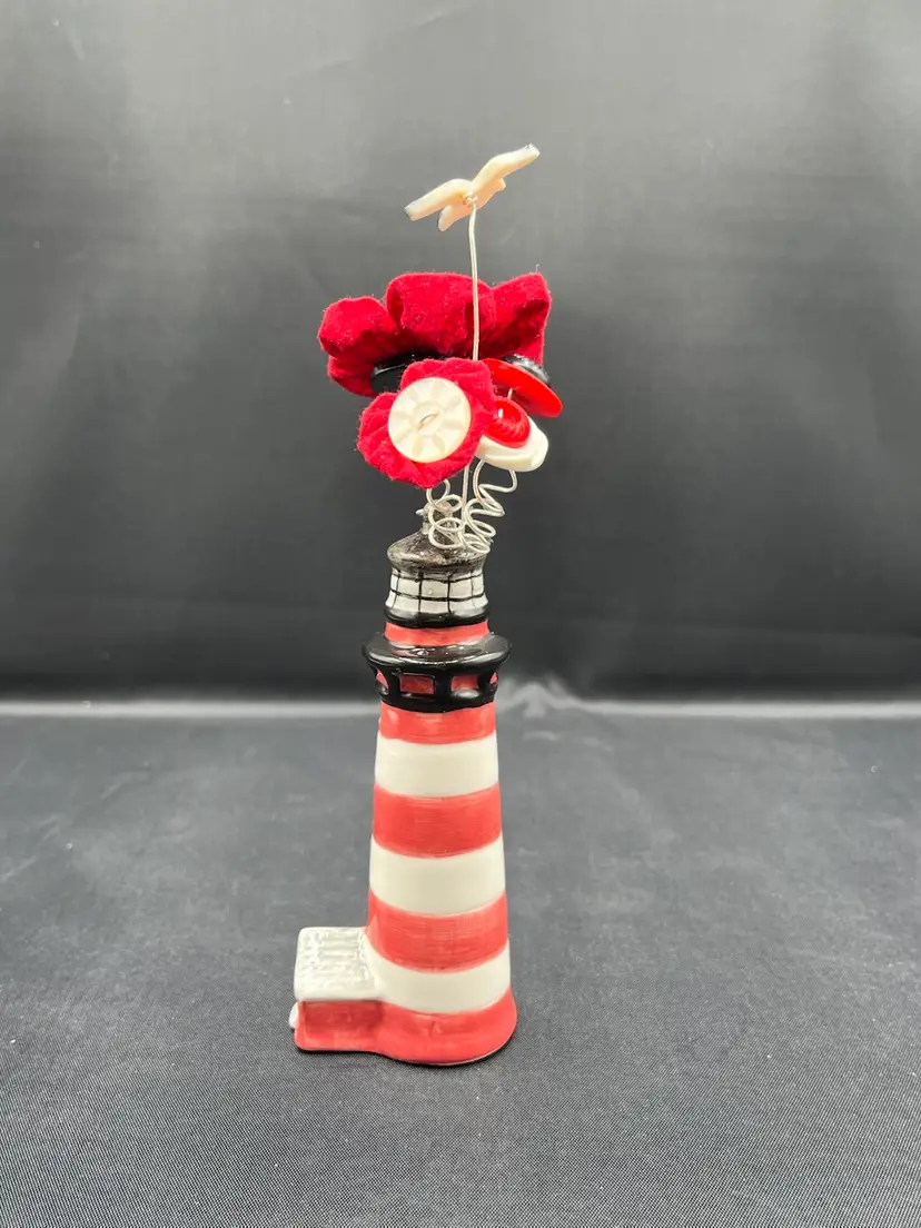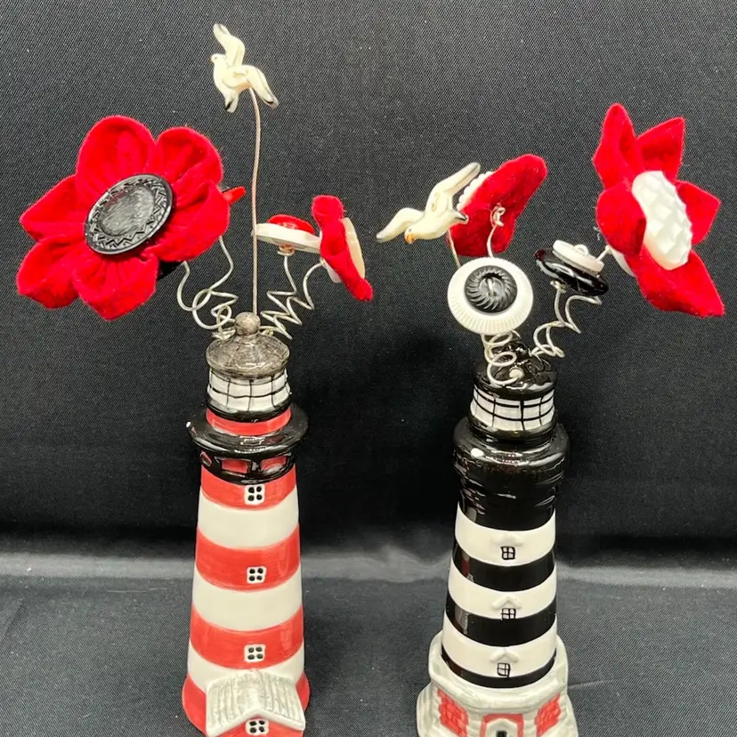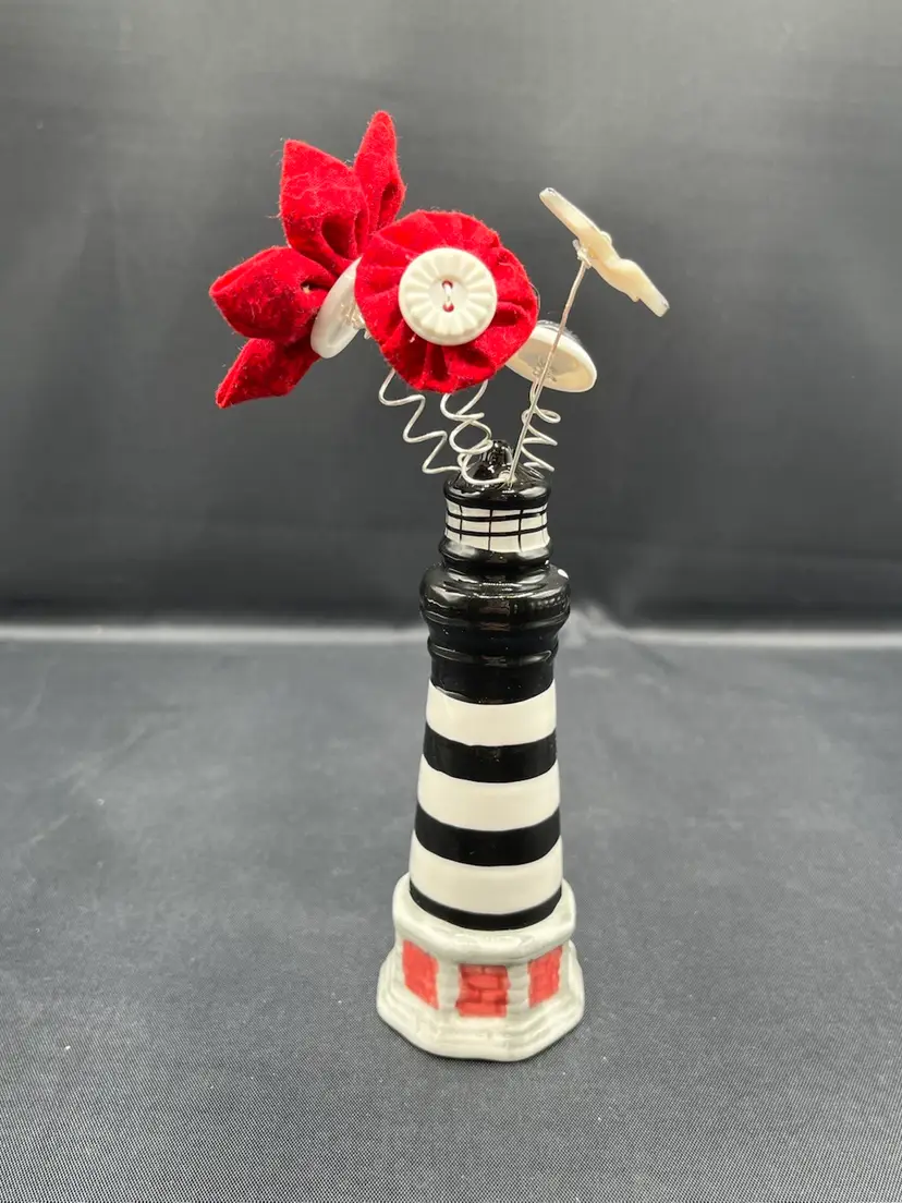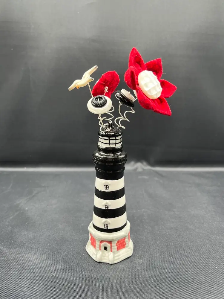Hand sewn fabric flowers with vintage buttons arranged in ceramic lighthouse shakers. 7”x 2 1/2”