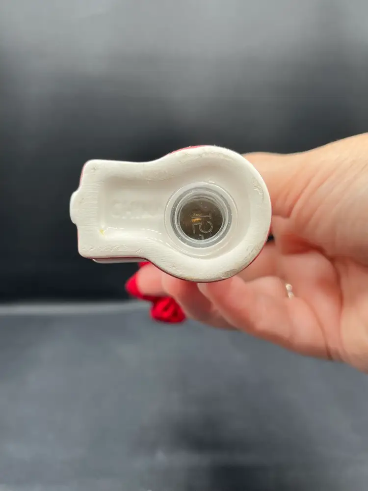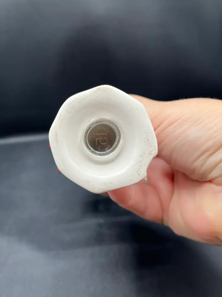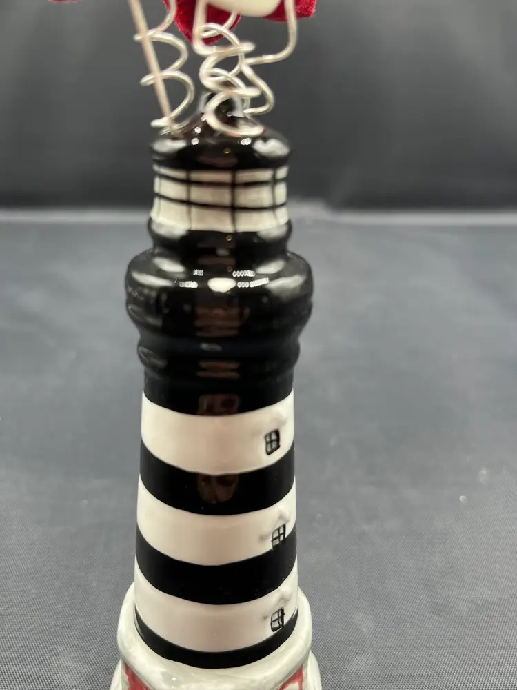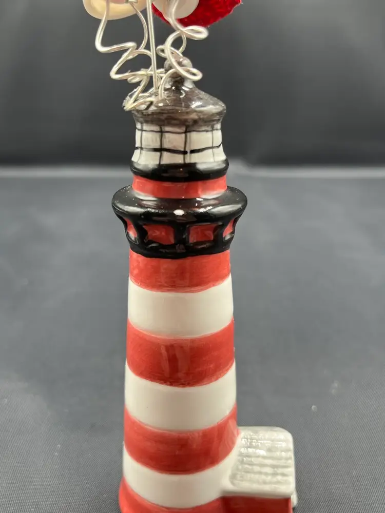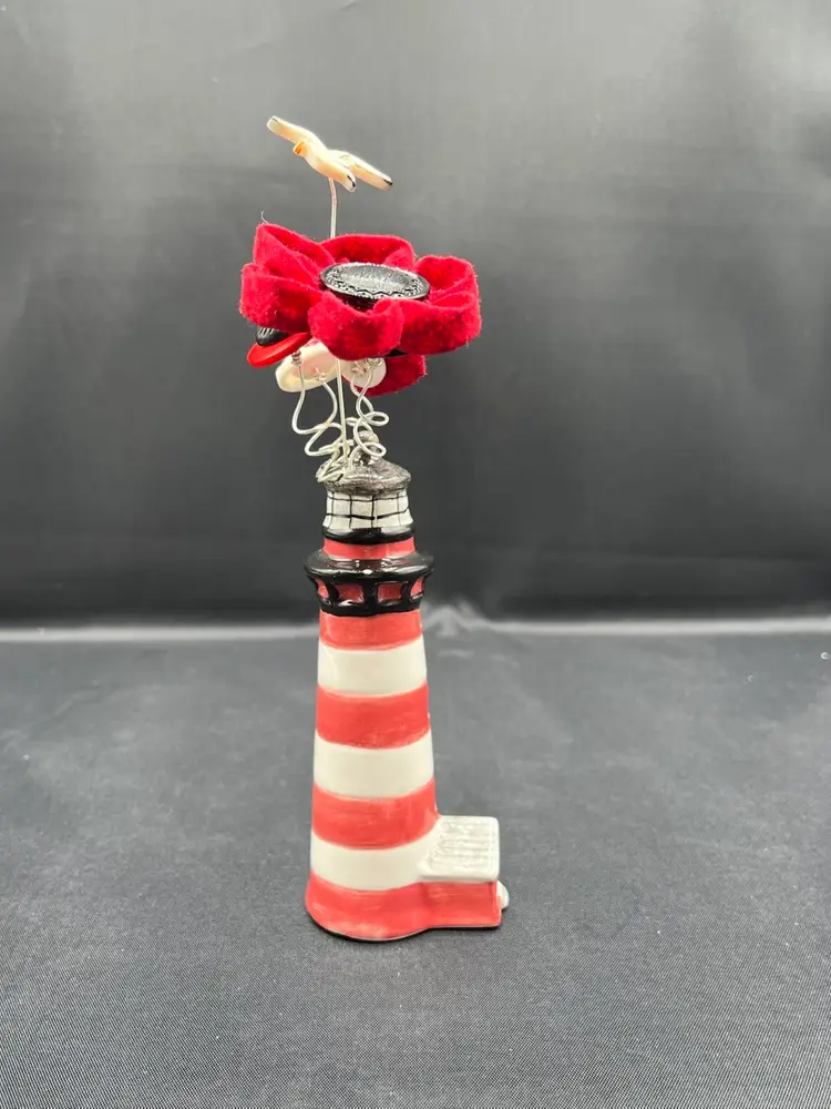 Hand sewn fabric flowers with vintage buttons arranged in ceramic lighthouse shakers. 7”x 2 1/2”