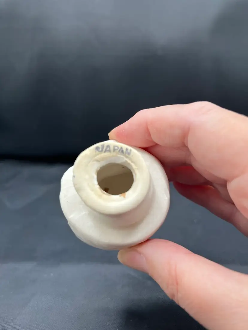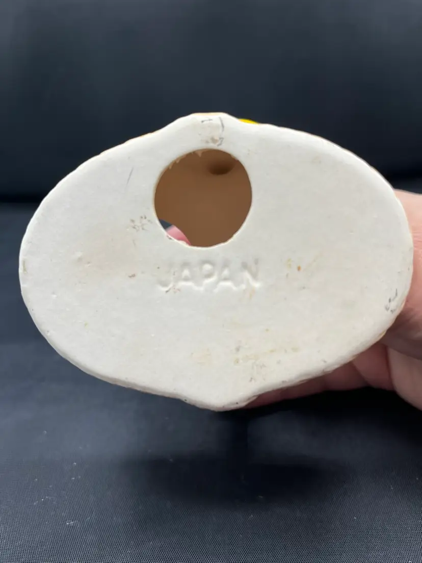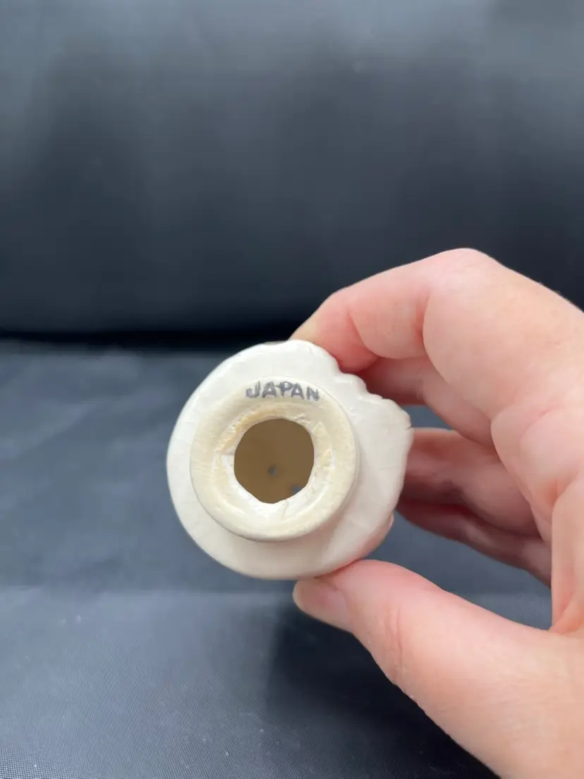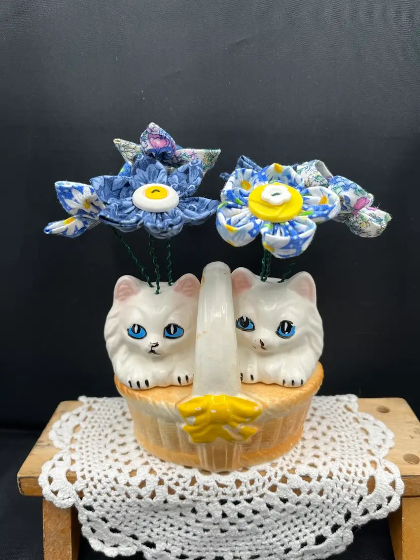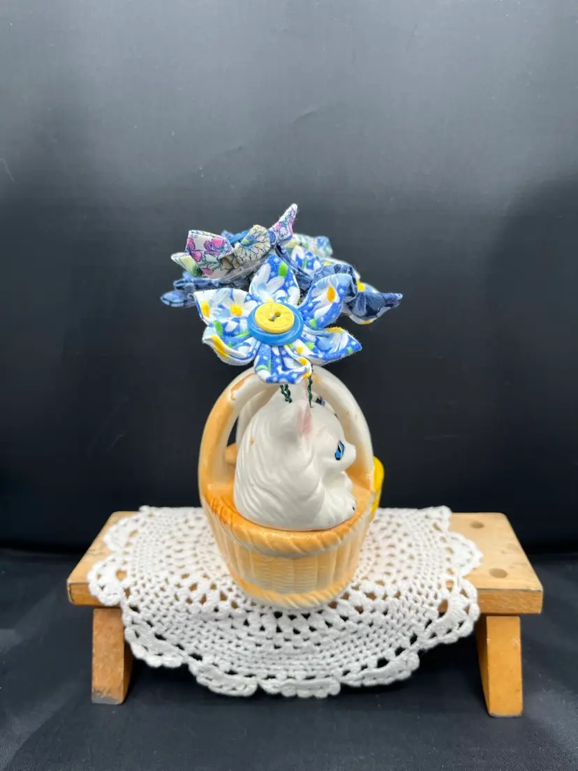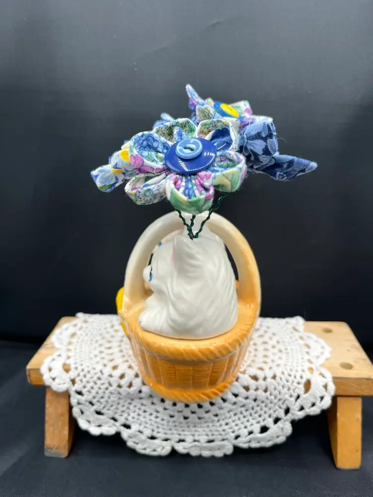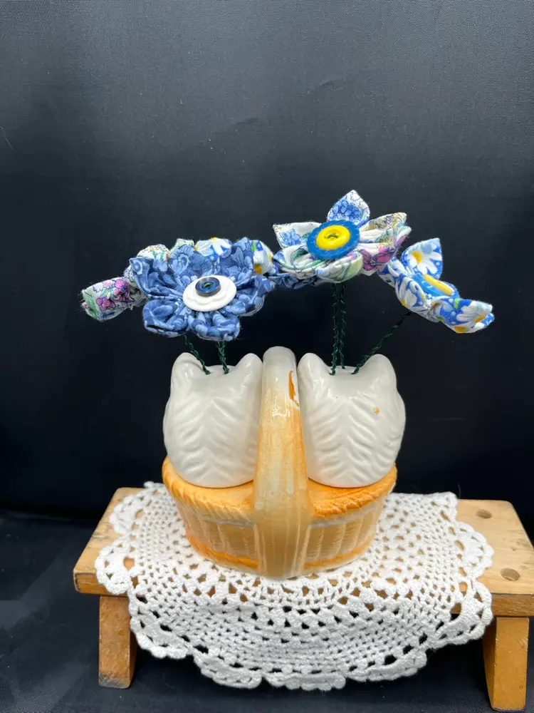 Hand sewn fabric flowers with vintage buttons. Arranged in a vintage ceramic kitties in a basket shaker set made in Japan. 6” x 6 1/2”