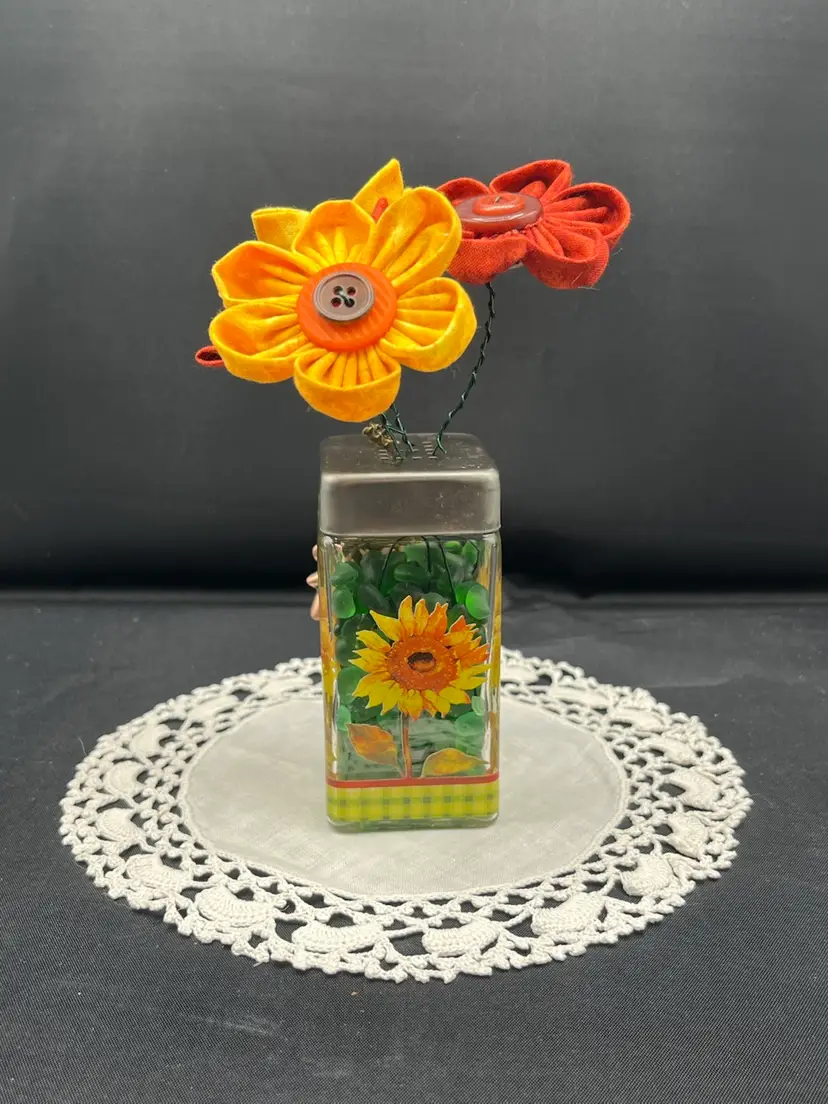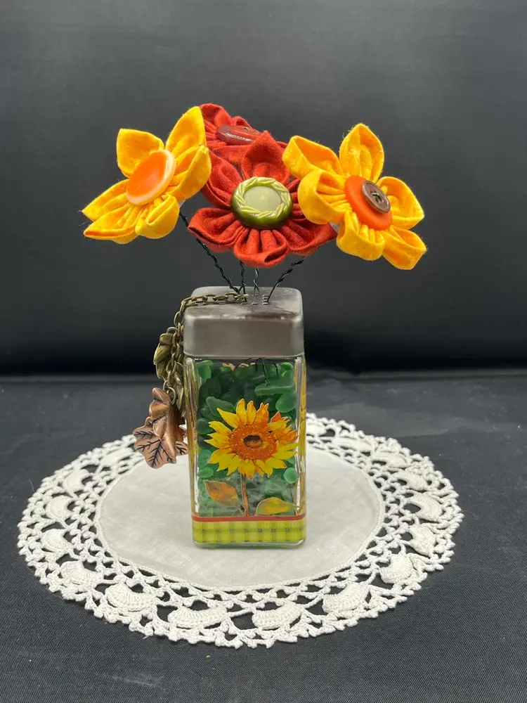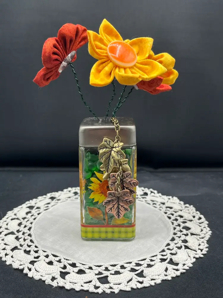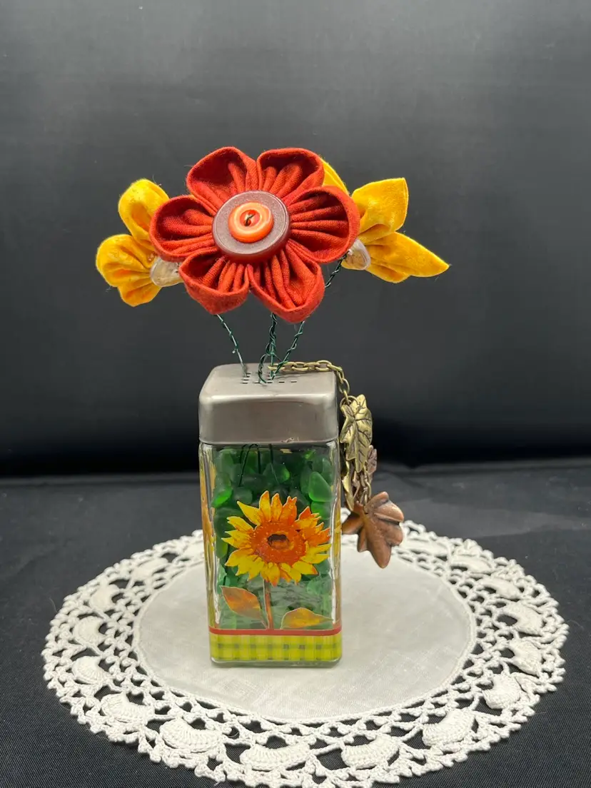 Hand sewn fabric flowers with vintage buttons arranged in a glass shaker. Filled with green tumbled glass pebbles. Embellished with metal leaves.
