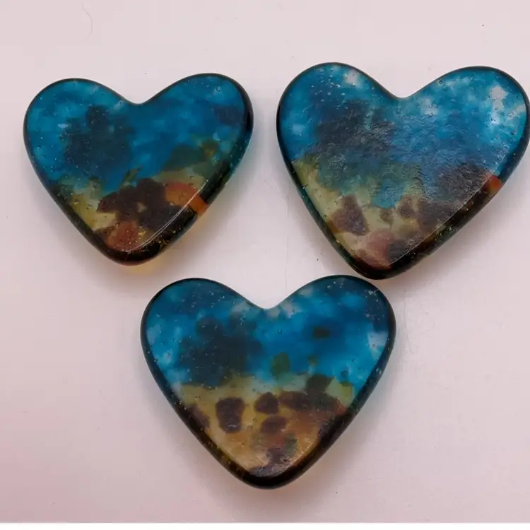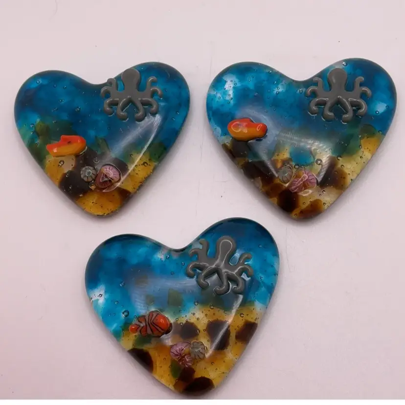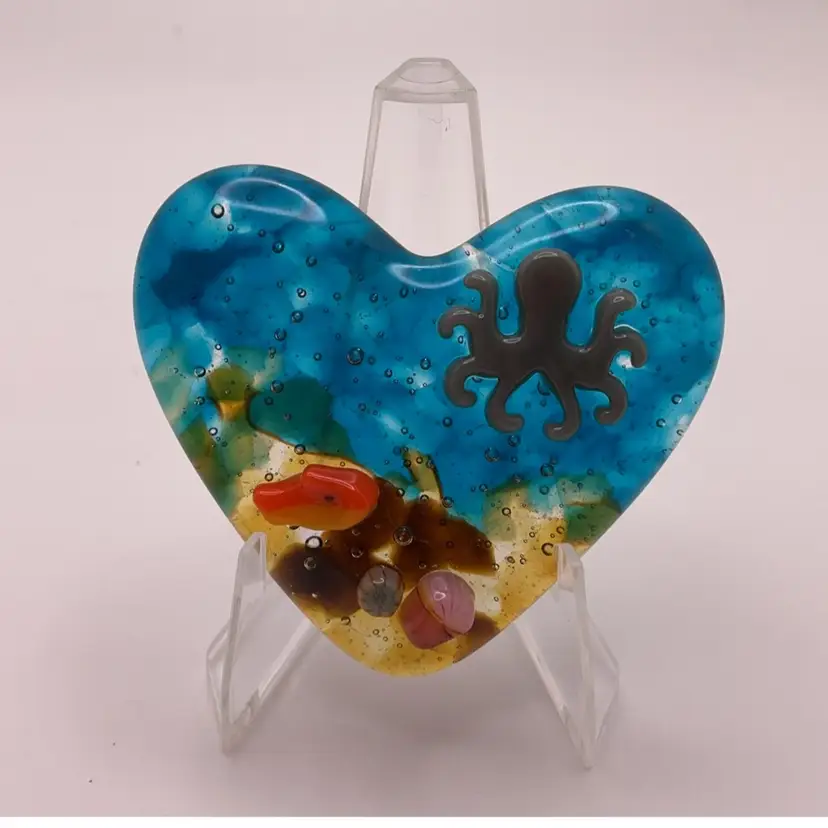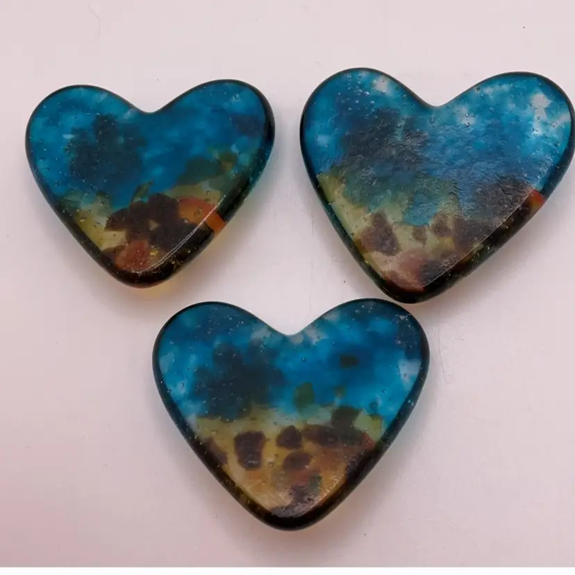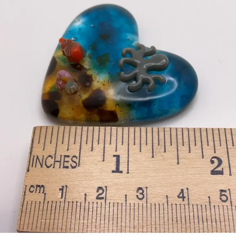 Small, fused glass heart, kiln made with love by me! Each heart is unique and varies in color placement, bubbles and depth of field. Shiny on the front, textured on the back, approximately 1 3/4 x 1 3/4-inches. Made with Bullseye glass base and fused glass murrini from Tabitha's Glass Emporium. Clownfish or goldfish; please see main pics for variants. Price is for one heart.