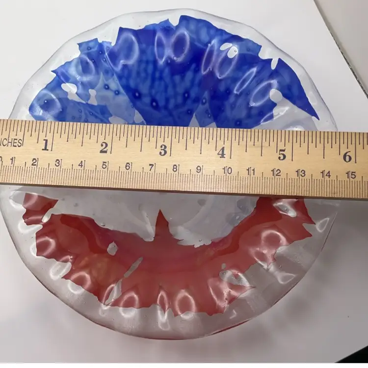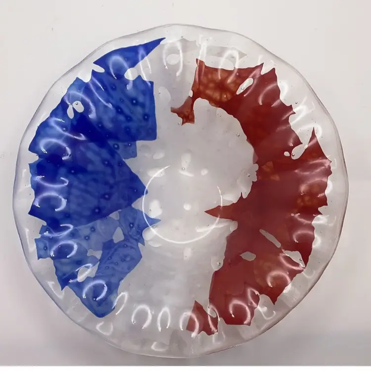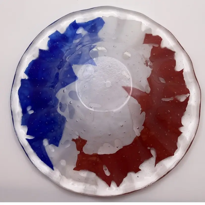 Six-inch fused glass trinket dish, kiln made with love by me! Unique and varies in color placement, bubbles and depth of field. Shiny on the front, textured on the back, approximately 6-inches in diameter. Made with Bullseye glass - clear base with red, white and blue confetti laid across the top, "floating". Has a Grateful Dead vibe! Food safe.