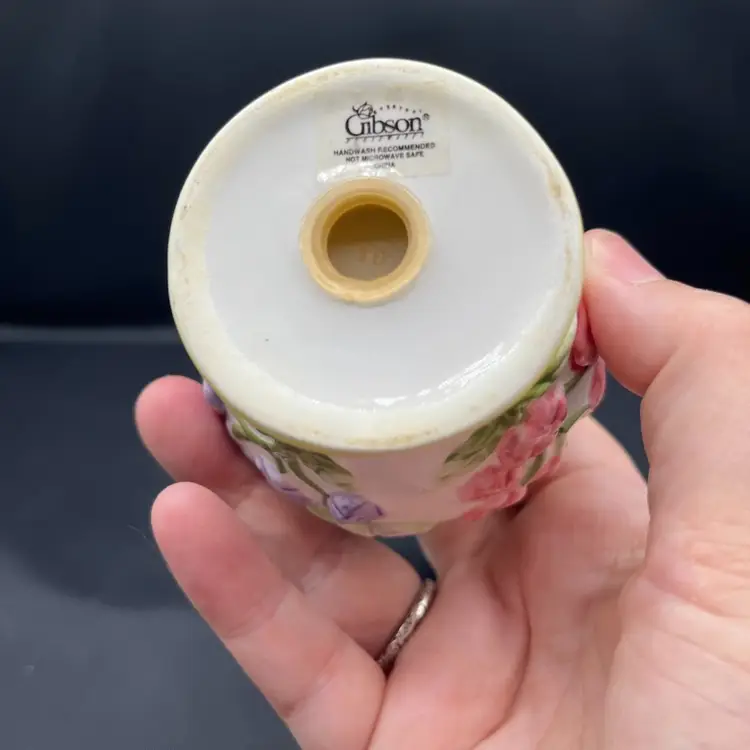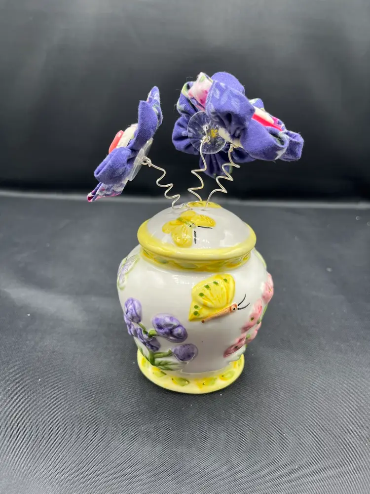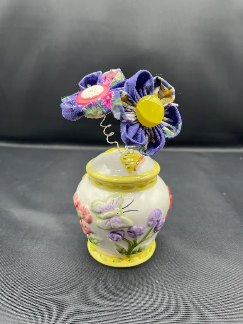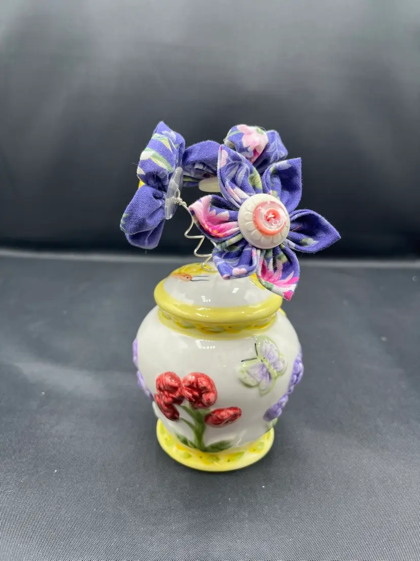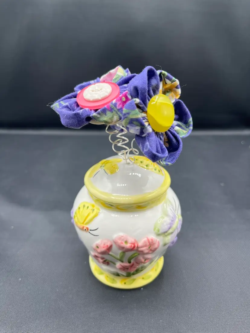 Hand sewn flowers with vintage buttons arranged in a ceramic “Butterfly Garden” shaker made by Gibson. 5.5” x 3”