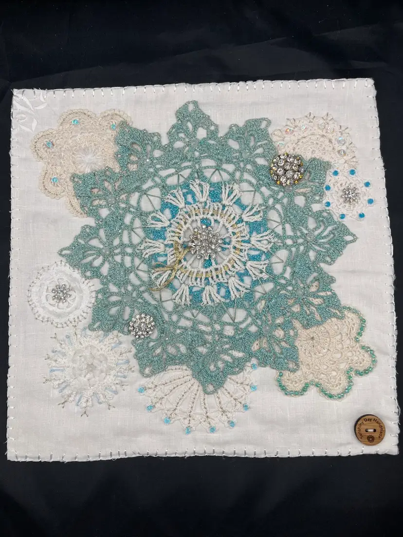 Made By Me “Let It Snow” Vintage Doily Collage Hand Embroidered With Swarovski Chrystal Beads And Vintage Rhinestone Buttons 12”x12”