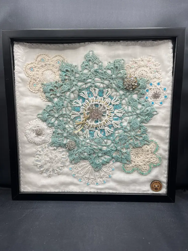 9 vintage doilies hand embroidered with a variety of threads, glass and Swarovski Chrystal beads, vintage rhinestone buttons and a removable vintage rhinestone brooch in the center. Sewn onto a vintage linen napkin. Framed in a black 12”x12” shadow box frame.