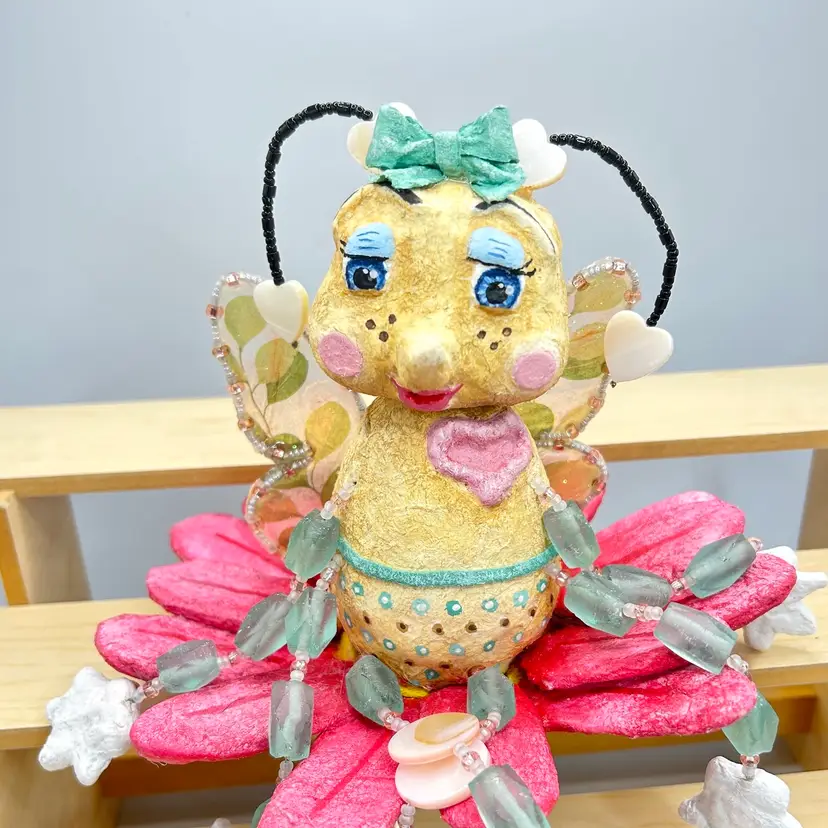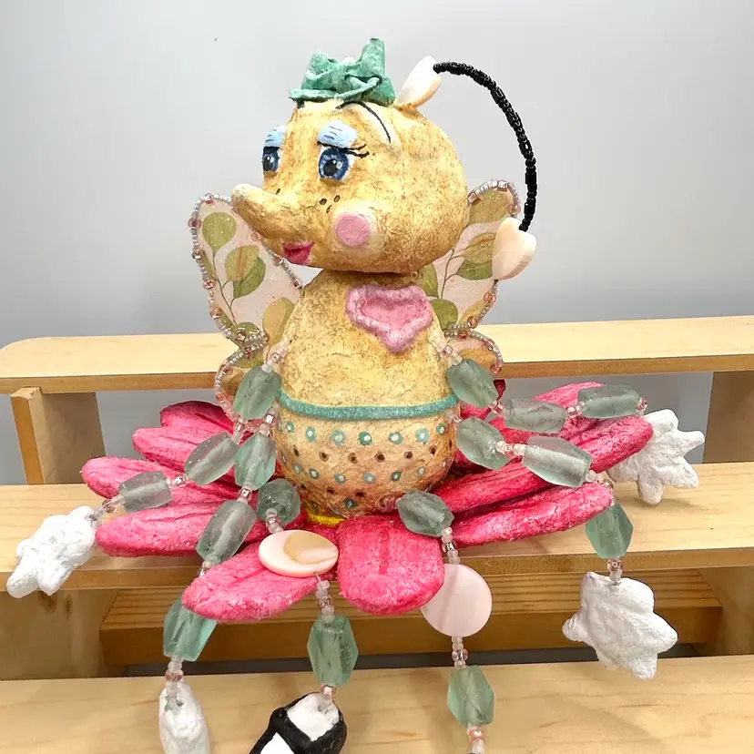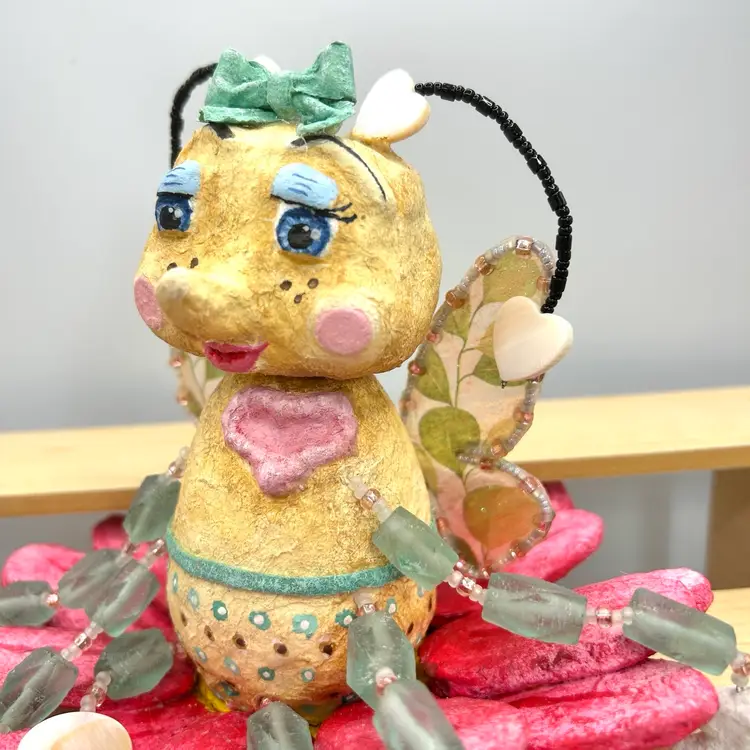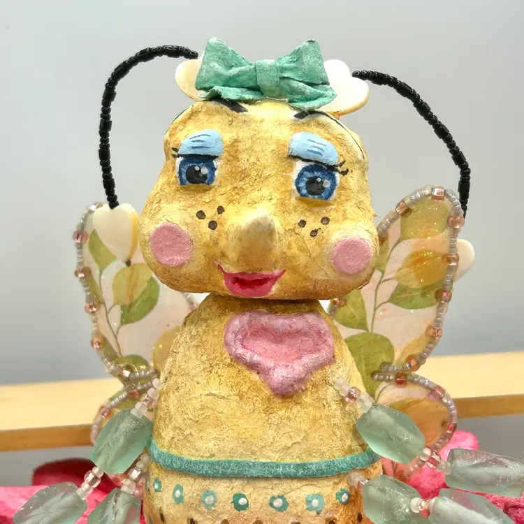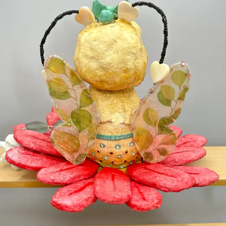 This Love Bug is made primarily of spun cotton but includes glass beads for the arms, legs, and antennae. She also has magnets in her cheeks and one hand so you can pose her in fun ways. Her head can be turned from side to side. Dimensions: approx. 6.5 x 6.5 x 6