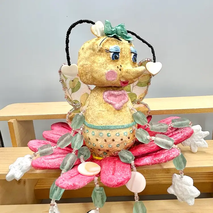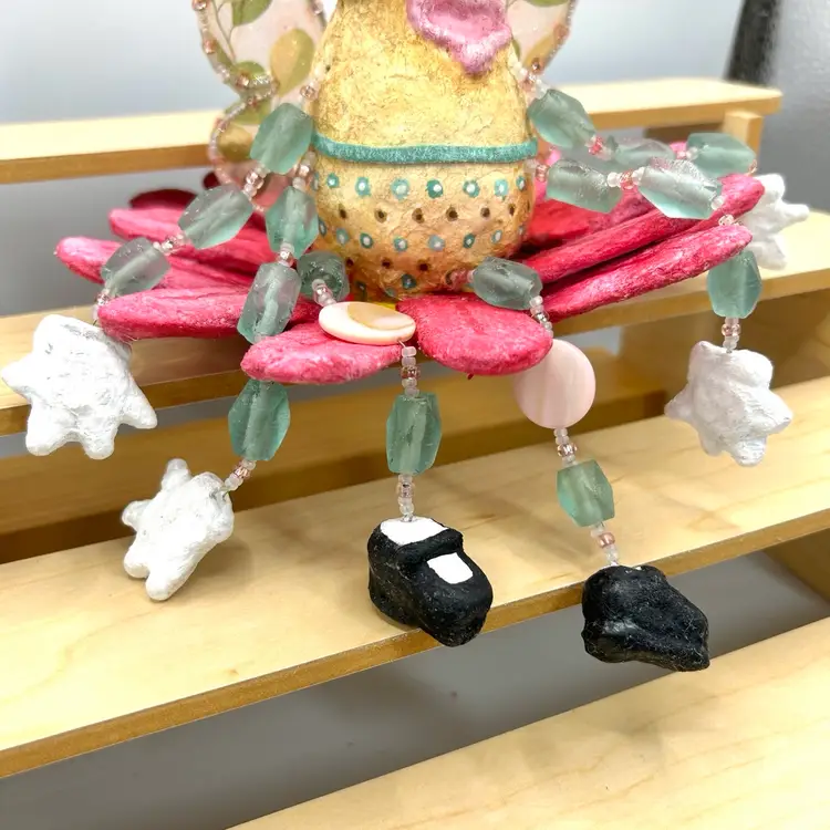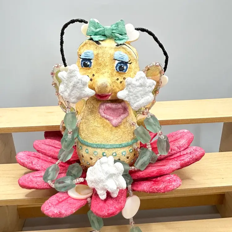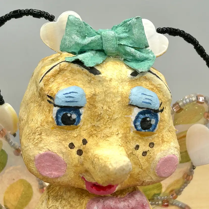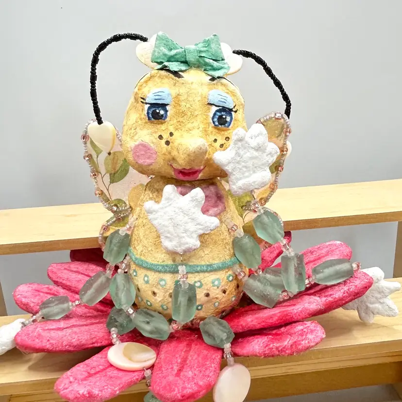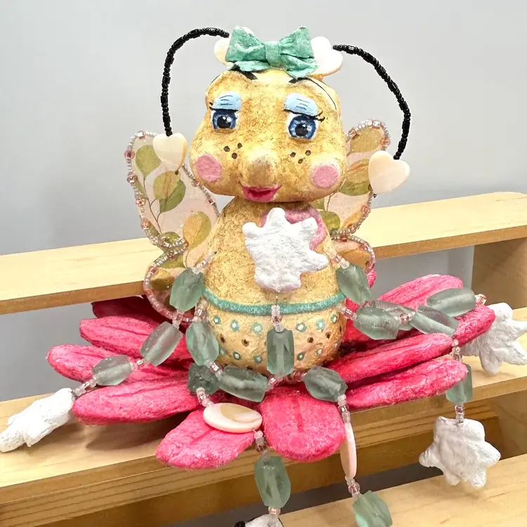 This Love Bug is made primarily of spun cotton but includes glass beads for the arms, legs, and antennae. She also has magnets in her cheeks and one hand so you can pose her in fun ways. Her head can be turned from side to side. Dimensions: approx. 6.5 x 6.5 x 6
