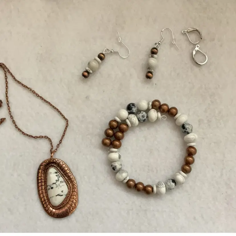 Pendant- black & white magnesite stone set in faux copper 2” x1” Chain- choice of 20”, 22” 24” Bracelet- memory wire wrap with magnesite and copper beads fits all Earrings- magnesite and copper beads, 1”, Choice of hooks or leverbacks