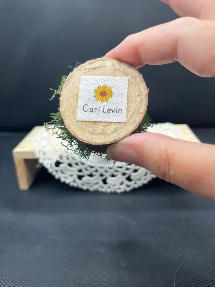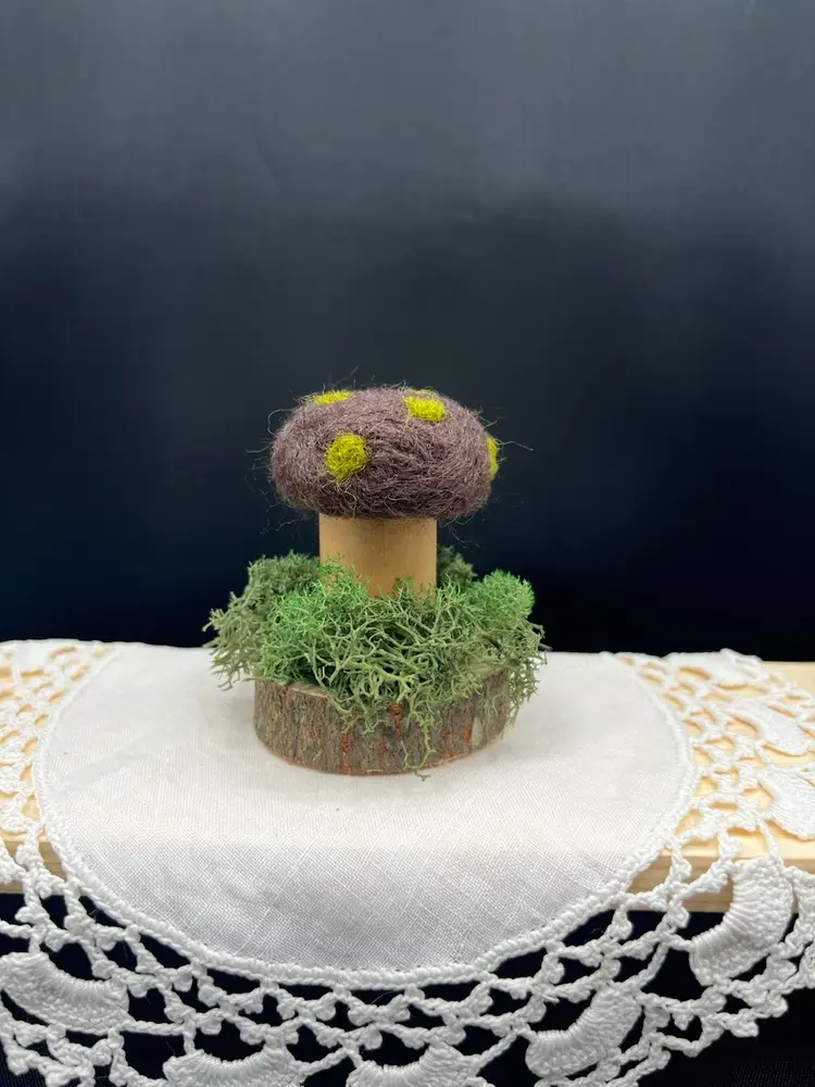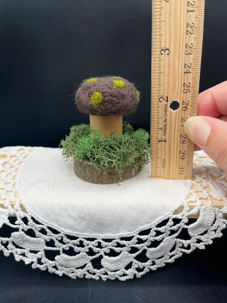 Hand needle felted mushroom cap made with sheep’s wool. Stem is made with vintage wooden thread spool. Mounted on tree branch slice with reindeer moss. 2.5”