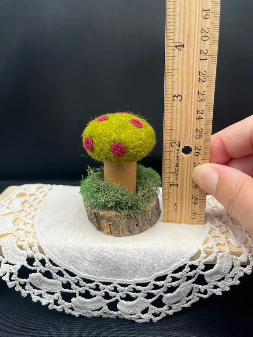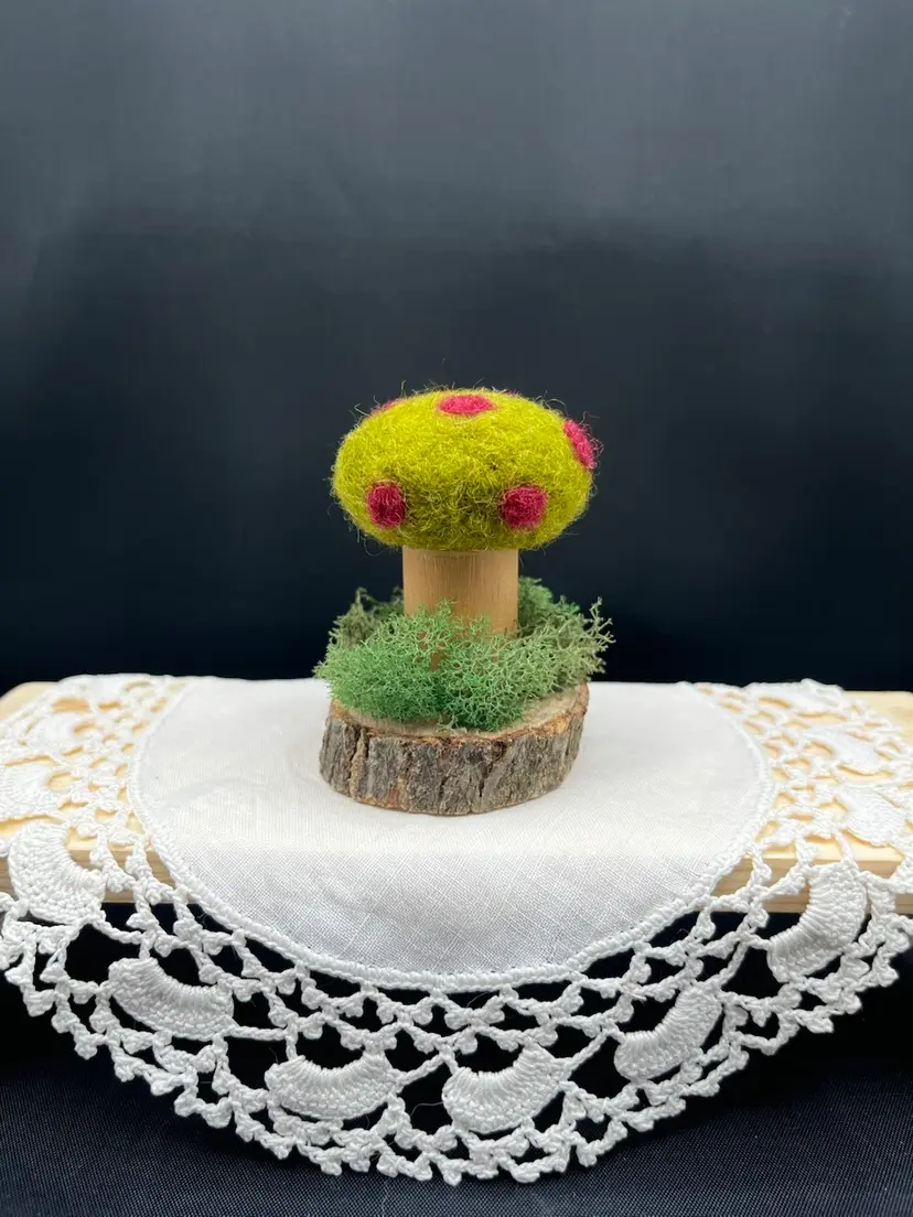 Hand needle felted mushroom cap made from sheep’s wool. Stem is a vintage wooden thread spool. Mounted on tree branch slice with reindeer moss. 2.5” tall