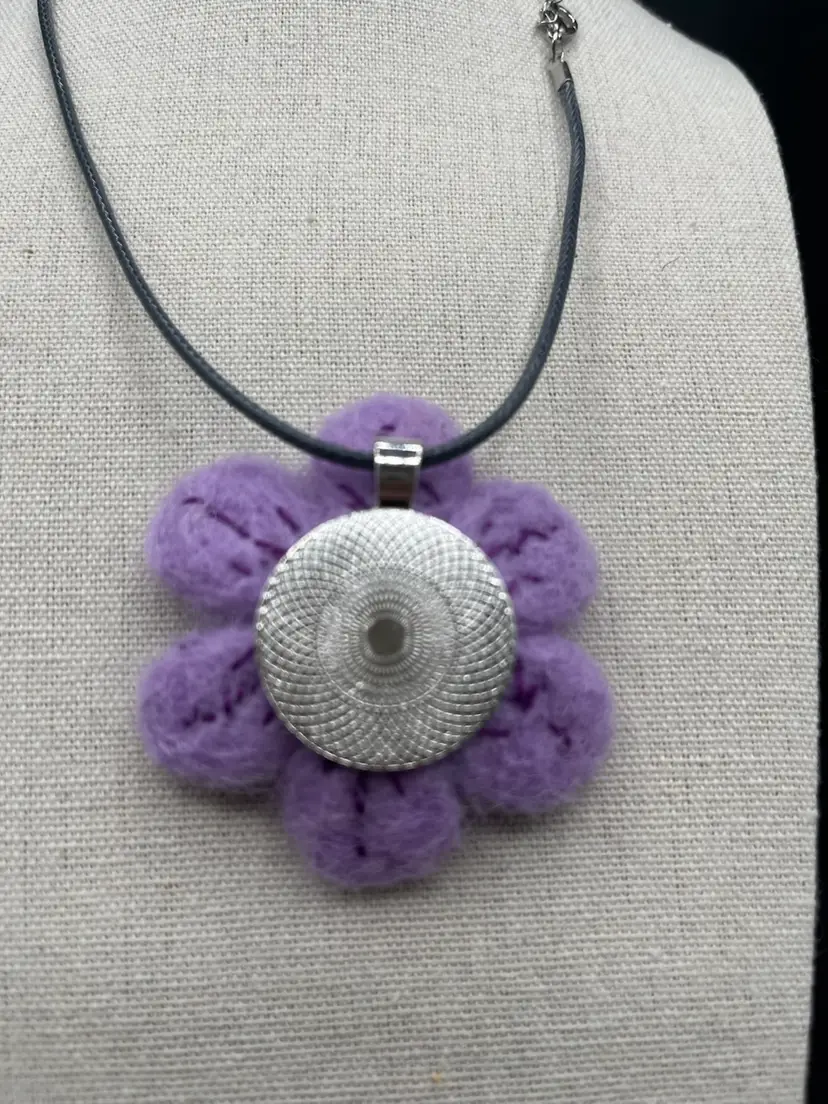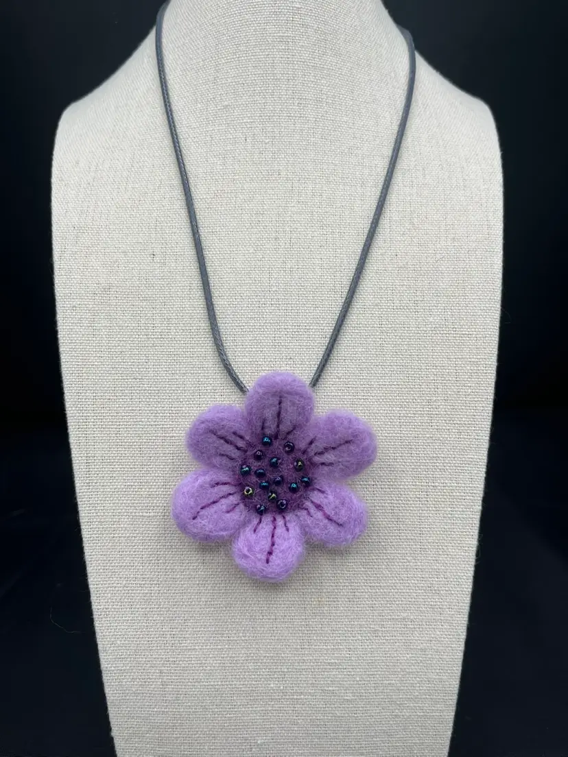 Hand needle felted by me purple flower pendant embellished with Swarovski crystals and embroidery stitching 2 1/4” on an 18” cord.