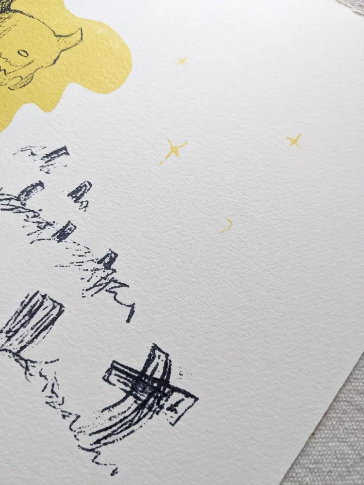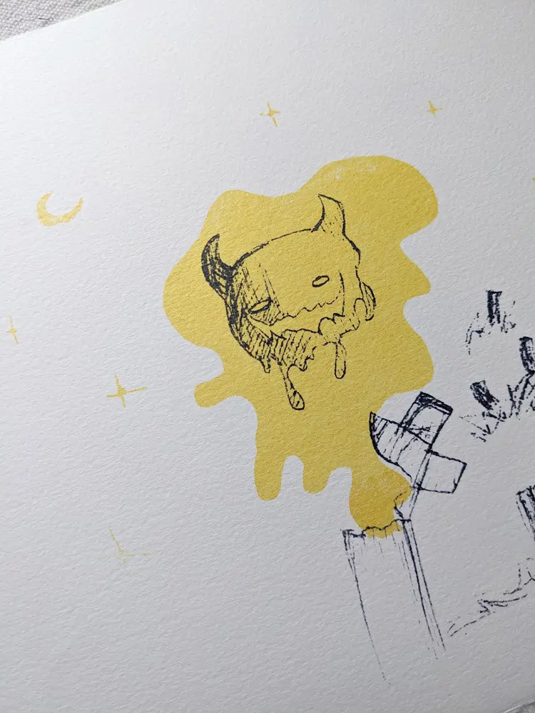 Silkscreen printed by hand on cold-press heavyweight Arches watercolor paper. The gold ink has a metallic shimmer. Perfect for your halloween decor or everyday wall art.