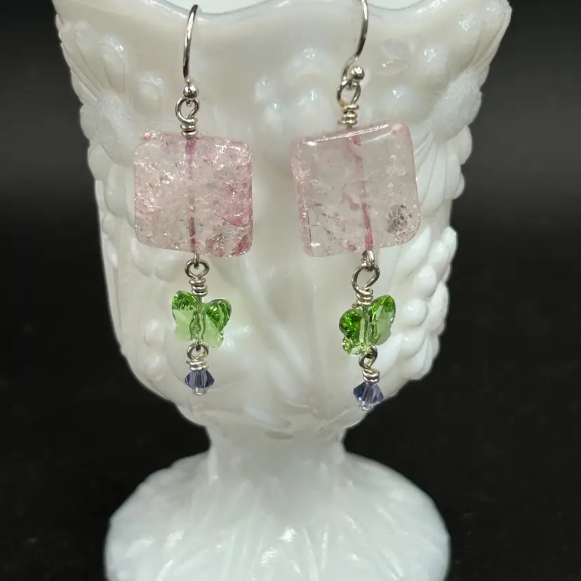 2.5” drop. Glass beads. I made these quite a while back but I’m fairly sure I used sterling hooks.