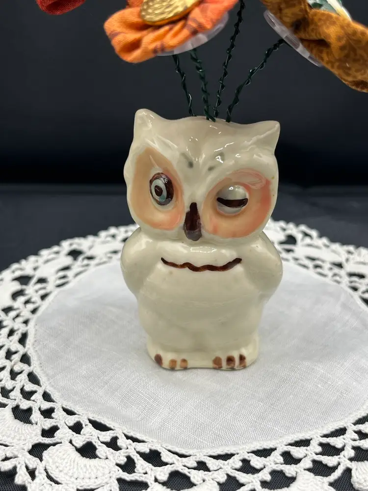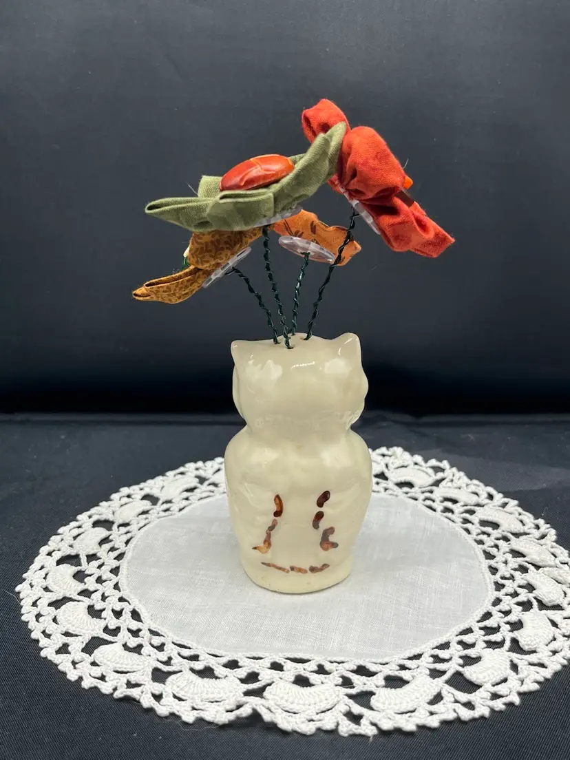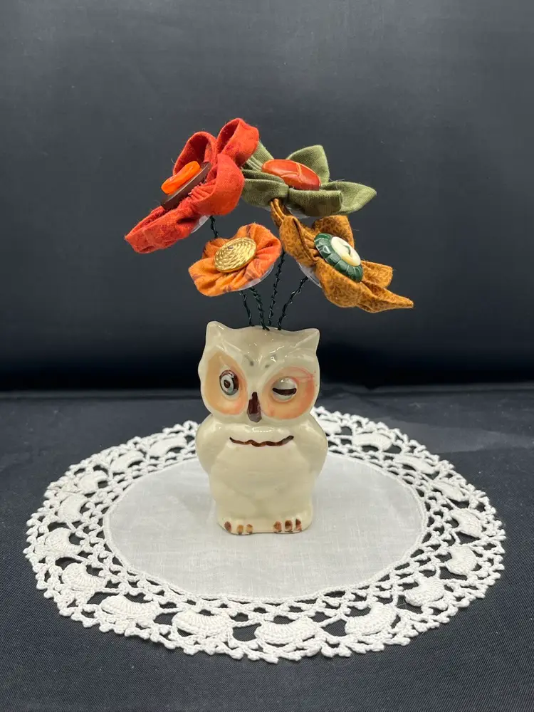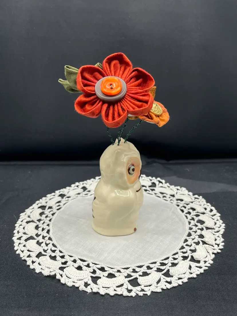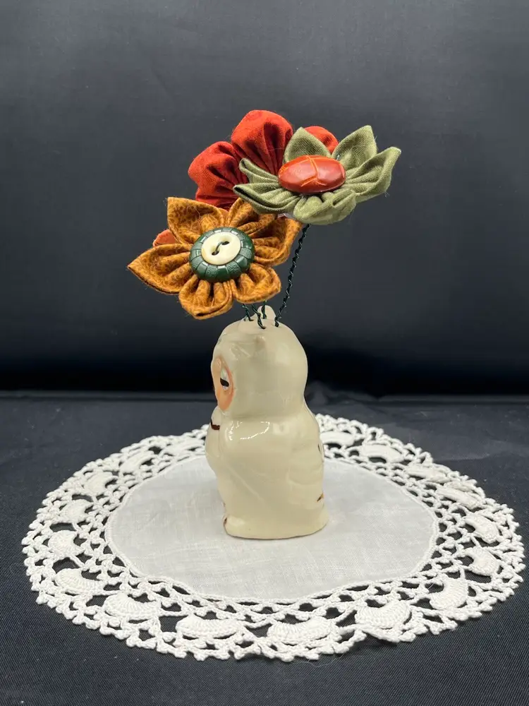 Hand sewn fabric flowers with vintage buttons arranged in ceramic winking owl shaker.