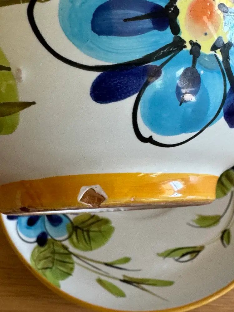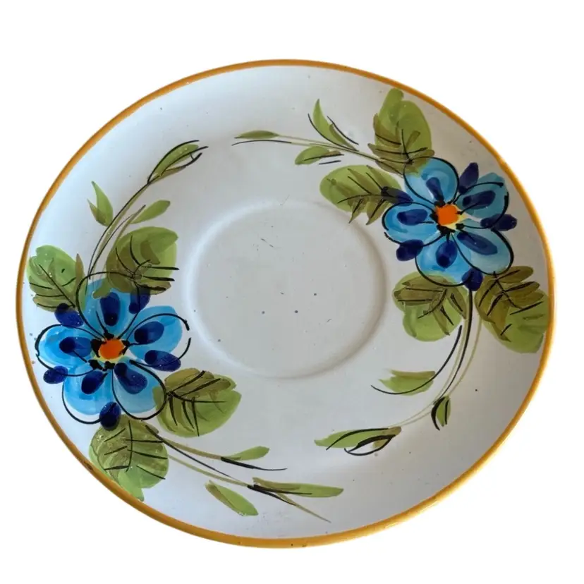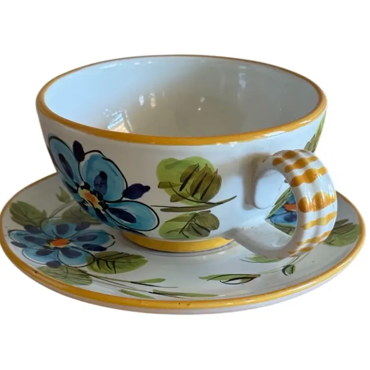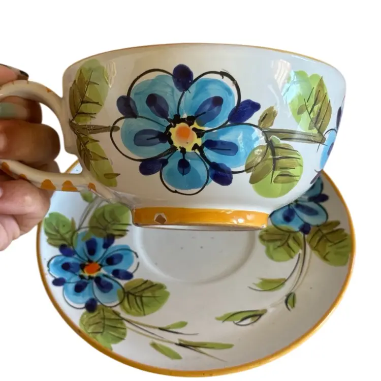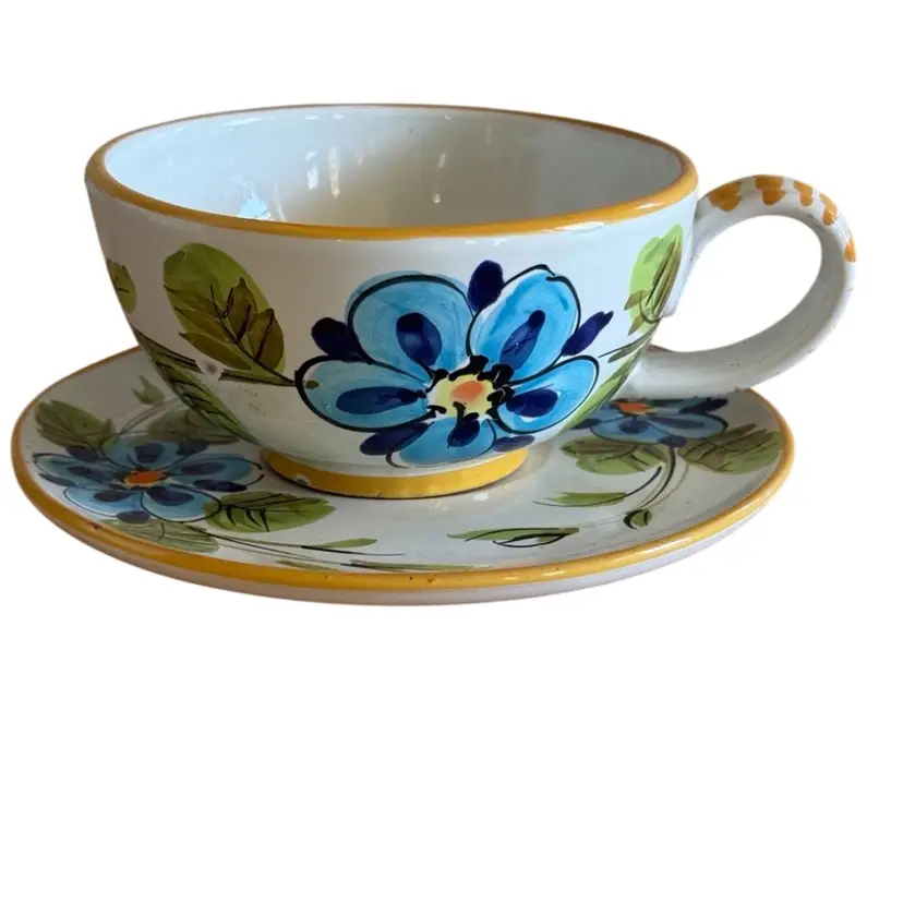 Made In Italy, Large Mug And Saucer, Floral Blue has one chip at the base of the cup no other damage Soup cup