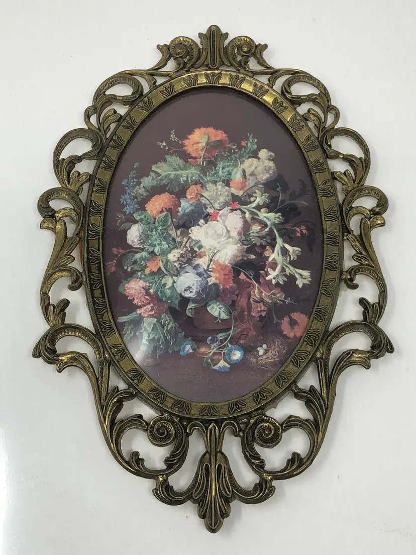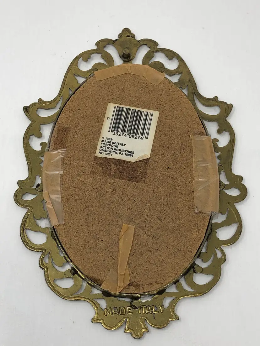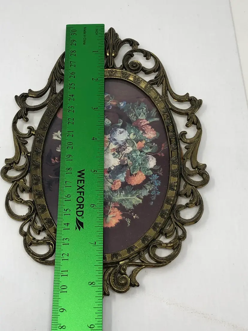 8" x 5" oval metal frame with floral image behind glass. Stamped made in Italy with original label. Picture is loose in the frame and has added tape for stability.