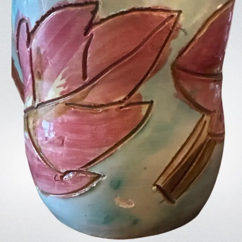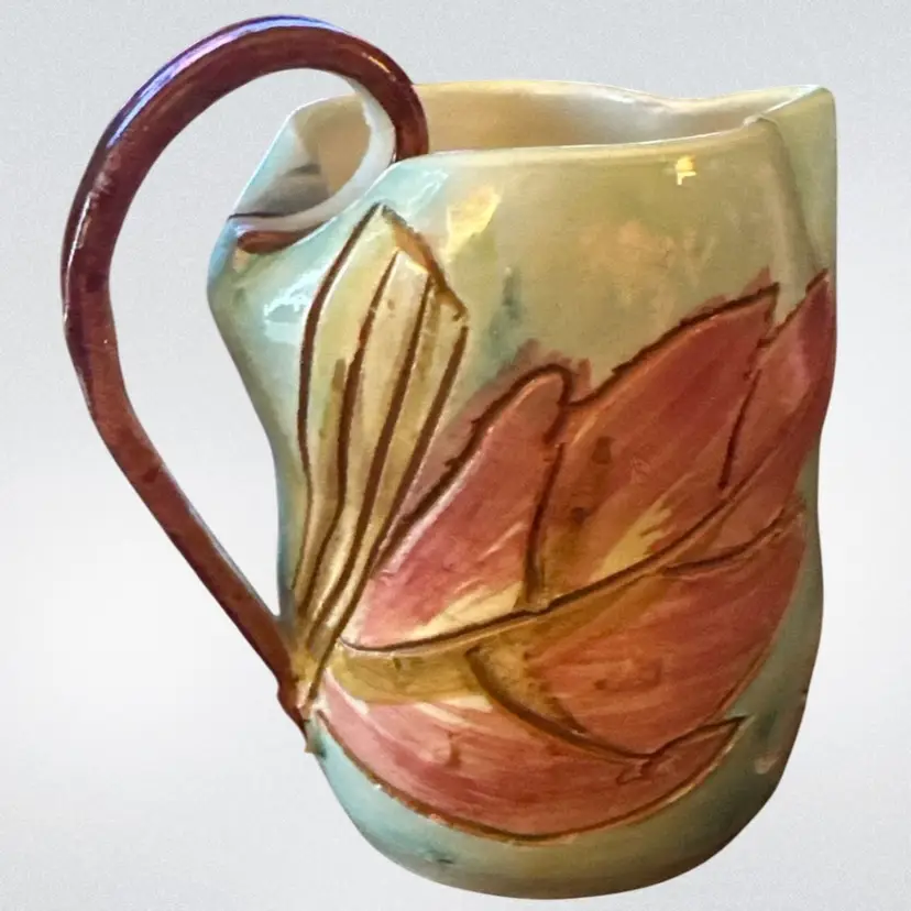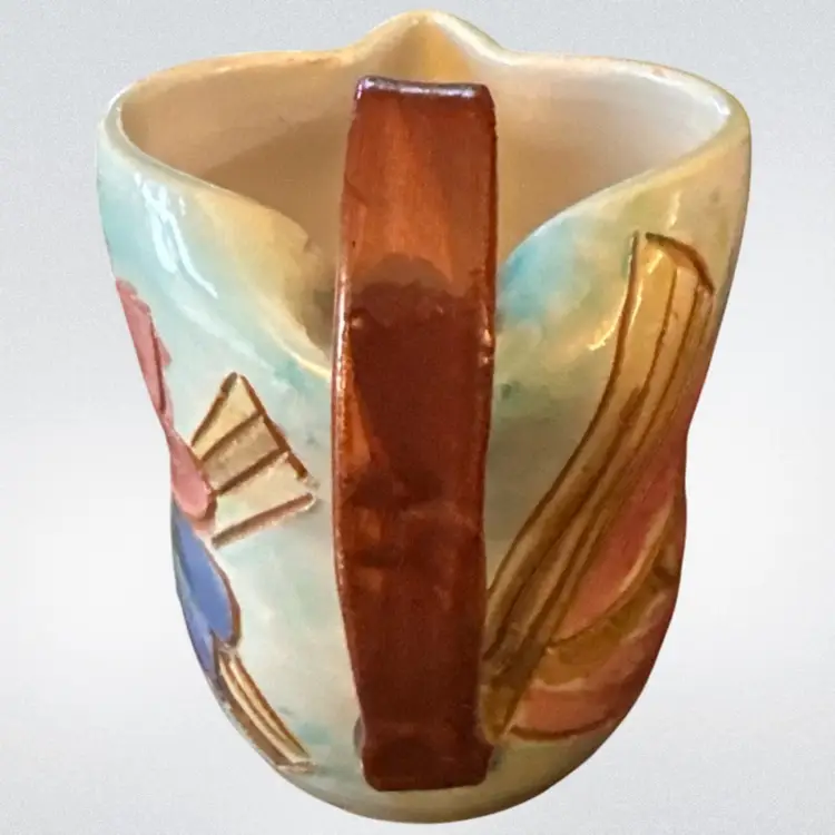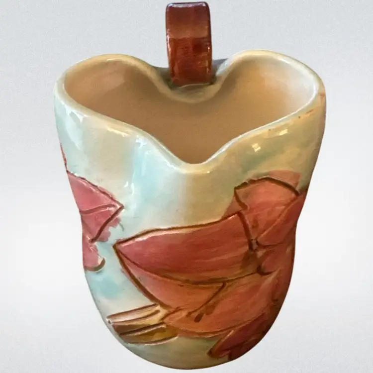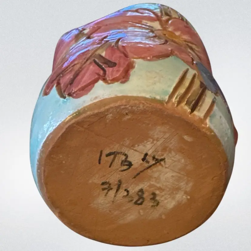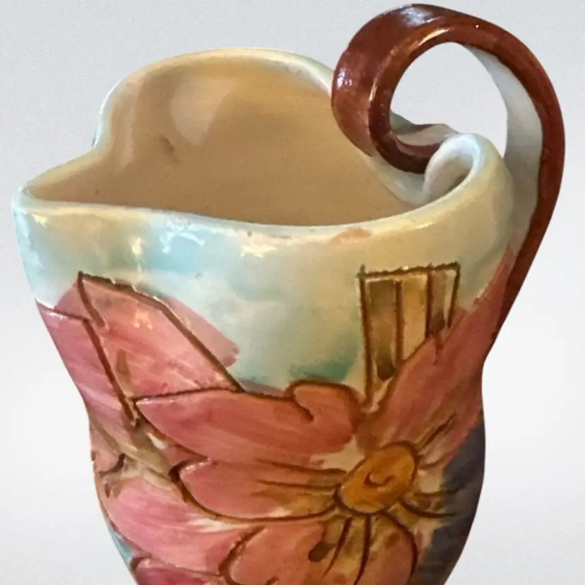 This vintage ceramic art pottery pitcher, hand made in Italy, features a round shape with a floral pattern in multicolor. Hand-painted and signed and numbered 7/383 by the artist, this pitcher stands at 4.5” tall with a diameter of 3.25 inches. The production style is hand thrown art pottery,the care instructions recommend hand washing. No chips, cracks. One small blemish, see last picture.