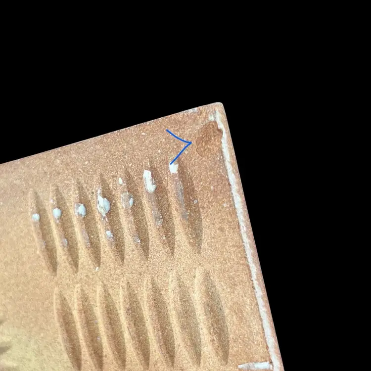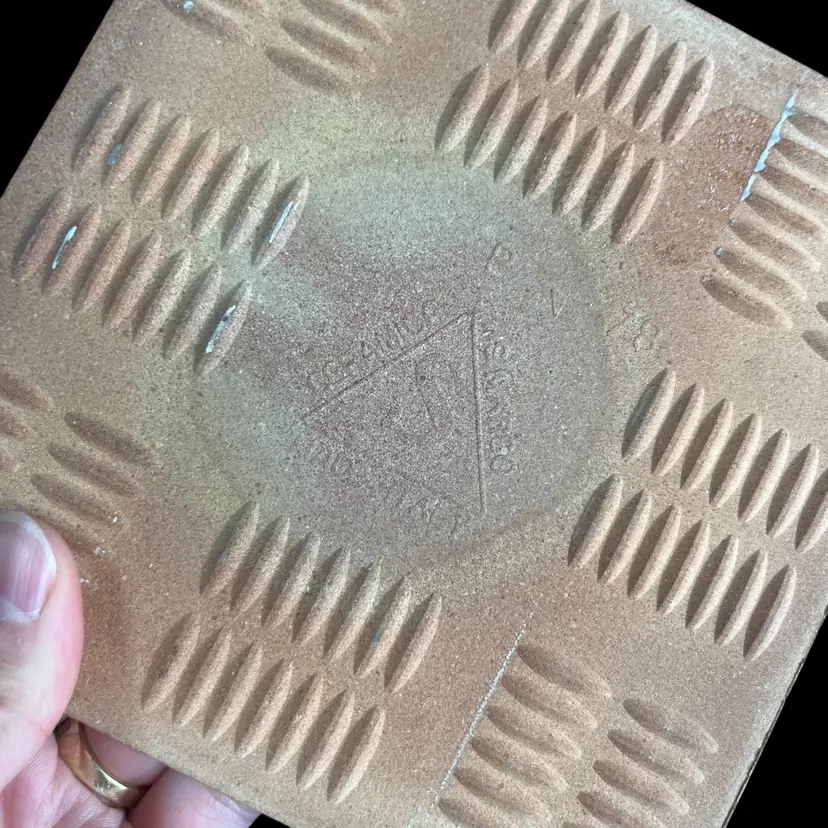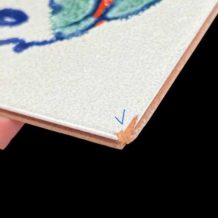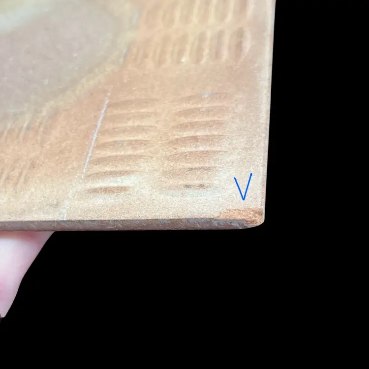 Approximately 5 7/8” square. No cracks. Please see last three photos to show chips. One is on front and back side of lower left corner. One is on backside of upper corner.
